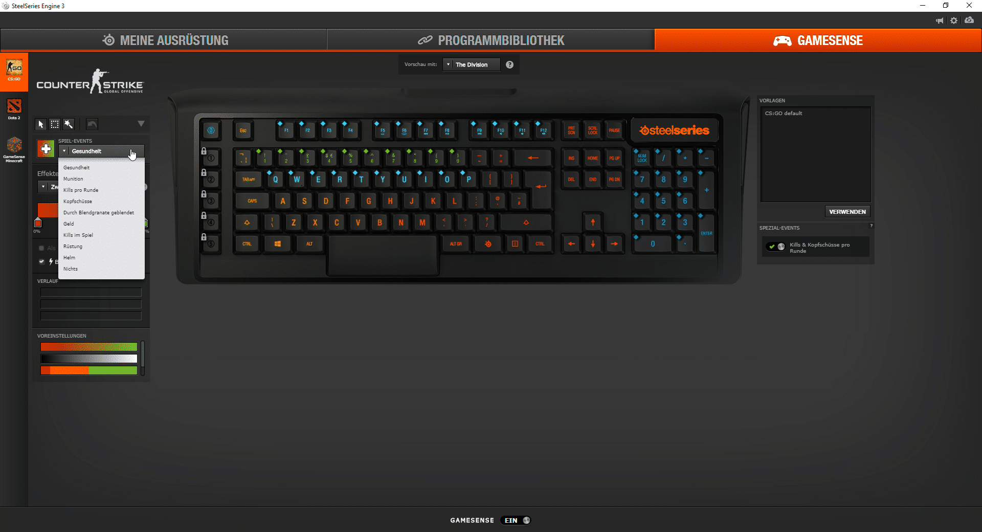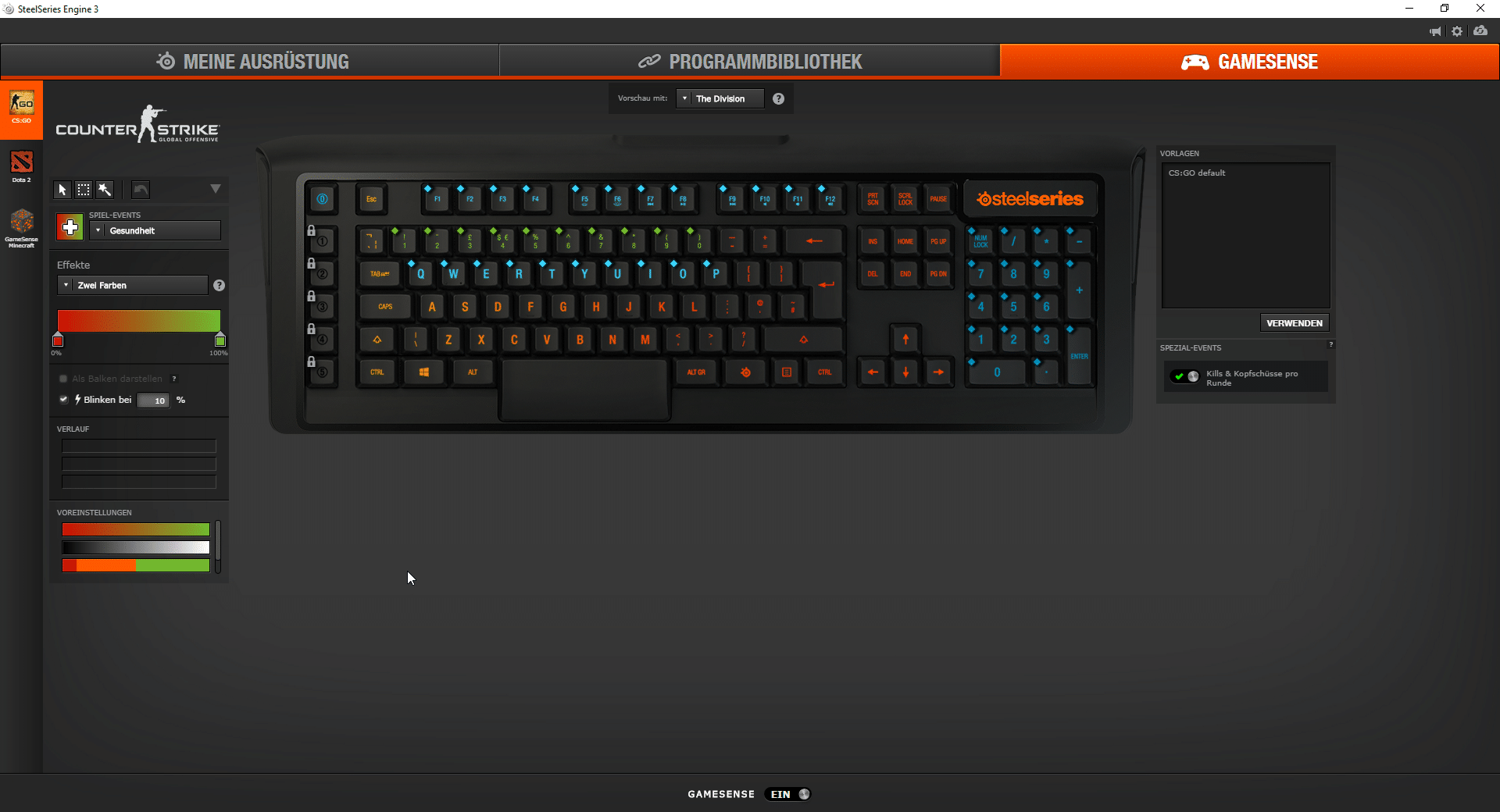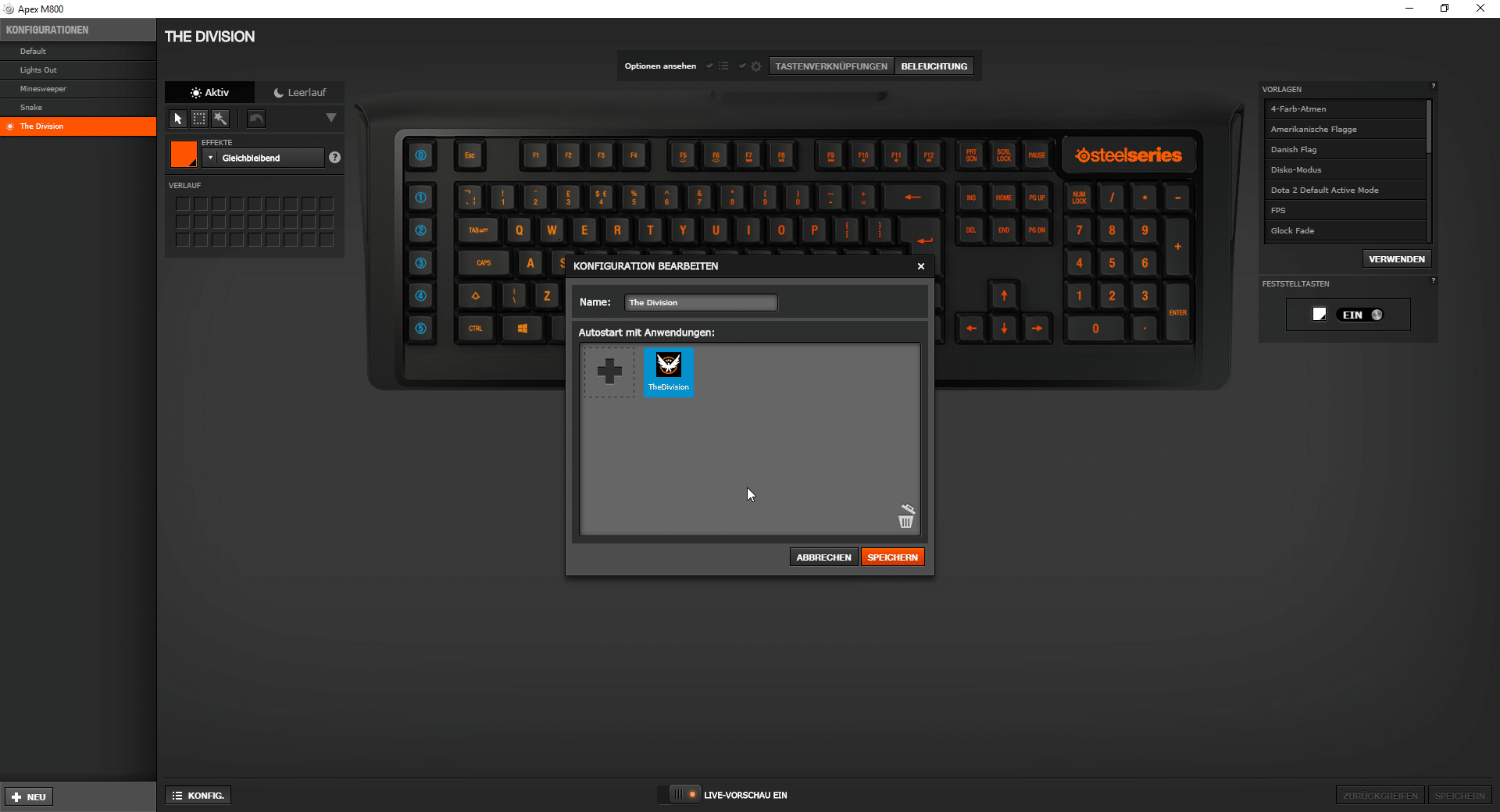 Ein weiteres nettes Feature ist die Spielerkennung. Die Software erkennt, welches Game gestartet wurde und wählt komplett automatisch das dafür festgelegte Profil. Gerade für den Fall, dass ihr mehrere Profile angepasst habt, ist das extrem praktisch! Eine begrenzte Anzahl von Profilen gibt es bei der Apex M800 nicht. Ihr könnt also für jede Anwendung auf eurem Rechner ein eigenes Profil anlegen.