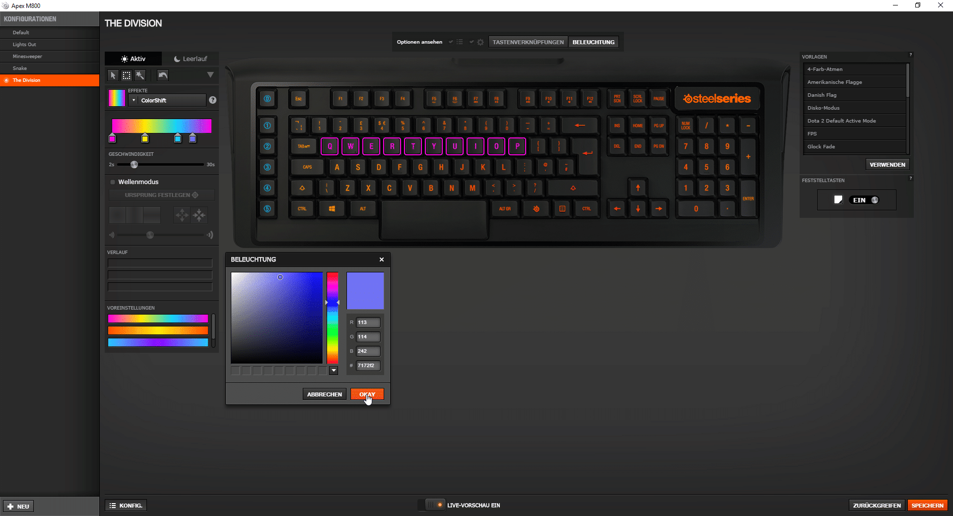 Über den Reiter „Beleuchtung“ könnt ihr dann eurer Kreativität freien Lauf lassen! Ihr könnt jede einzelne Taste individuell beleuchten, die Reaktionsfarbe und -zeit nach dem Drücken der Taste einstellen oder einfach vorgefertigte Beleuchtungen einstellen. Beispielsweise gibt es Voreinstellungen für MOBA- oder MMO-Spiele, natürlich werden lediglich die „Standardtasten“ für einen bessere Überblick beleuchtet. Diese Einstellungen können als sozusagen als Vorlage verwendet werden.