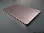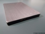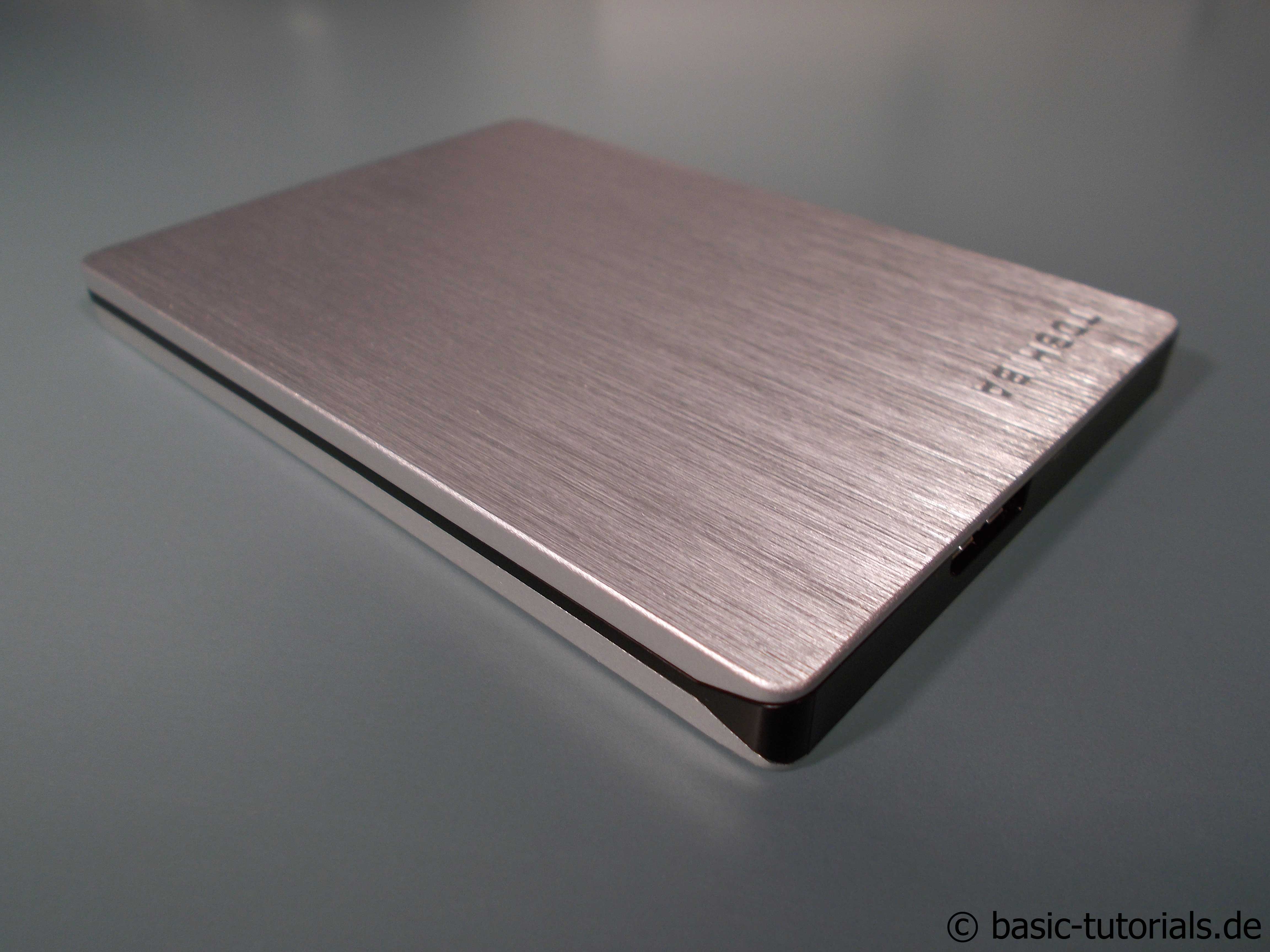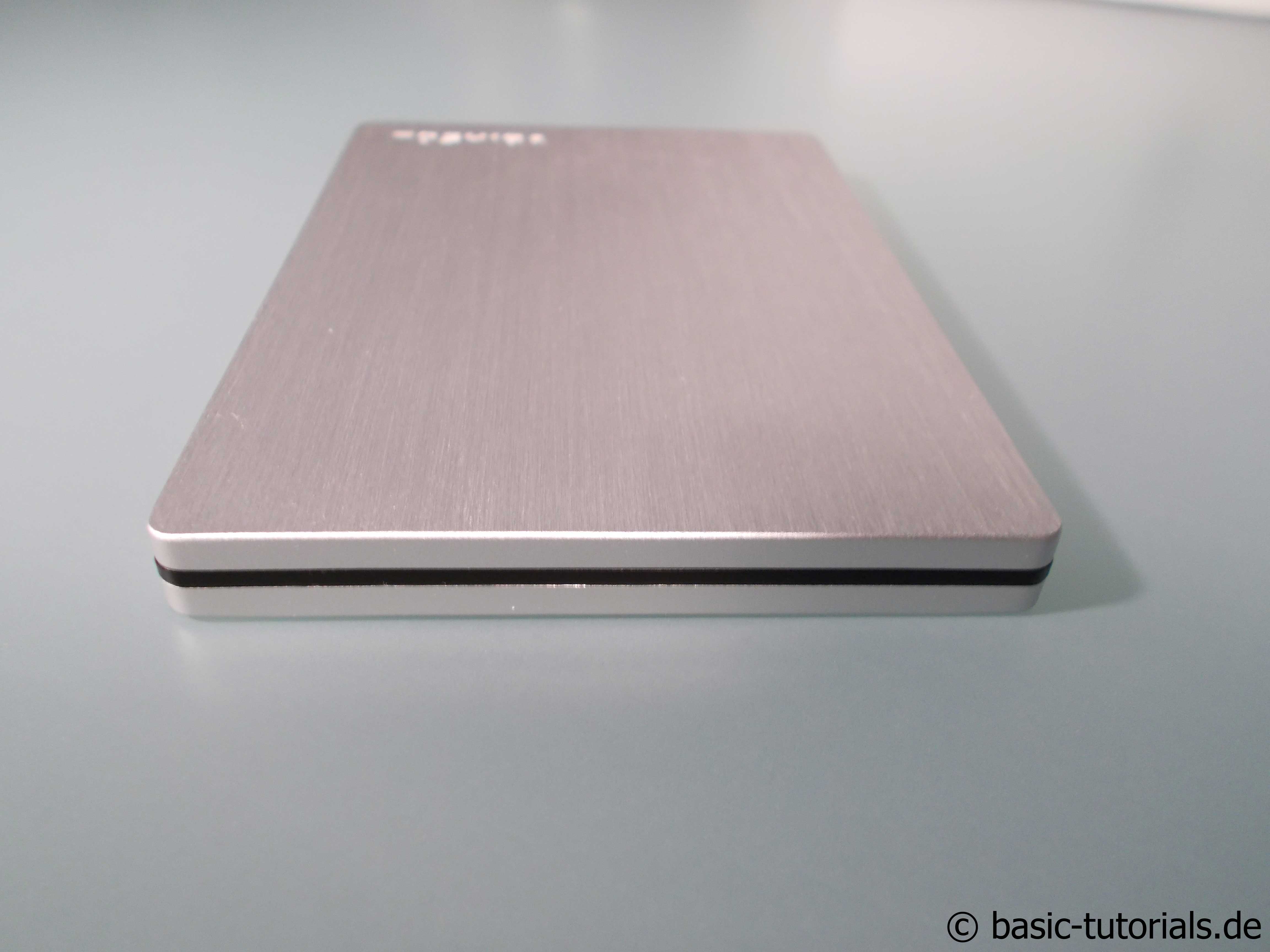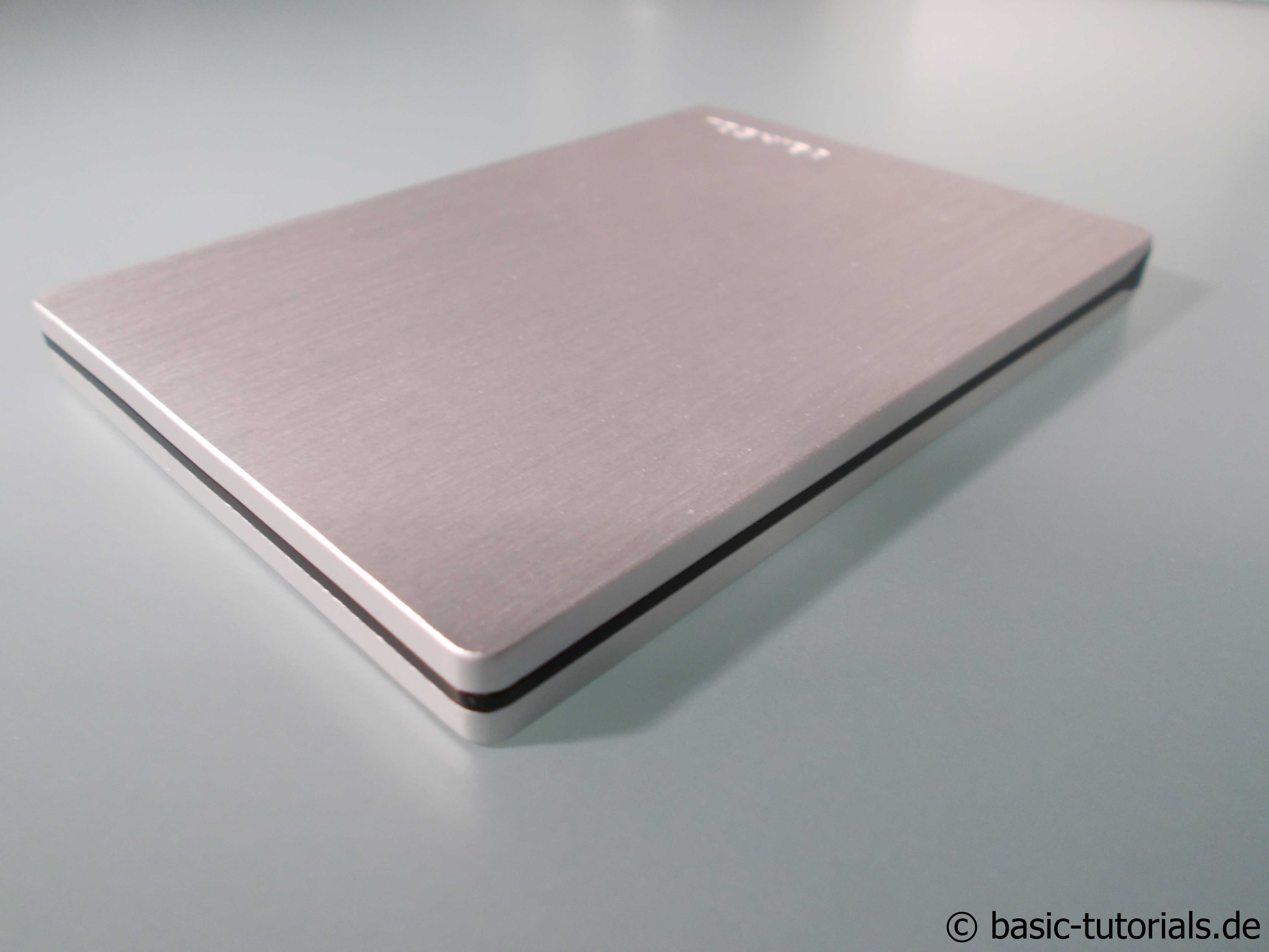 Wie man anhand der Bilder bereits erkennt, besteht das Gehäuse zum größten Teil aus gebürstetem Aluminium. Das Modell ist jedoch auch in anderen Farben wie etwa Schwarz erhältlich. Bei unserem Modell ist klar der schwarze Streifen erkennbar, der um das ganze Gerät geht. Dieser gibt der Festplatte ein gewisses extra und macht sie zum Hingucker. An der Verarbeitung gibt es nichts zu meckern, es gibt keine scharfen Kanten und auch zwischen den verschiedenen Gehäuseteilen ist kein kleiner Ritz oder ähnliches zu finden, das Gehäuse ist also fest verschlossen.