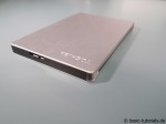 Das Gehäuse hat lediglich eine Höhe von 9 Millimetern, was man an dem Bild mit dem 1 Cent Stück auch sehr gut im Verhältnis sieht. Da sich die Festplatte in einem 2,5 Zoll Gehäuse befindet, ist die Größe inklusiv der Höhe mit der einer SSD-Festplatte zu vergleichen. Kleiner geht es zumindest im Festplattenbereich zur Zeit also noch nicht. In Maßen sind das 10,7cm x 7,5cm x 0,9cm Größe bei einem Gewicht von 231 Gramm. Die STOR.E Slim wiegt also auch fast nichts, bei der Größe ja auch kein Wunder. 😉
