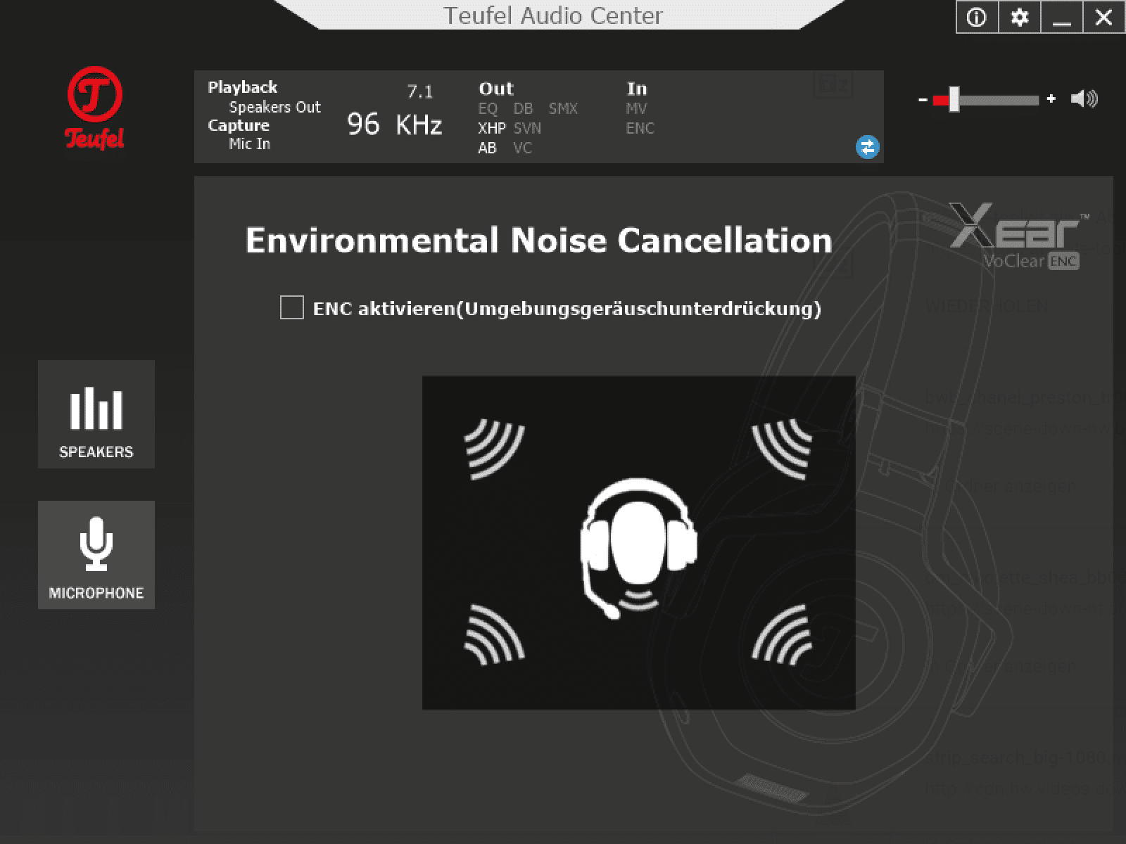 Das Mikrofon besteht eigentlich aus drei Mikrofonen. Zwei sitzen im Mikrofonarm, eines direkt an der Hörmuschel. Teufel will damit kristallklare Stimmaufnahmen ohne Echos erzielen. Das gelingt erstaunlich gut und ist schon fast nicht mehr vergleichbar mit Headsets anderer Hersteller. Nutzt man das Teufel Audio Center nicht, werden jedoch alle Umgebungsgeräusche mit aufgenommen. Es lohnt sich am PC also das Teufel Audio Center zu nutzen und dort die Unterdrückung der Umgebungsgeräusche über die Option „Environmental Noise Cancellation“ zu aktivieren.