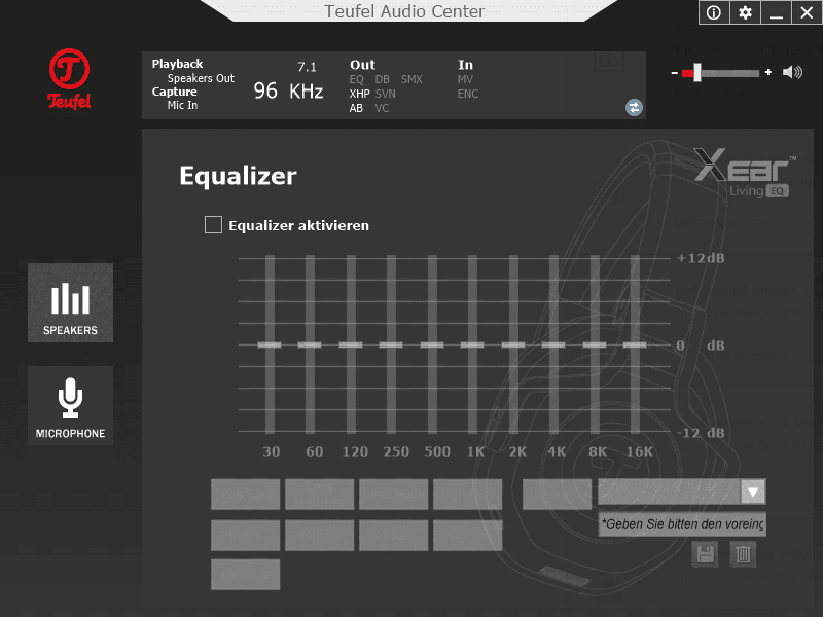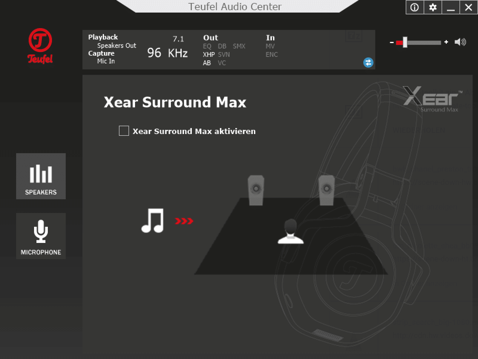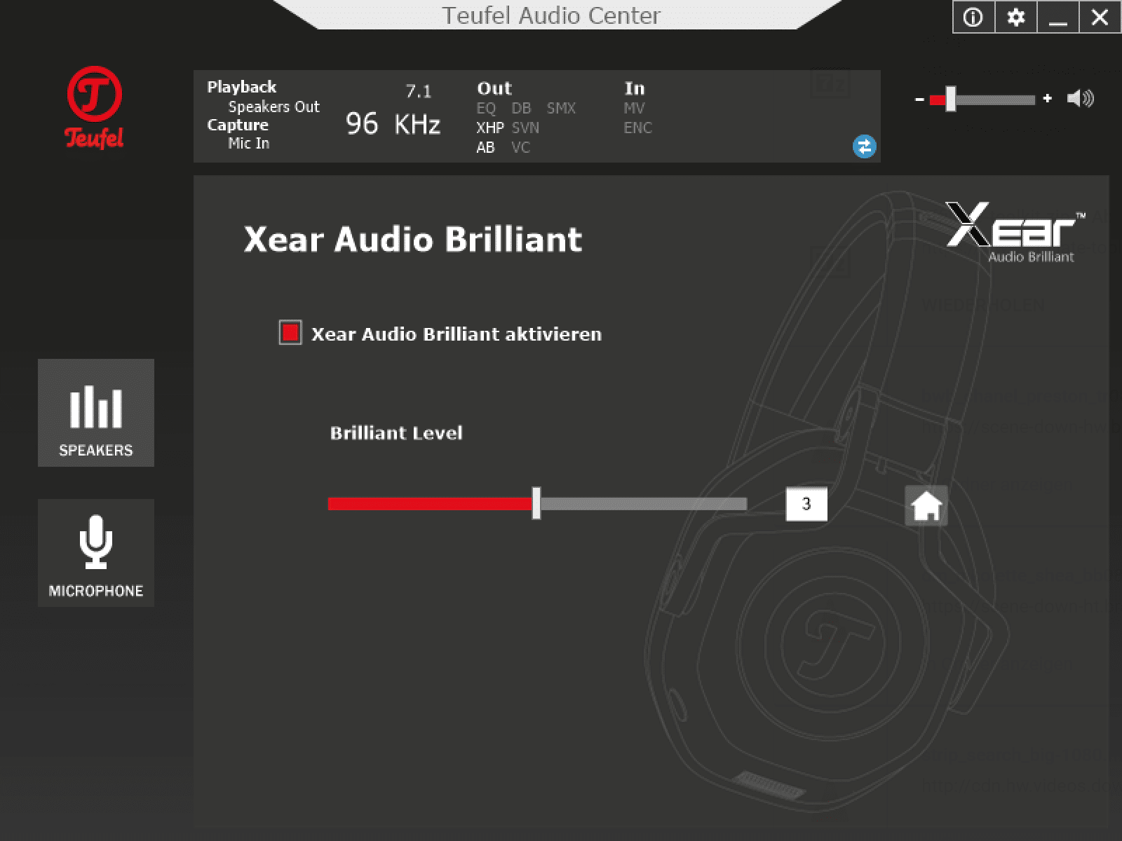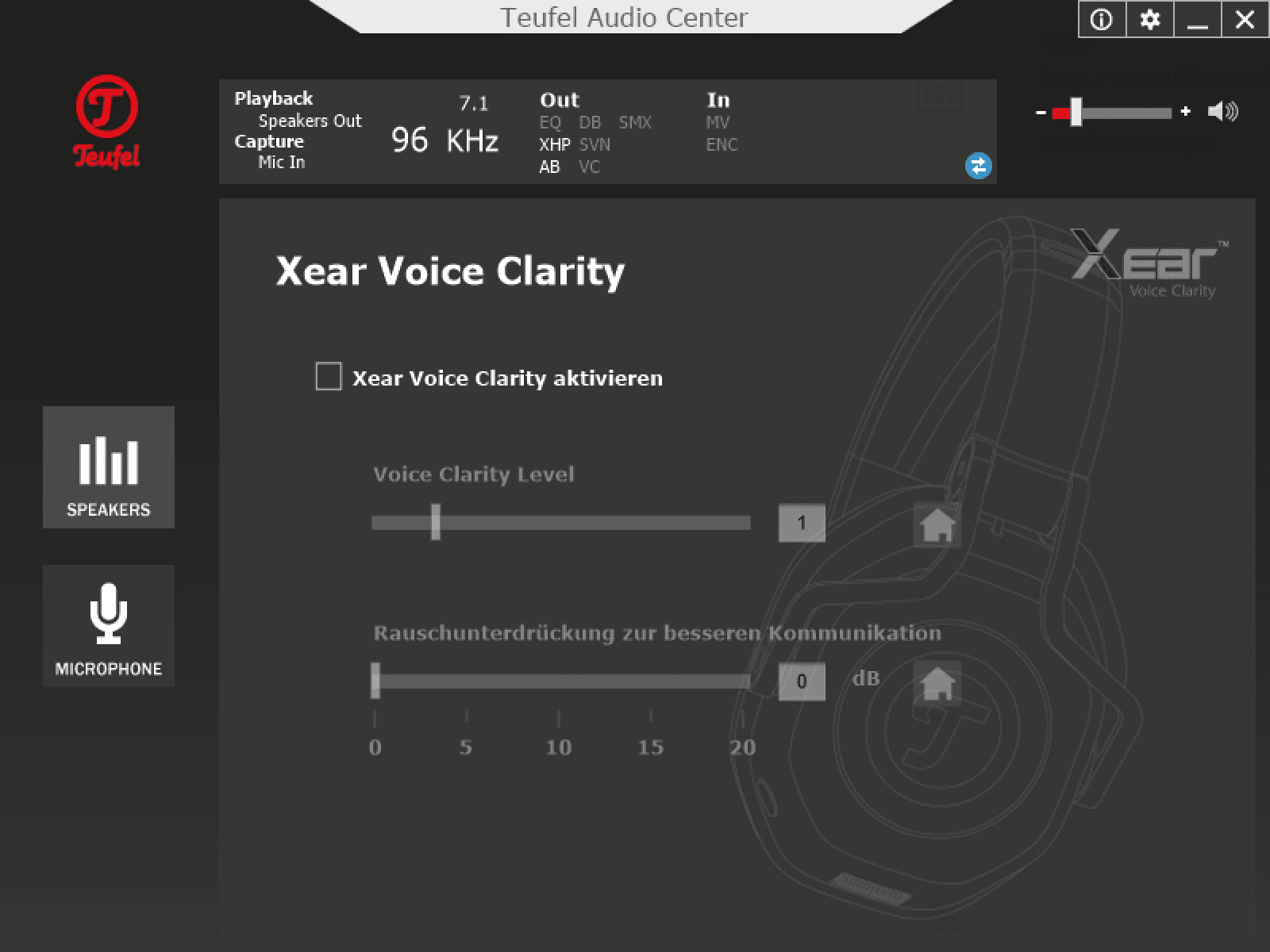 Bei der Soundqualität des Teufel Cage muss zwischen USB und Klinke differenziert werden. Am PC per USB kann zusätzlich das Teufel Audio Center genutzt werden. Hier setzt Teufel auf Software der Firma Xear. Neben einem Equalizier kann ebenso die Abtastrate eingestellt werden. Durch Xear Surround Headphone, Xear Audio Brilliant, Xear Dynamic Bass, Xear Smart Volume, Xear Voice Clarity sowie Xear Surround Max soll der Sound weiter verbessert werden. Nicht alle Funktionen würde ich als Verbesserung bezeichnen, besonders lohnenswert sind Xear Surround Headphone (für virtuellen Raumklang) und Xear Audio Brilliant. Hier sollte jeder selber ausprobieren, welches Feature aktiv sein soll. Der Raumklang sorgt zwar für einen besseren Sound, verhilft jedoch nicht unbedingt zu einer besseren Gegnerortung.
