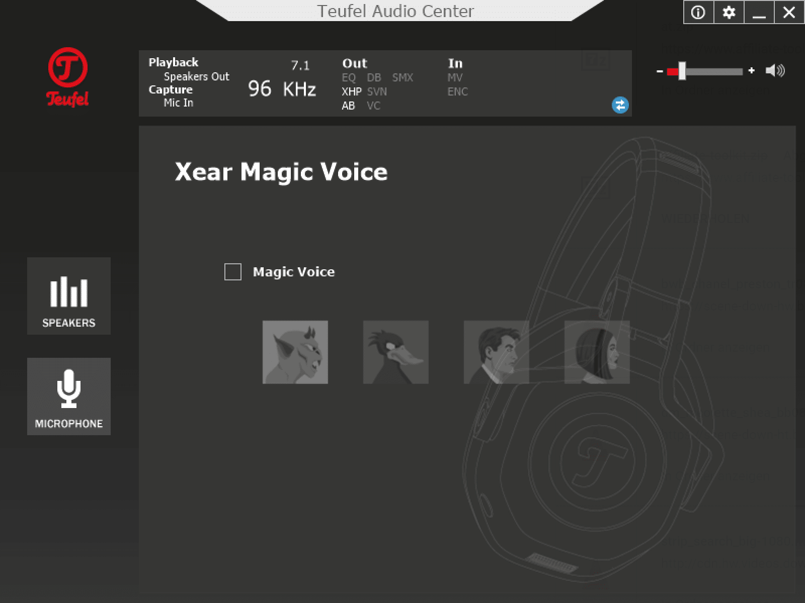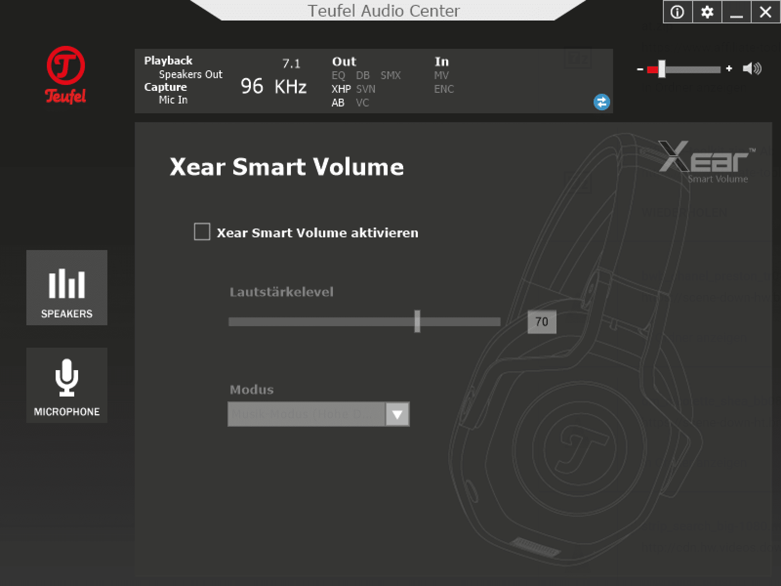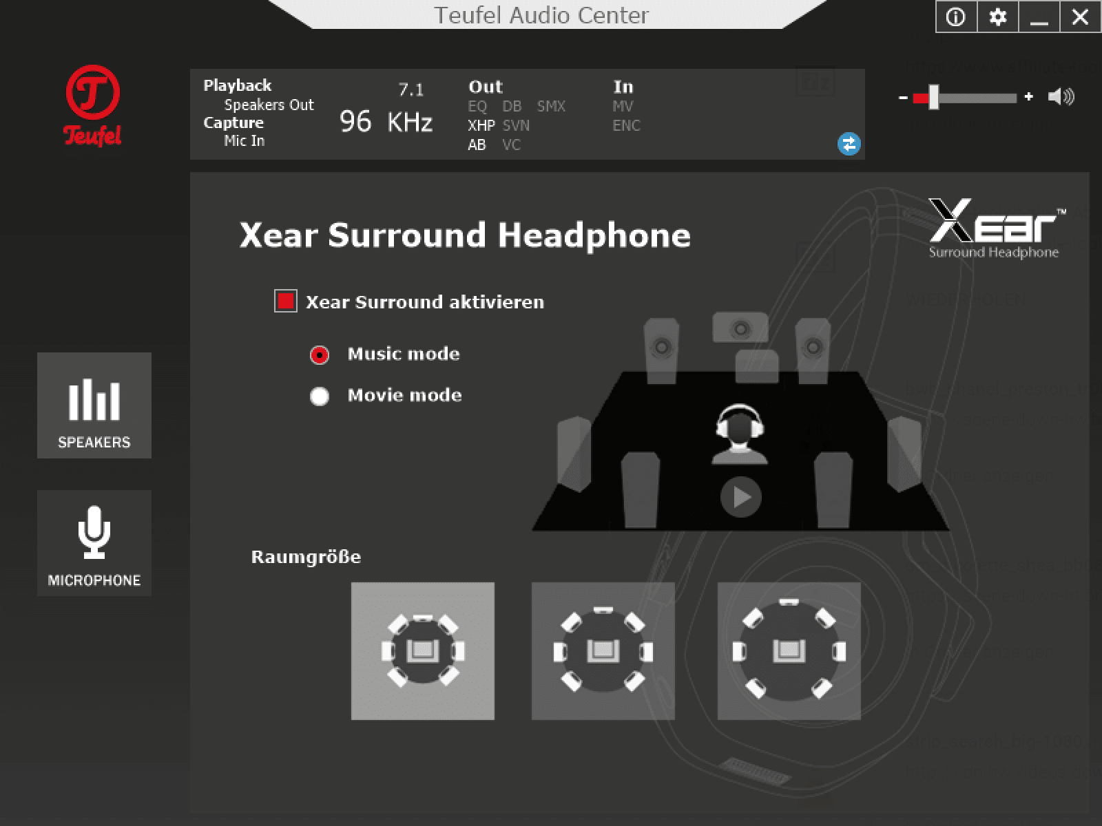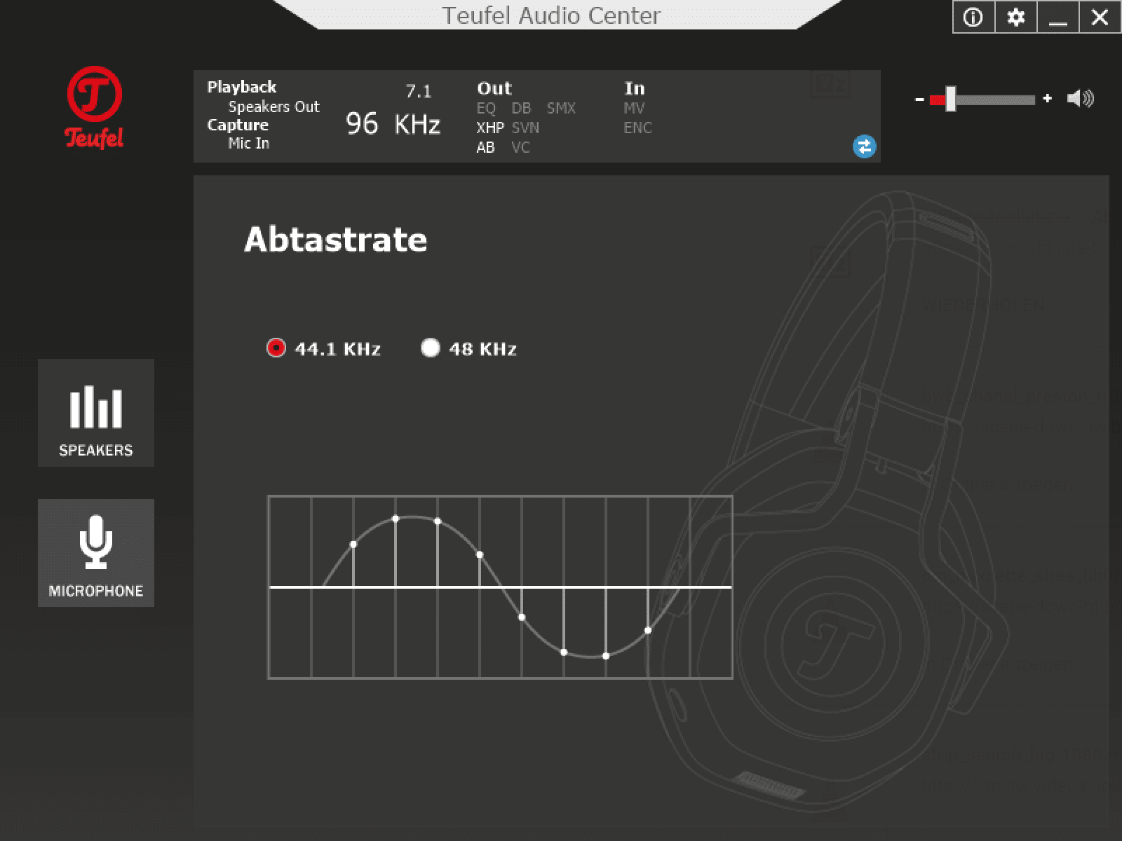 Bei der Soundqualität des Teufel Cage muss zwischen USB und Klinke differenziert werden. Am PC per USB kann zusätzlich das Teufel Audio Center genutzt werden. Hier setzt Teufel auf Software der Firma Xear. Neben einem Equalizier kann ebenso die Abtastrate eingestellt werden. Durch Xear Surround Headphone, Xear Audio Brilliant, Xear Dynamic Bass, Xear Smart Volume, Xear Voice Clarity sowie Xear Surround Max soll der Sound weiter verbessert werden. Nicht alle Funktionen würde ich als Verbesserung bezeichnen, besonders lohnenswert sind Xear Surround Headphone (für virtuellen Raumklang) und Xear Audio Brilliant. Hier sollte jeder selber ausprobieren, welches Feature aktiv sein soll. Der Raumklang sorgt zwar für einen besseren Sound, verhilft jedoch nicht unbedingt zu einer besseren Gegnerortung.