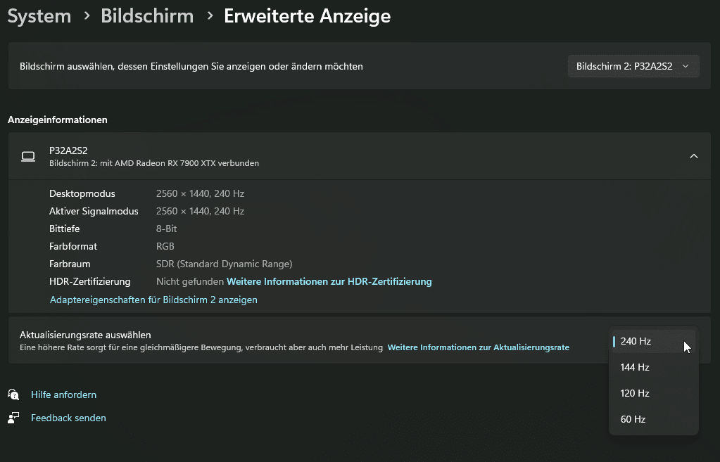 Was die Bildwiederholrate betrifft, so erreicht diese über das mitgelieferte Displayport-Kabel und den gleichnamigen Anschluss bis zu 240 Hz. Dank HDMI 2.1 stehen solche Auflösungen inklusive Bildwiederholrate jetzt auch an den HDMI-Ausgängen zur Verfügung. Wem das zu viel ist, der kann die Aktualisierungsrate in Zwischenschritten auf 144, 120 oder 60 Hz begrenzen. Für einen erweiterten Dynamikumfang bzw. ein kontrastreicheres und farbintensiveres Bild steht mit dem TITAN ARMY P32A2S2 HDR400 zur Verfügung. Voraussetzung ist allerdings, dass dies im OSD separat eingeschaltet wird, andernfalls erkennt Windows das HDR-Feature nicht an.