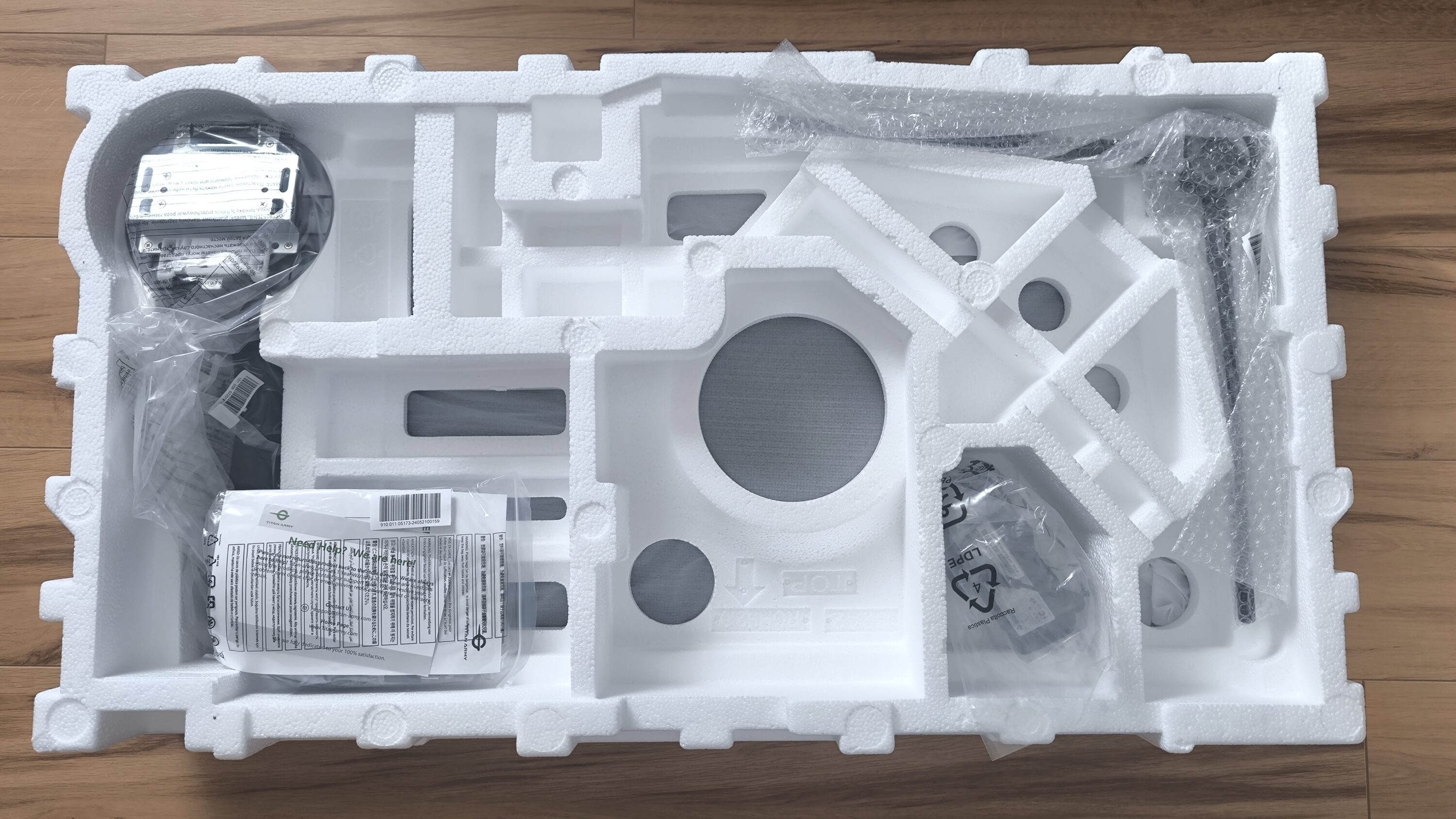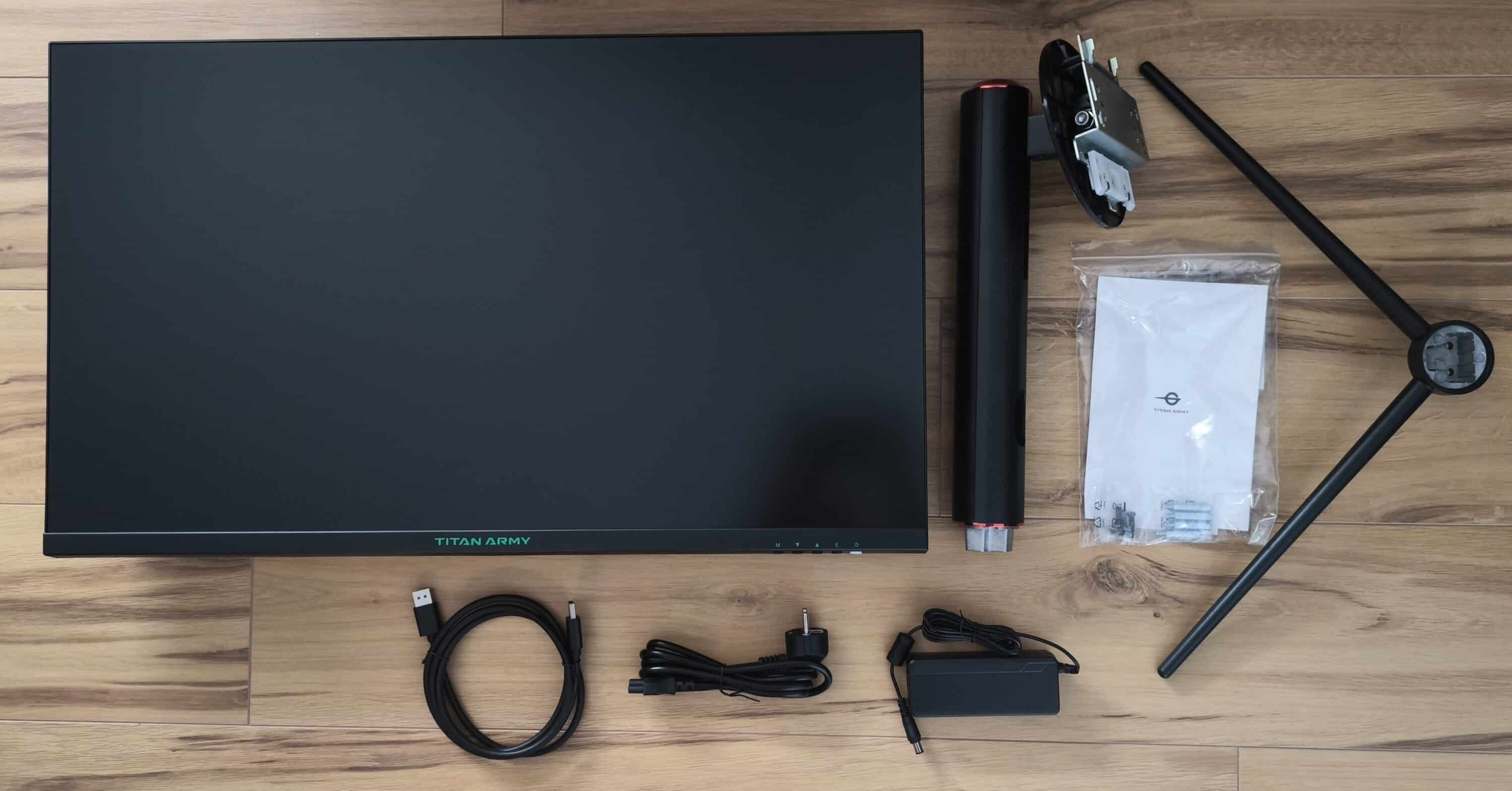 Der TITAN ARMY P32A2S2 wird sauber verpackt in einem länglichen Karton geliefert, welcher mit ausreichend Schaumstoff den Packungsinhalt schützt. Neben dem großen 32 Zoll Monitor selbst zählt auch der Monitorständer, bestehend aus Standfuß und Basis, zum Lieferumfang. Ergänzend liegt ein Kabelset bei, welches aus einem Displayport-Kabel, dem Netzkabel sowie dem eigentlichen Netzteil besteht. Abgerundet wird der Lieferumfang durch die Bedienungsanleitung sowie ein Schraubenkit für den Monitorständer oder alternativ für eine Wandhalterung.