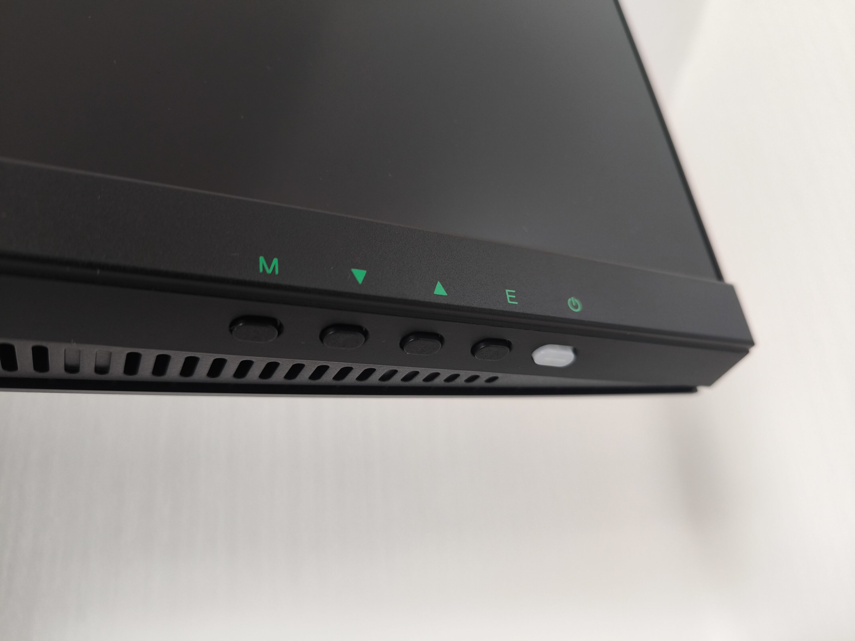 Die Bedienung und der Aufruf des OSD erfolgen über fünf Tasten am rechten unteren Rand des Monitors. Dazu dienen die Taste M zur Auswahl einer Funktion sowie die üblichen Pfeiltasten nach oben und unten. Die Navigation erfolgt über eine Zurück-Taste und ganz rechts findet sich der Knopf zum Ein- bzw. Ausschalten des Bildschirms. Letztere ist im Übrigen mit einer LED ausgestattet.