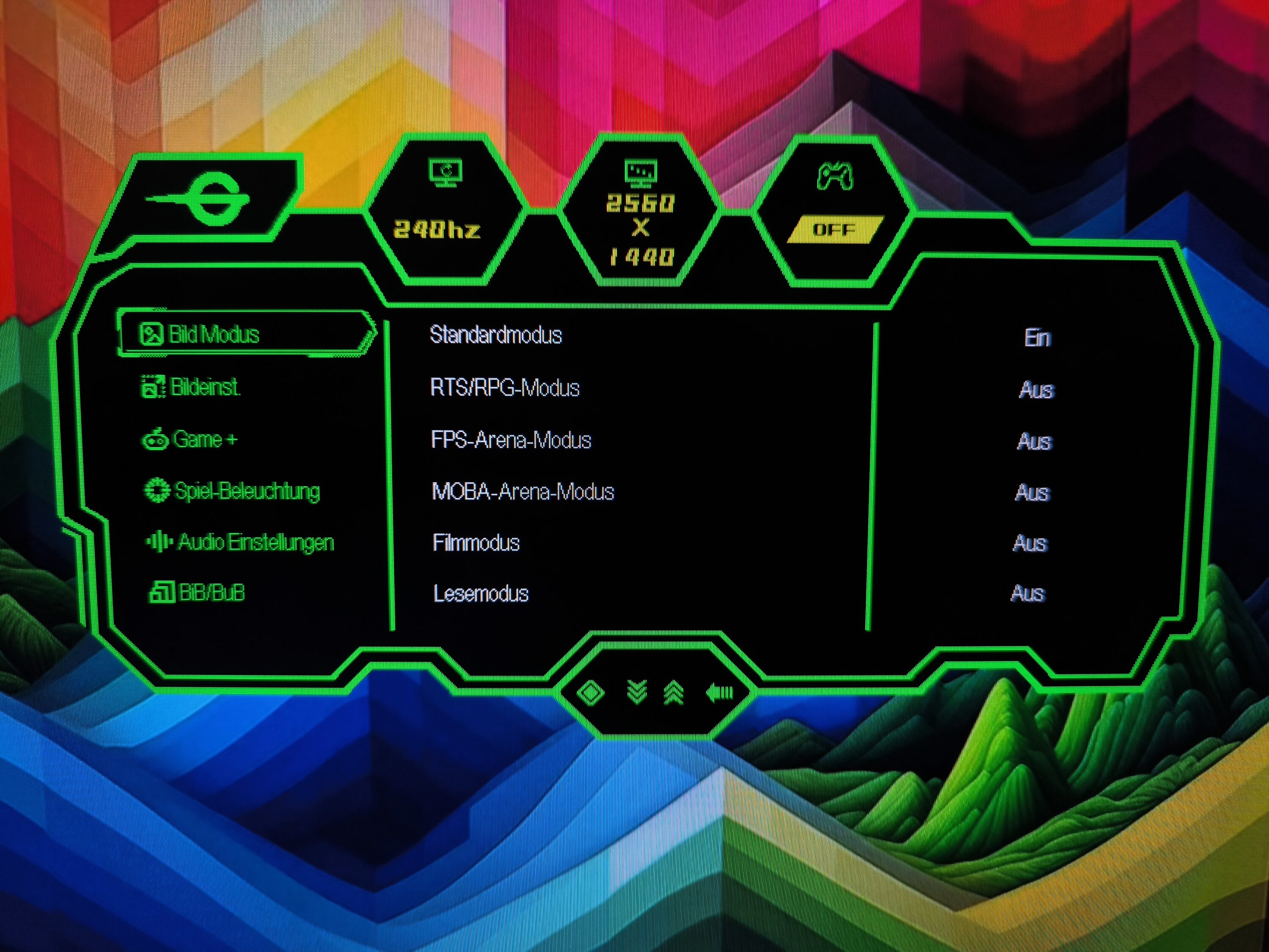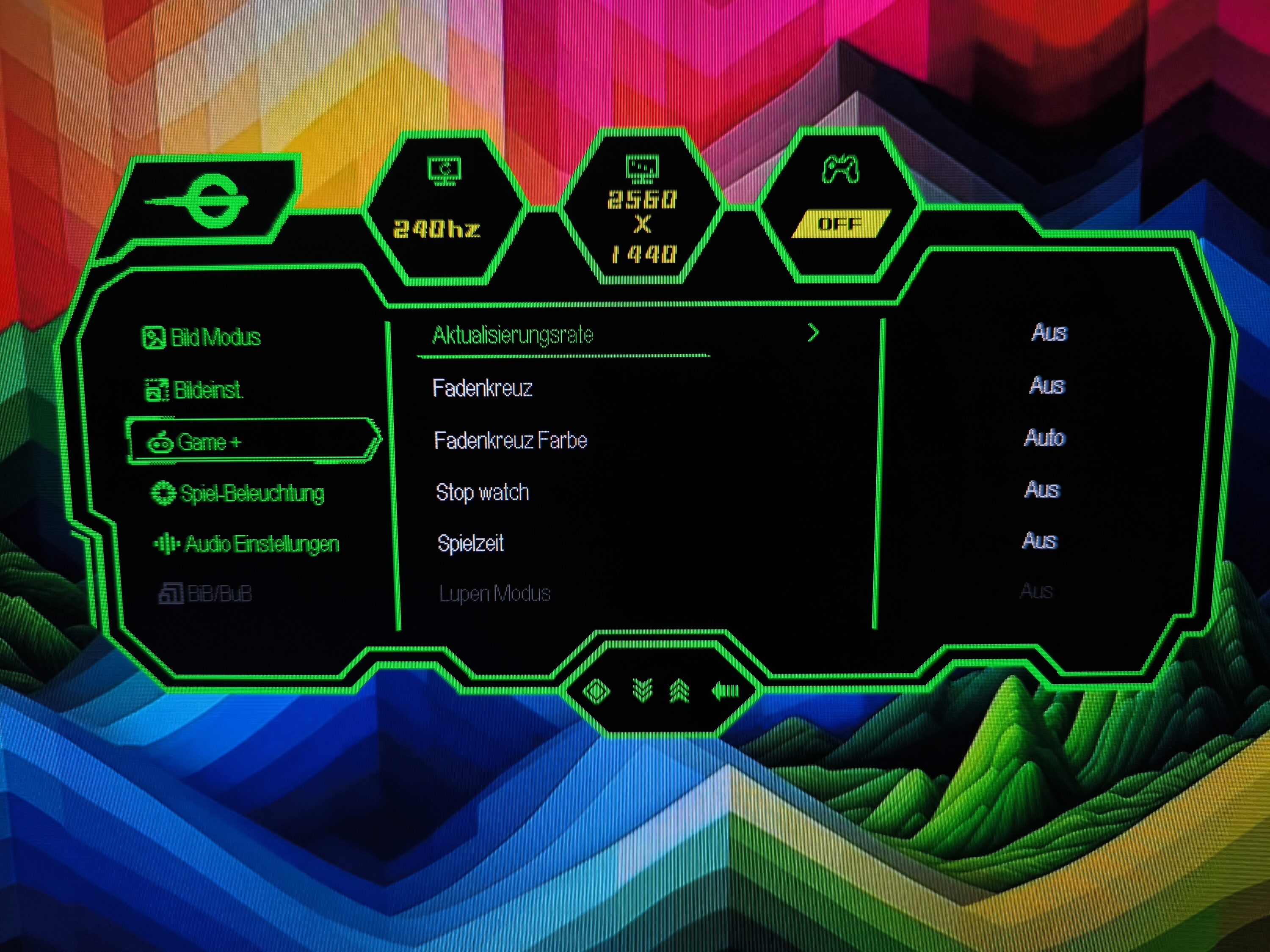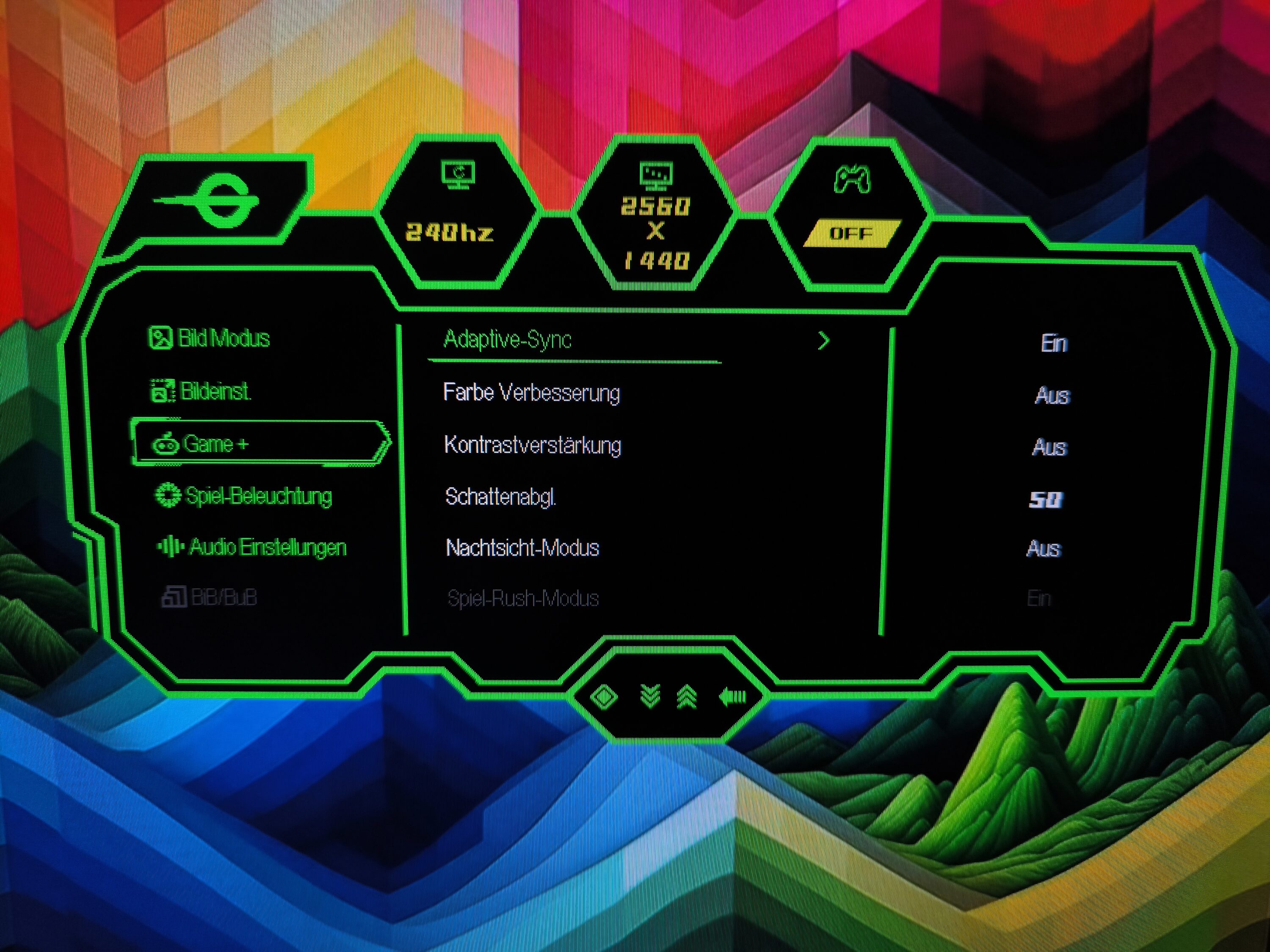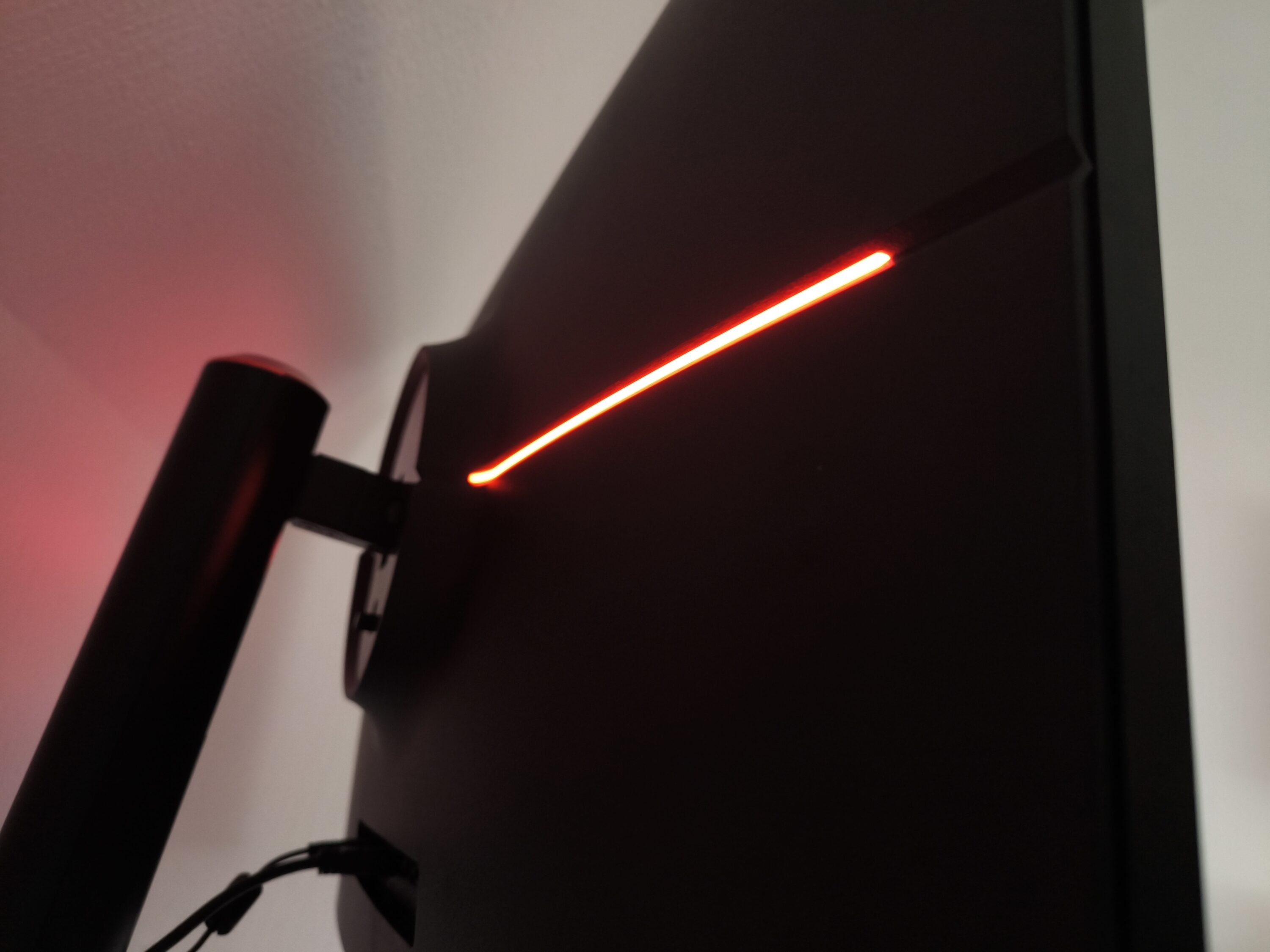 Etwaiges Tearing konnten wir nach Aktivierung von Adaptive-Sync nicht beobachten. Wie beim kleineren Modell sind die Spiele-Features je nach Genre wirklich sinnvoll. Bei düsteren Spielen lohnt sich wiederum die Nachbearbeitung für dunkle Szenen und auch die hauseigene Bildschärfung sowie Farbverbesserungen peppen das Bild optisch auf. Komplett ausreizen sollte man derartige Optionen aber nicht, da das Bild sonst künstlich wirkt. Ein einstellbarer Bereich im ersten Drittel des Schiebereglers ist aber durchaus zu empfehlen. Zur Hintergrundbeleuchtung lässt sich sagen, dass sie zwar für einen kurzen Moment cool ist. Nach einiger Zeit haben wir sie aber wieder ausgeschaltet, da es sich nur um ein nettes Gimmick handelt. Hier wäre ein vollwertiges Ambilight an den Außenkanten wie bei Fernsehern natürlich sinnvoller als nur ein schwacher Leuchtstreifen in der Mitte des Bildschirms.