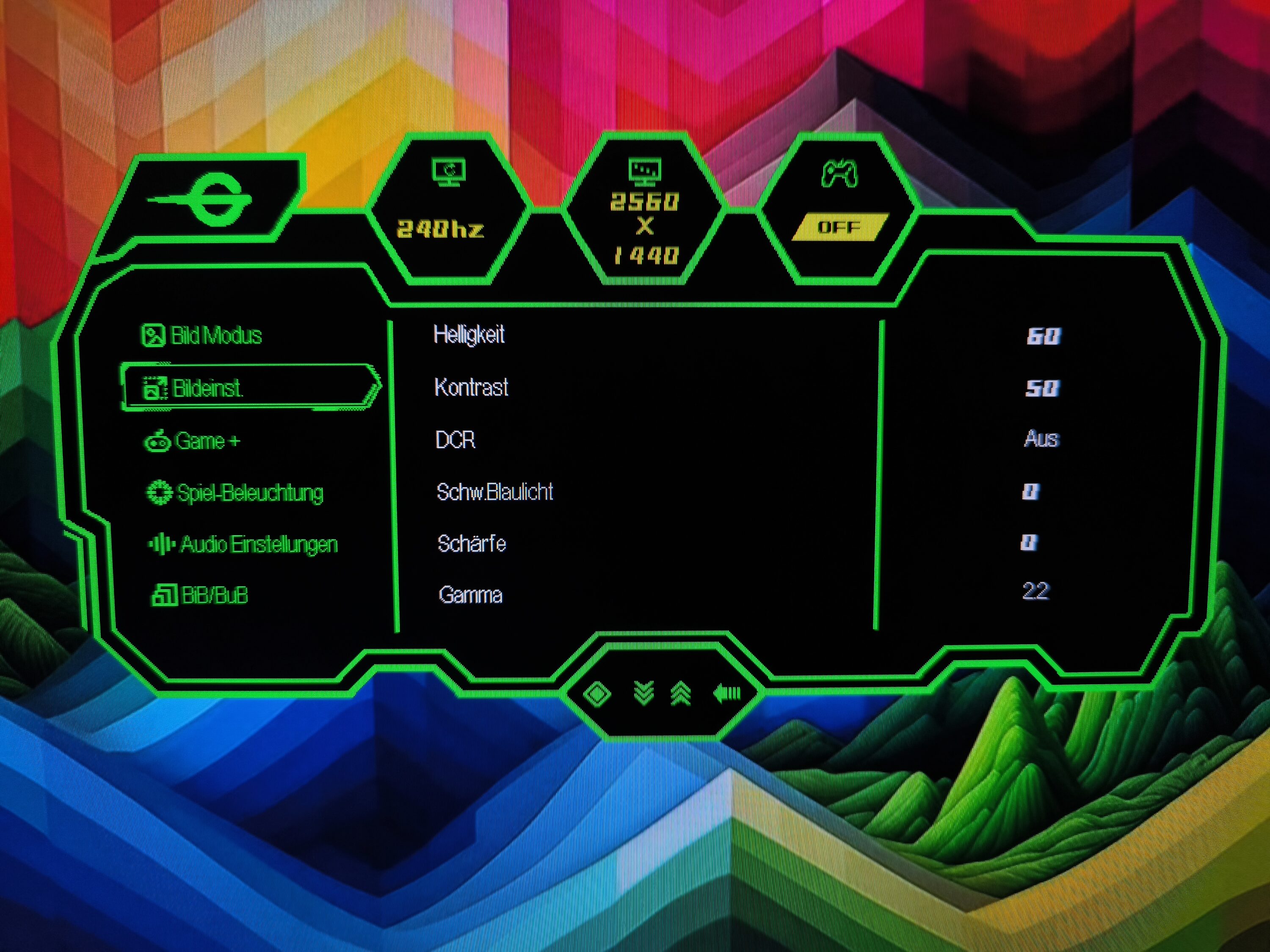 Mithilfe des OSD, sprich On-Screen-Display, hat man Zugriff auf erweiterte Funktionen des TITAN ARMY P32A2S2. Über den Reiter Bildmodus stehen z.B. mehrere Presets zur Auswahl, die sich in Kontrast, Helligkeit, Sättigung und Farbton sowie der Temperatur und dem Gammawert unterscheiden. Diese Parameter können natürlich beliebig angepasst werden, weshalb für jeden Wert ein Schieberegler zur Verfügung steht. Darüber hinaus bietet TITAN ARMY über weitere Menüpunkte individuelle Funktionen zur Bildverbesserung, die sich in einer Kontrastverstärkung, einem Nachtsichtmodus oder einer Farbverbesserung äußern. Daher sollte man sich vor allem bei der Einrichtung ein paar Minuten Zeit nehmen, um die einzelnen Punkte zu erkunden.