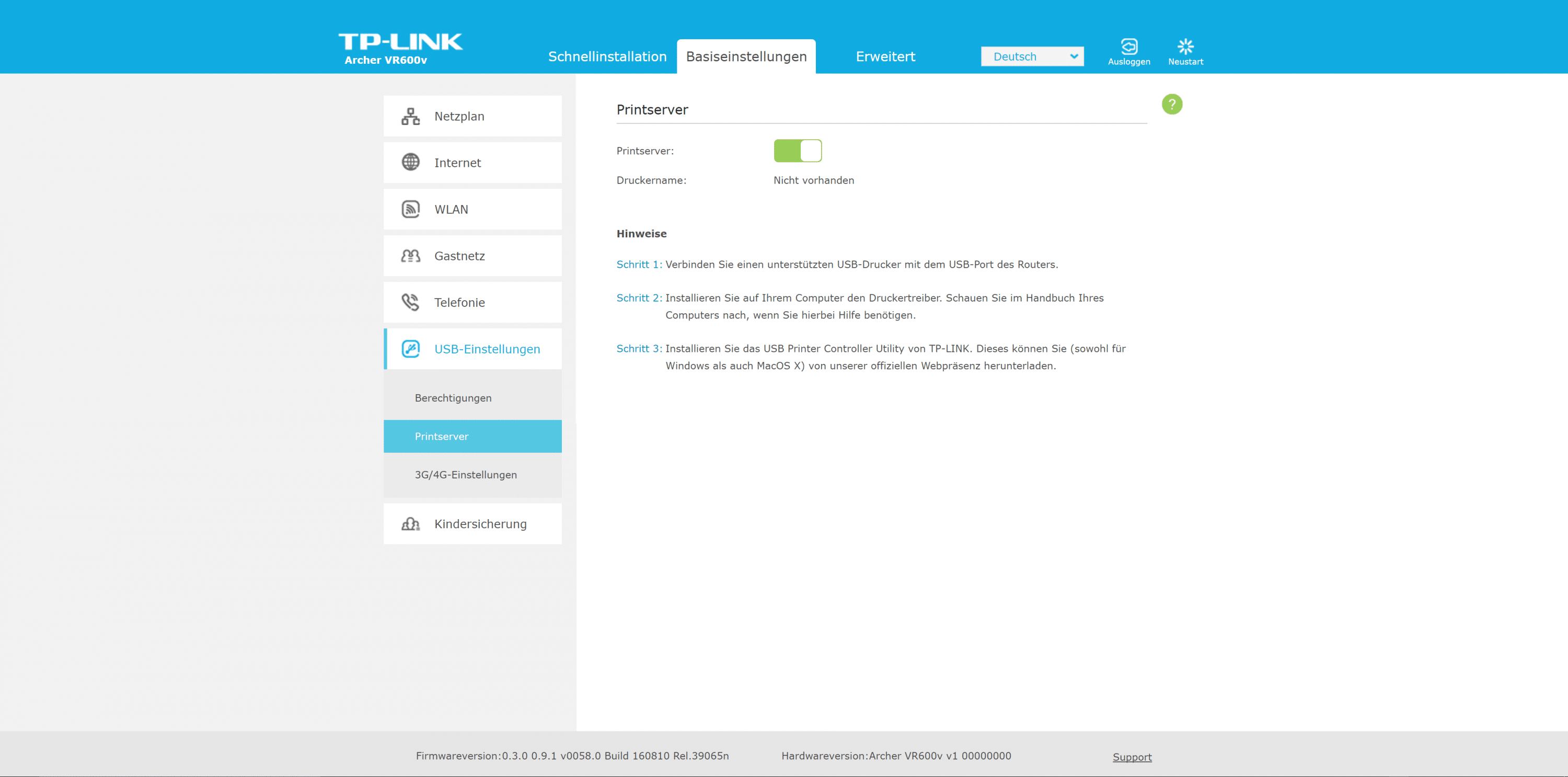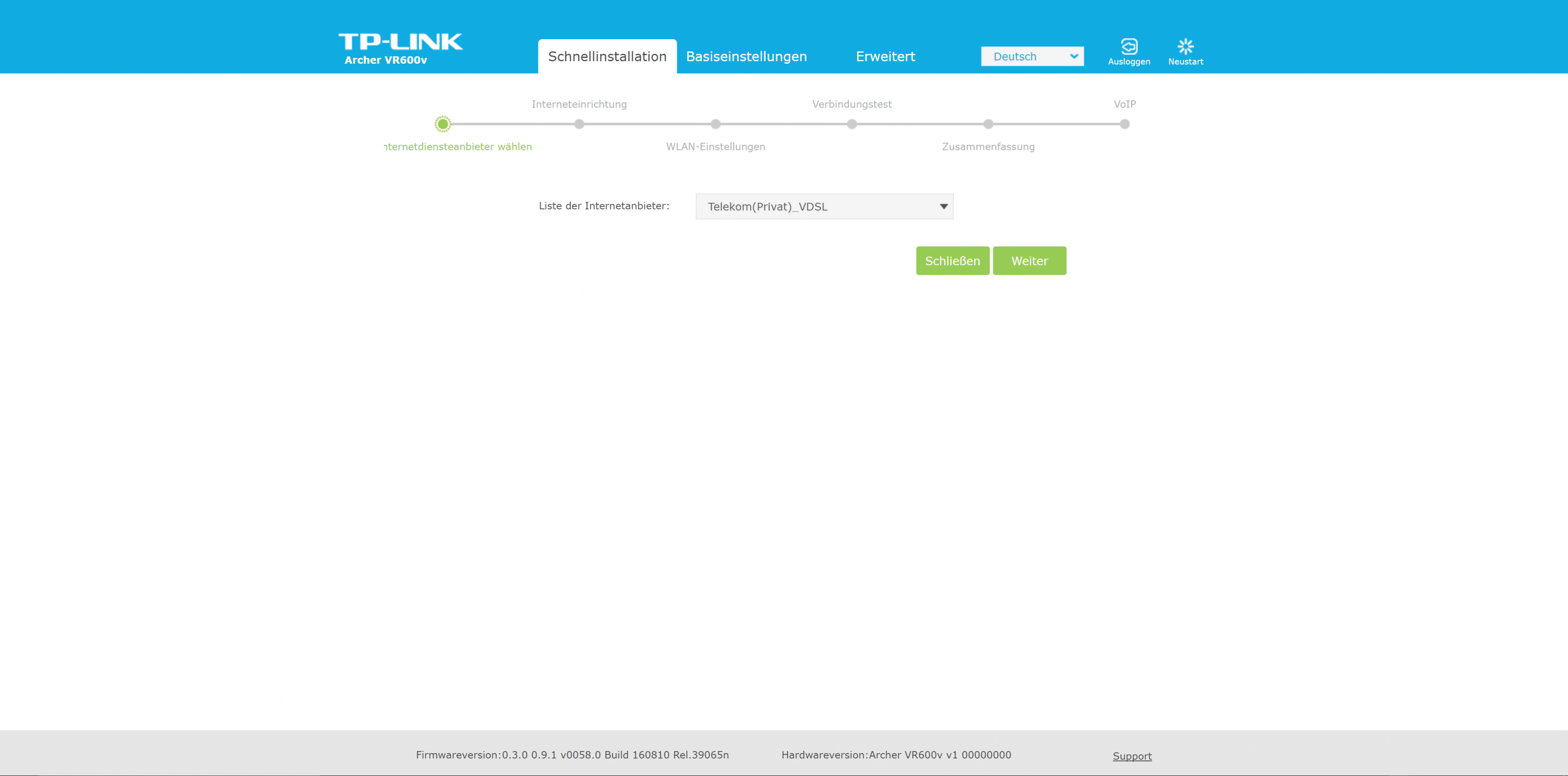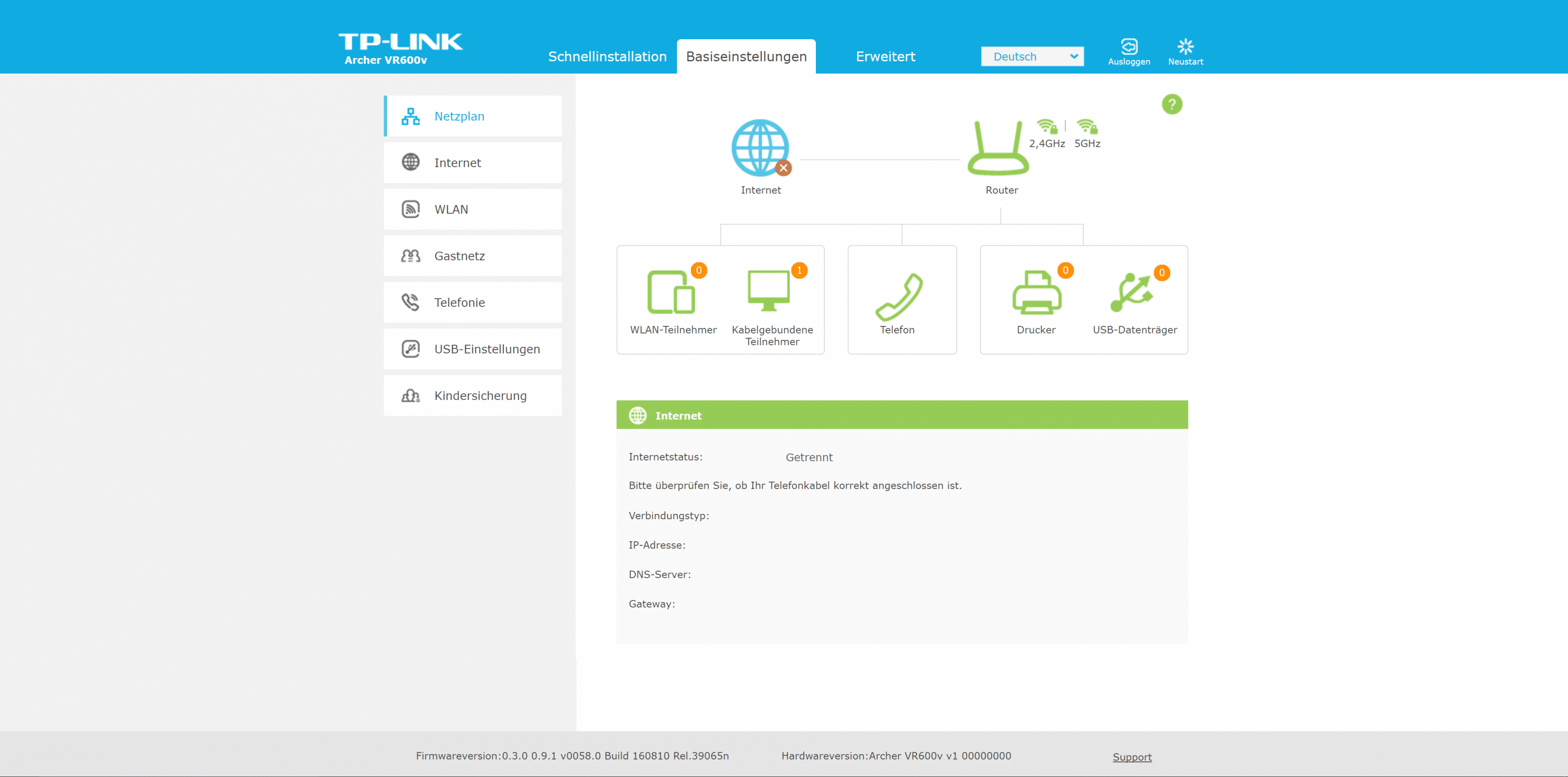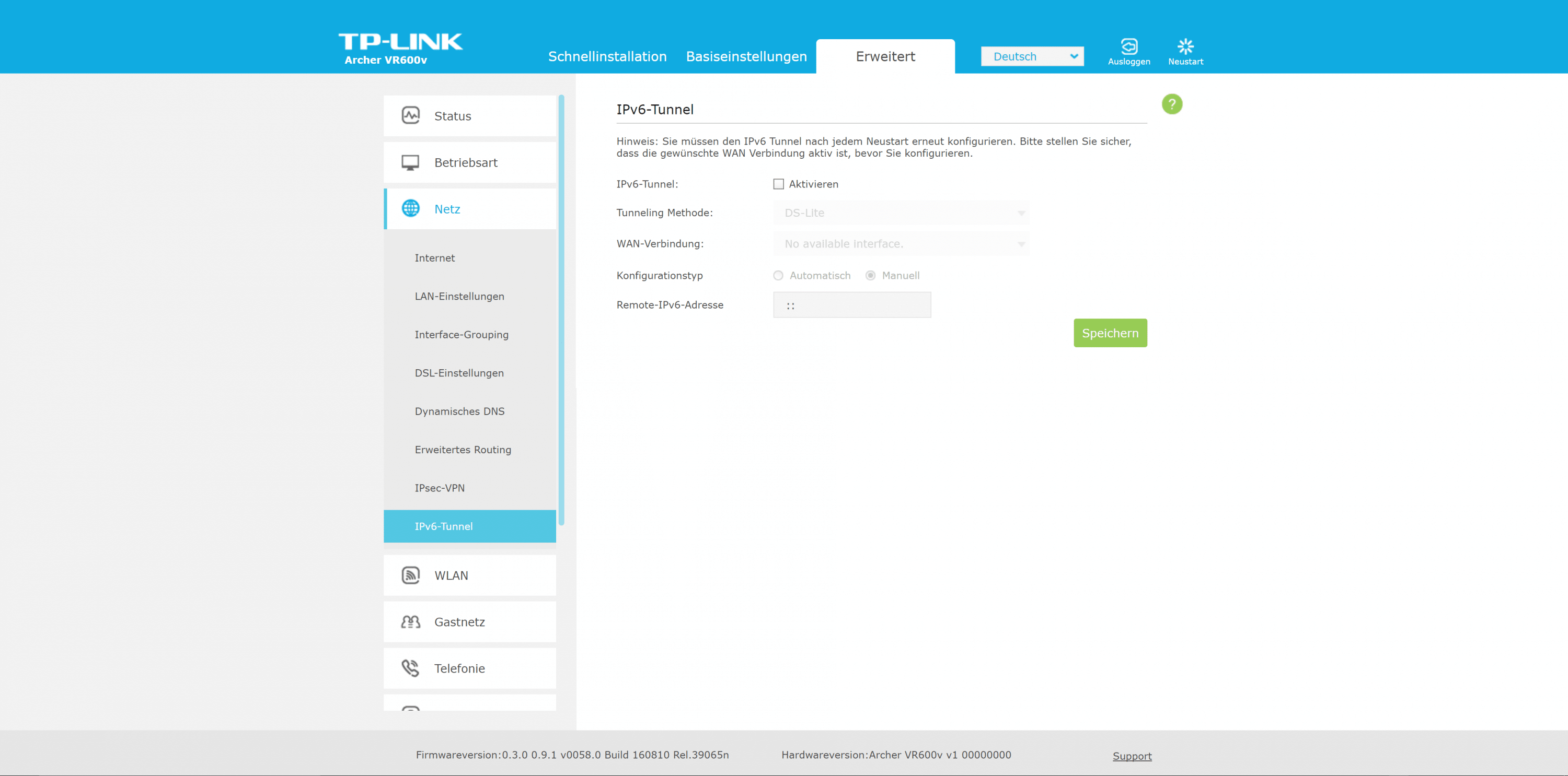 Beim Archer VR600v setzt TP-Link auf seine Standard-Benutzeroberfläche. Die zügig reagierende Oberfläche ist in drei Bereiche untergliedert. Der Assistent ist euch bei der Ersteinrichtung behilflich. Es folgen die Bereiche „Basiseinstellungen“ sowie „Erweitert“.