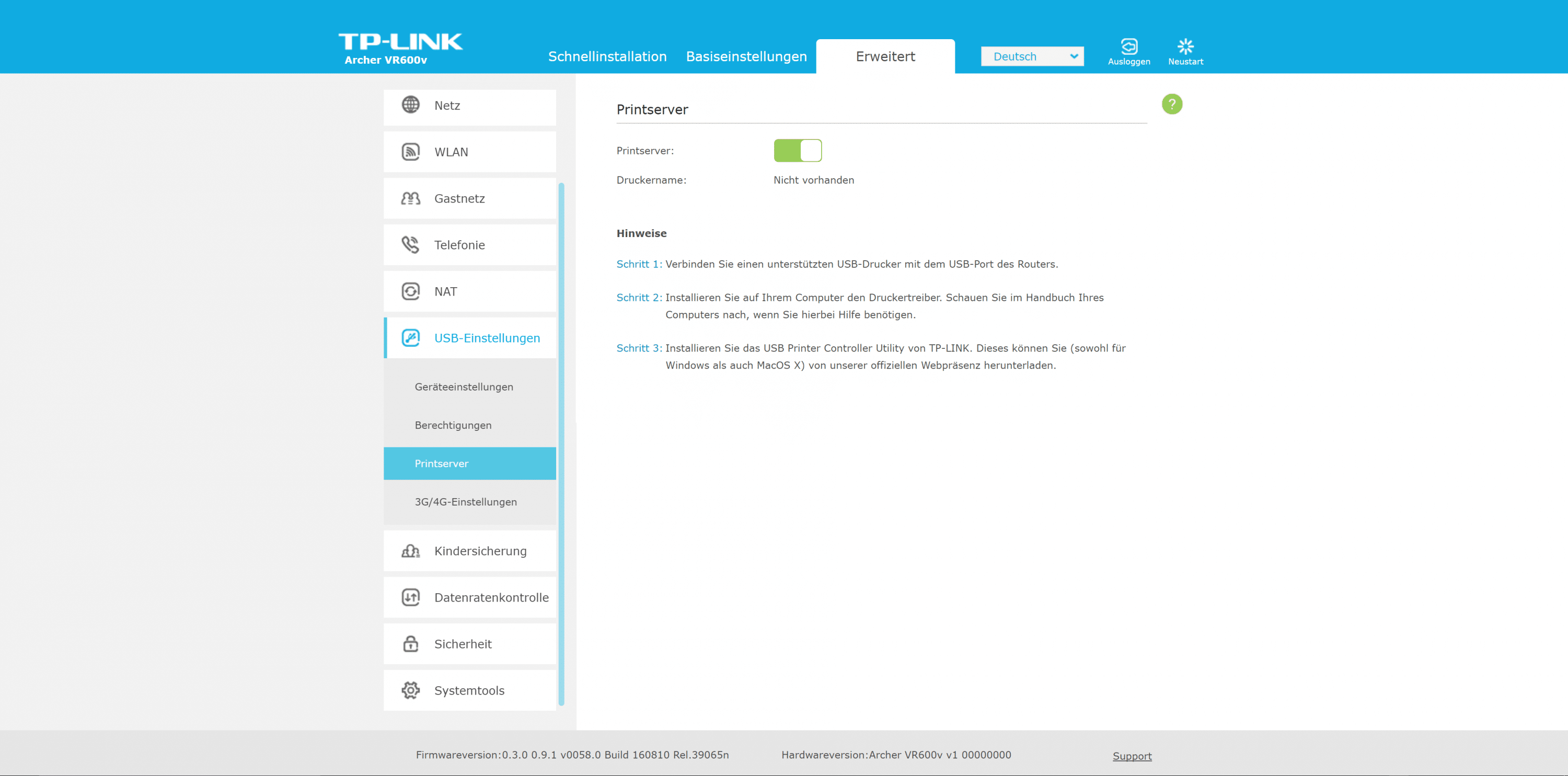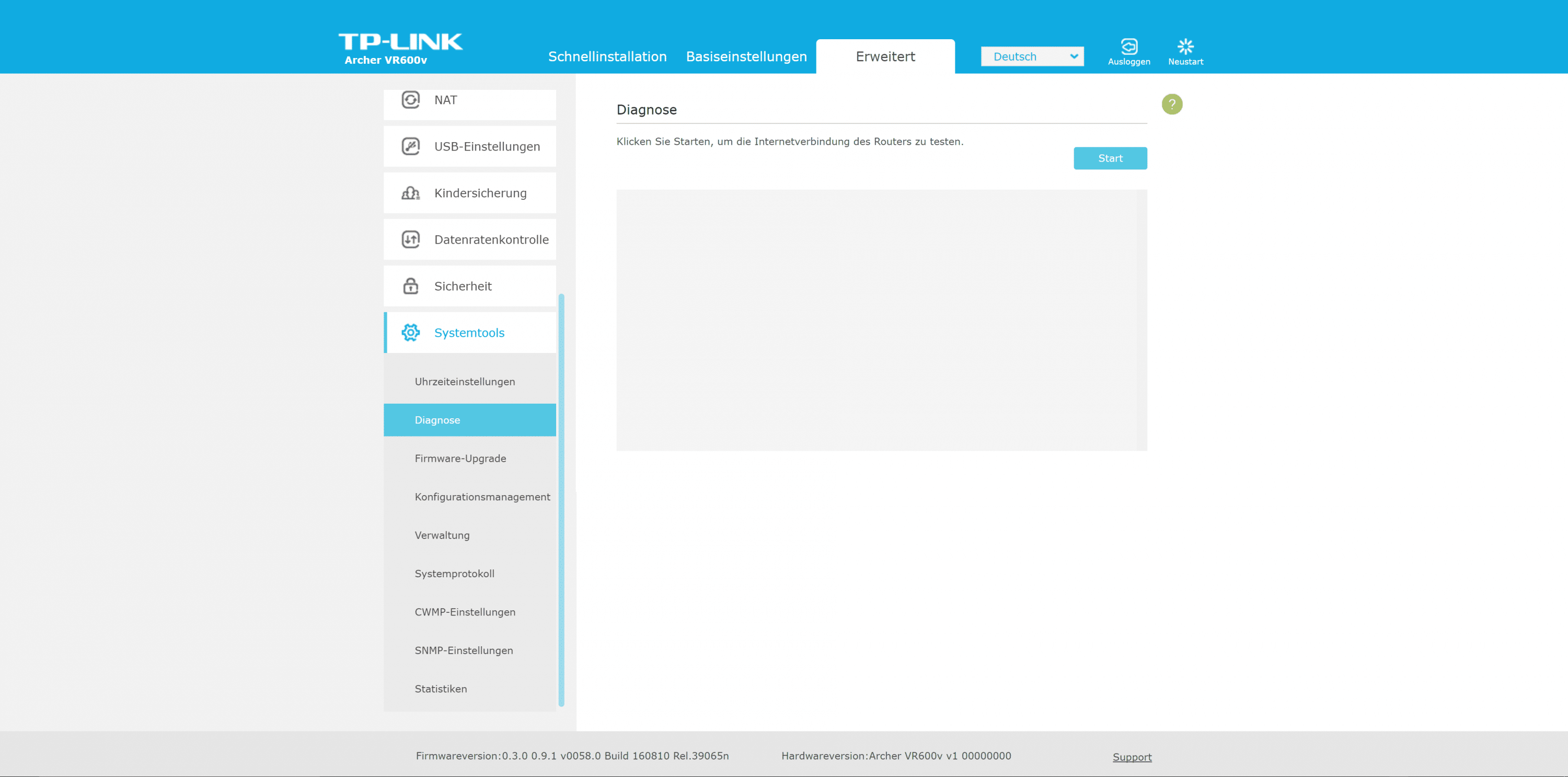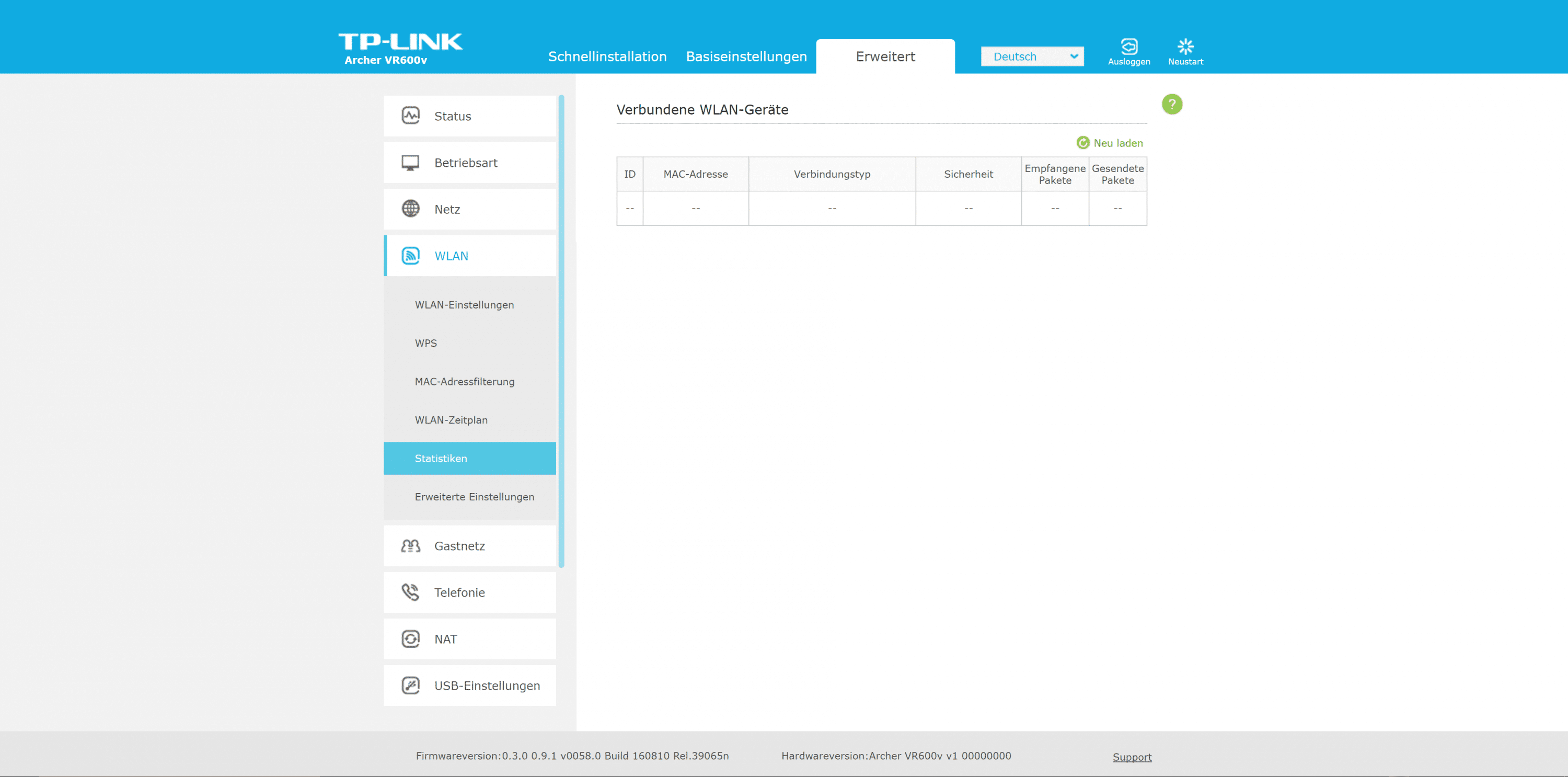 Beim Archer VR600v setzt TP-Link auf seine Standard-Benutzeroberfläche. Die zügig reagierende Oberfläche ist in drei Bereiche untergliedert. Der Assistent ist euch bei der Ersteinrichtung behilflich. Es folgen die Bereiche „Basiseinstellungen“ sowie „Erweitert“.