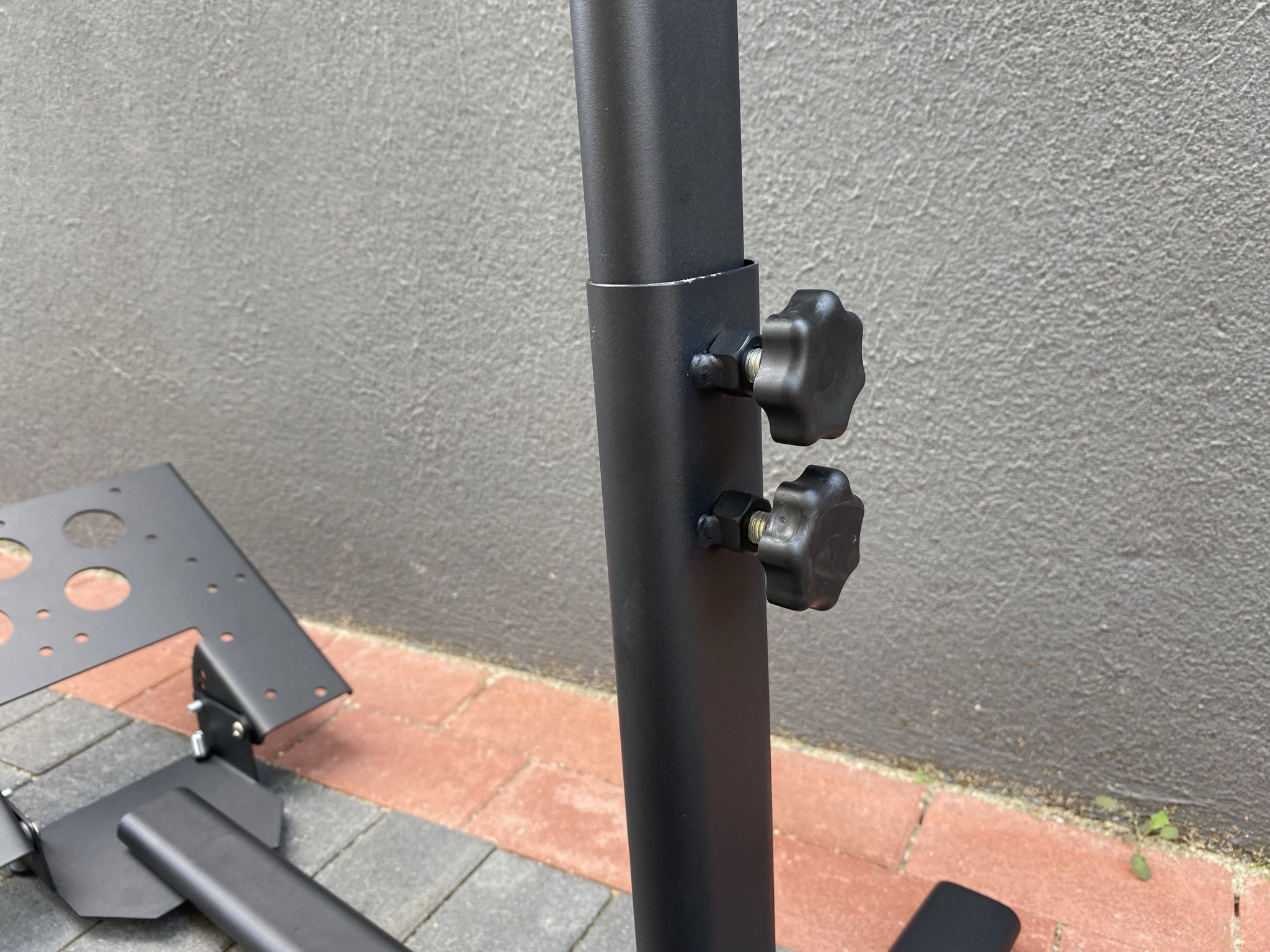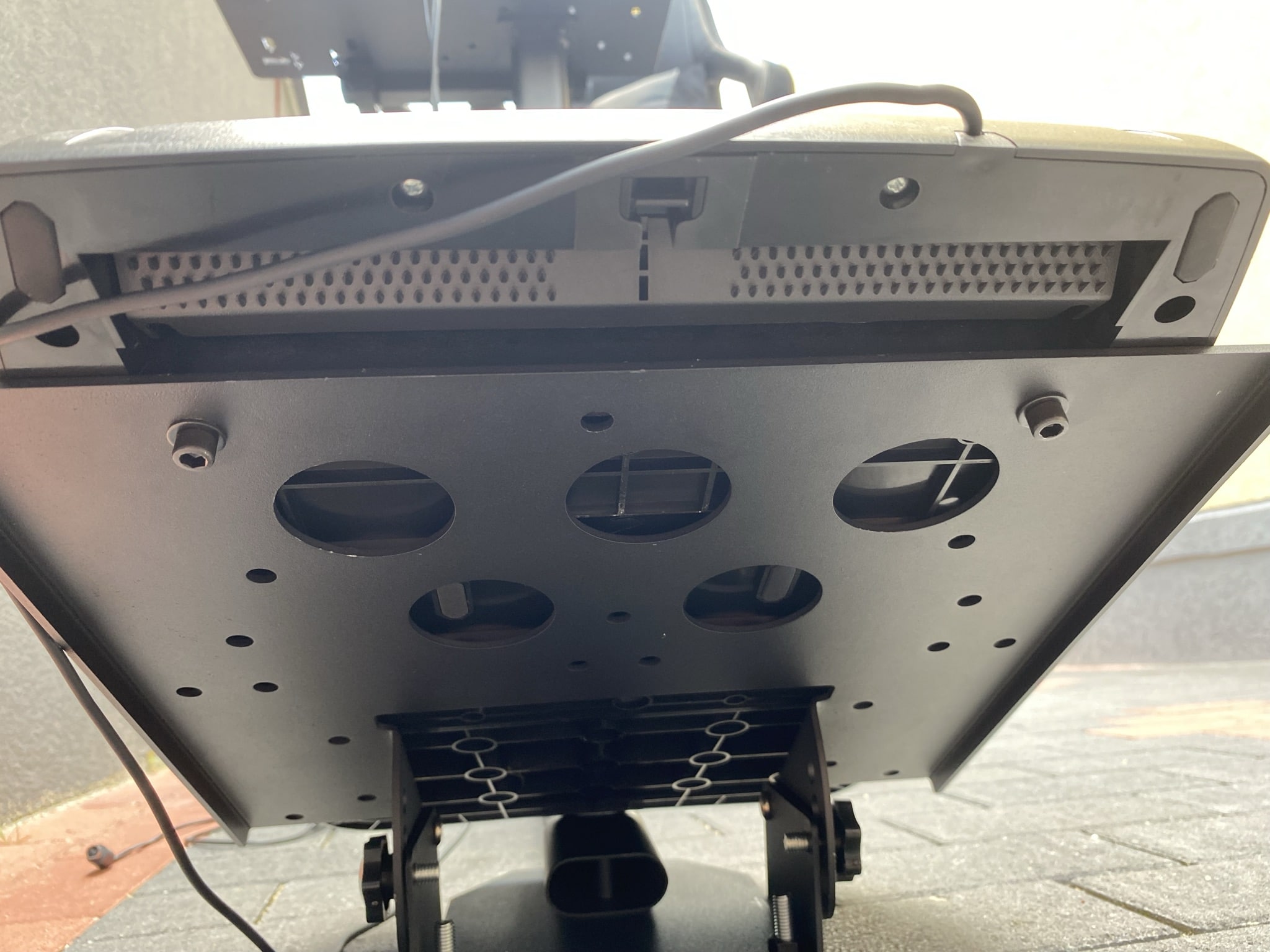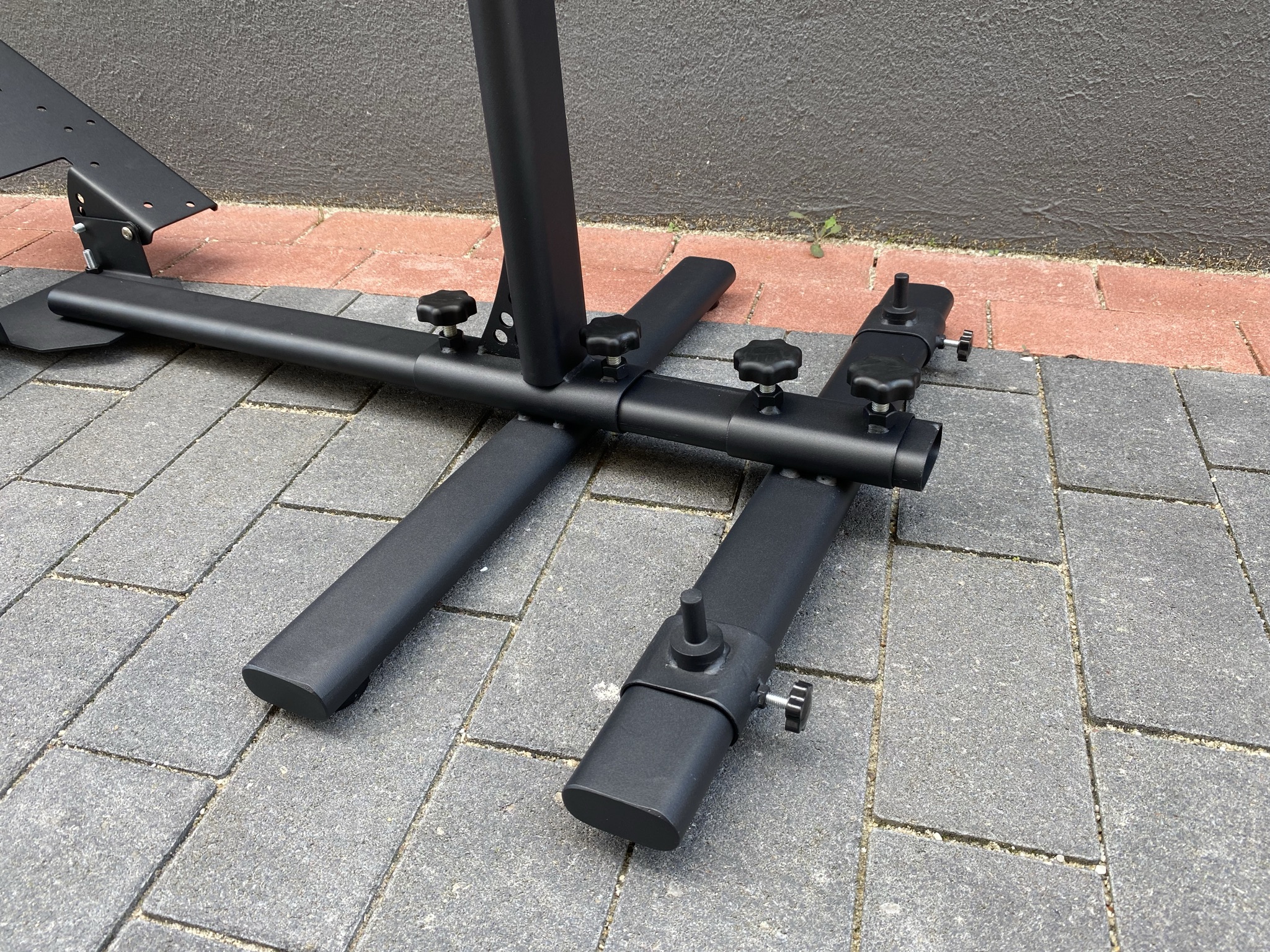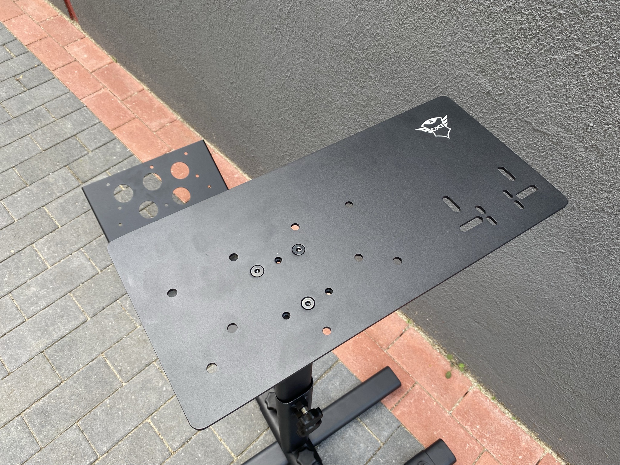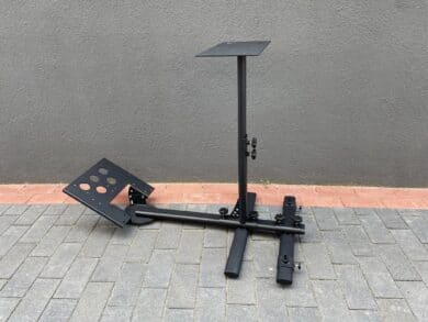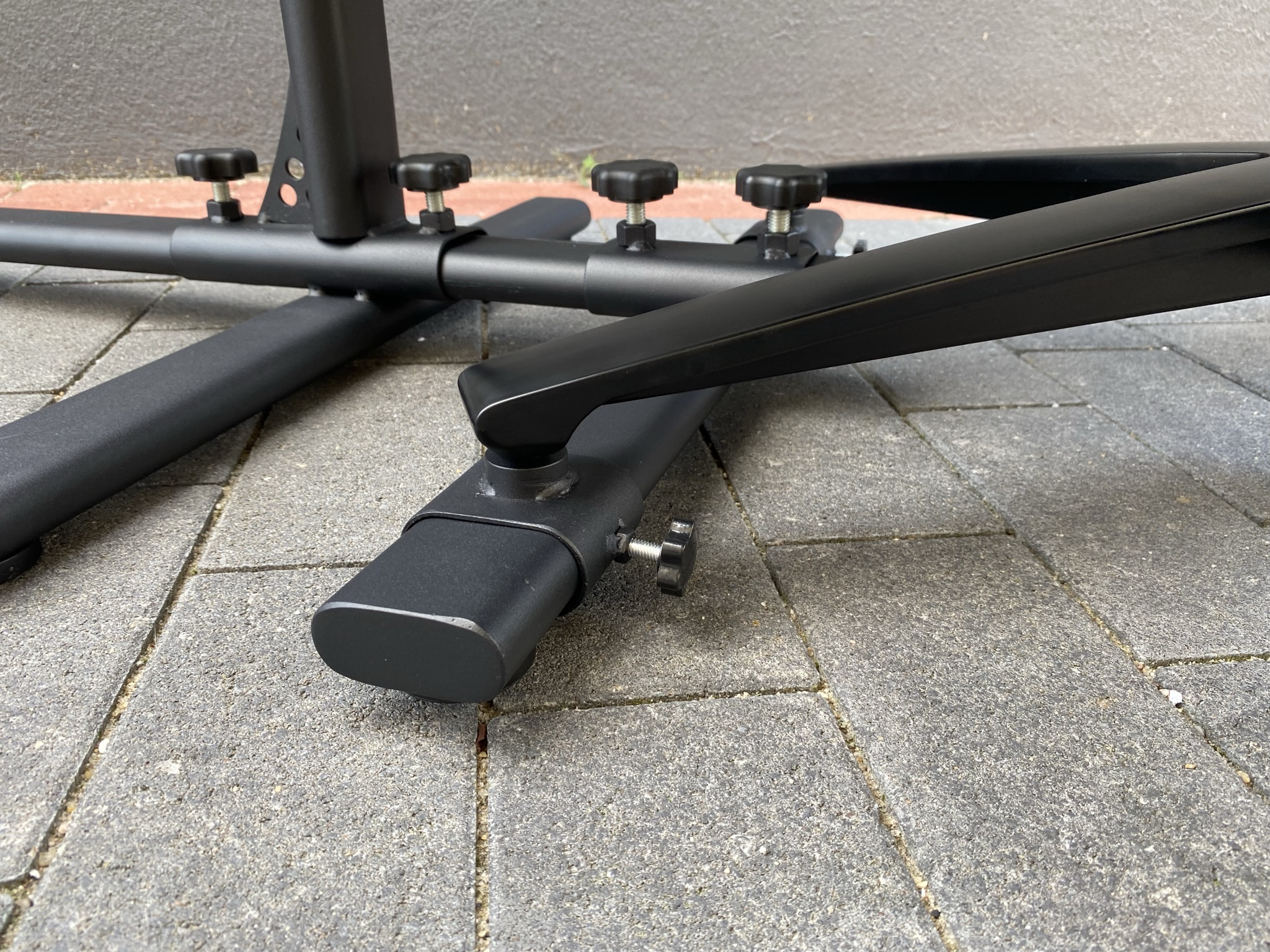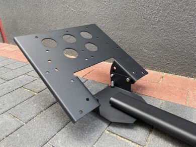 Die mittlere Stange, für die Halterung des Lenkrads, besteht aus einem etwas komplexeren Konstrukt. Auf der Unterseite lässt sich dort wieder die gesamte Entfernung zu den anderen Teilen anpassen und oben schließlich die Höhe des Lenkrads. Der horizontale Balken ist dabei nach hinten an der Unterseite mit einer Schräge gestützt – an Halt sollte es damit nicht mangeln. Genauso stabil ist die auf den Fotos eher dünn wirkende Platte für das Lenkrad. Hat man diese einzeln in der Hand, merkt man erst mal wie stabil sie eigentlich ist. Auf diese Platte lassen sich alle Lenkrad-Modelle festklammern und sitzen dabei rutschfest an der Platte ohne Kratzer am Lack zu hinterlassen. Anders ist es bei den Schrauben zum Ändern der Längen und Höhen. Diese werden einfach an den Stangen festgeschraubt, wodurch Kratzer am Lack entstehen können, wenn man nicht auf Anhieb die richtige Position findet.