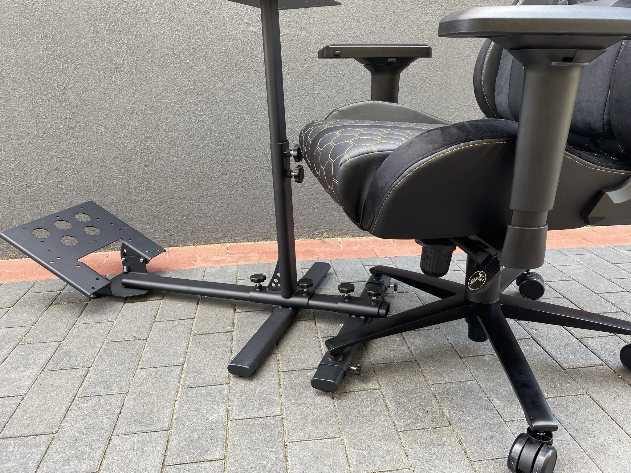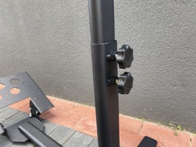Im nächsten Schritt wollen wir einen genaueren Blick auf die Komponenten werfen. Starten wir bei der Halterung für den Sitz. Hierfür steht ein Querbalken mit zwei beweglichen Schienen auf denen sich zwei metallische Pins befinden zur Verfügung. Auf diesen Pins lässt sich dann ein beliebiger Gaming-Stuhl befestigen, indem man zwei Rollen des Stuhls entfernt und dann das Fußkreuz in die Pins steckt. Je nach Größe lassen sich die Pins nach außen und innen verschieben, nachdem man eine Schraube an der Seite aufgedreht hat. Dazu benötigt man kein extra Werkzeug, da alle Schrauben mit Griffen versehen sind – damit lassen sich alle Teile einfach und schnell anpassen, was uns in der Handhabung sehr überzeugt hat.