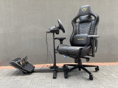 Die Qualität machte insgesamt einen guten Eindruck, jetzt muss nur noch die Performance GXT 1150 Pacer Racing Seat Adapters stimmen. Im ersten Schritt müssen wir uns für einen beliebigen passenden Stuhl entscheiden – dazu haben wir den von uns bereits getesteten Trust GXT 712 Resto Pro Gaming-Stuhl zur Hilfe genommen. Obendrauf kommt noch ein Lenkrad, in diesem Fall das Logitech G923 TRUEFORCE. Sobald alles montiert und eingestellt wurde, kann der Spaß beginnen.