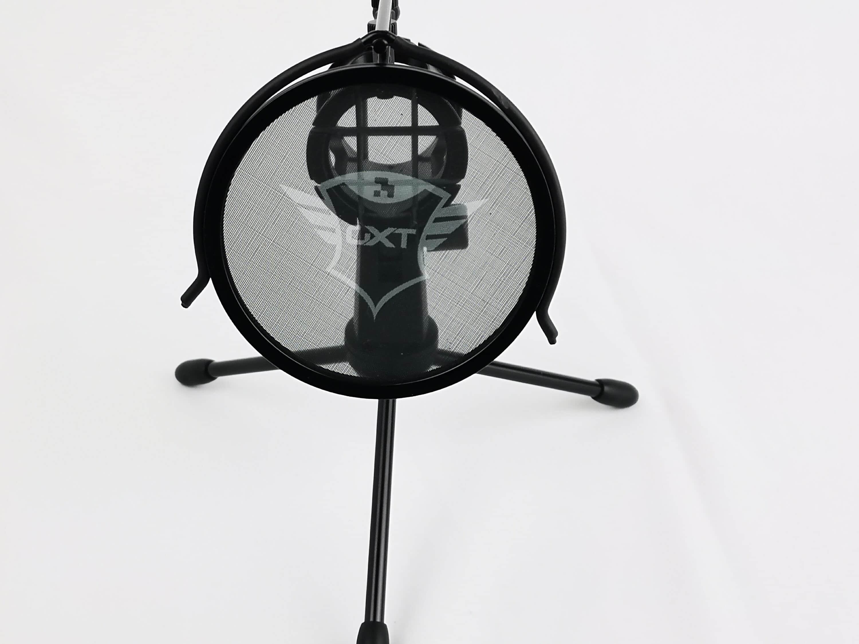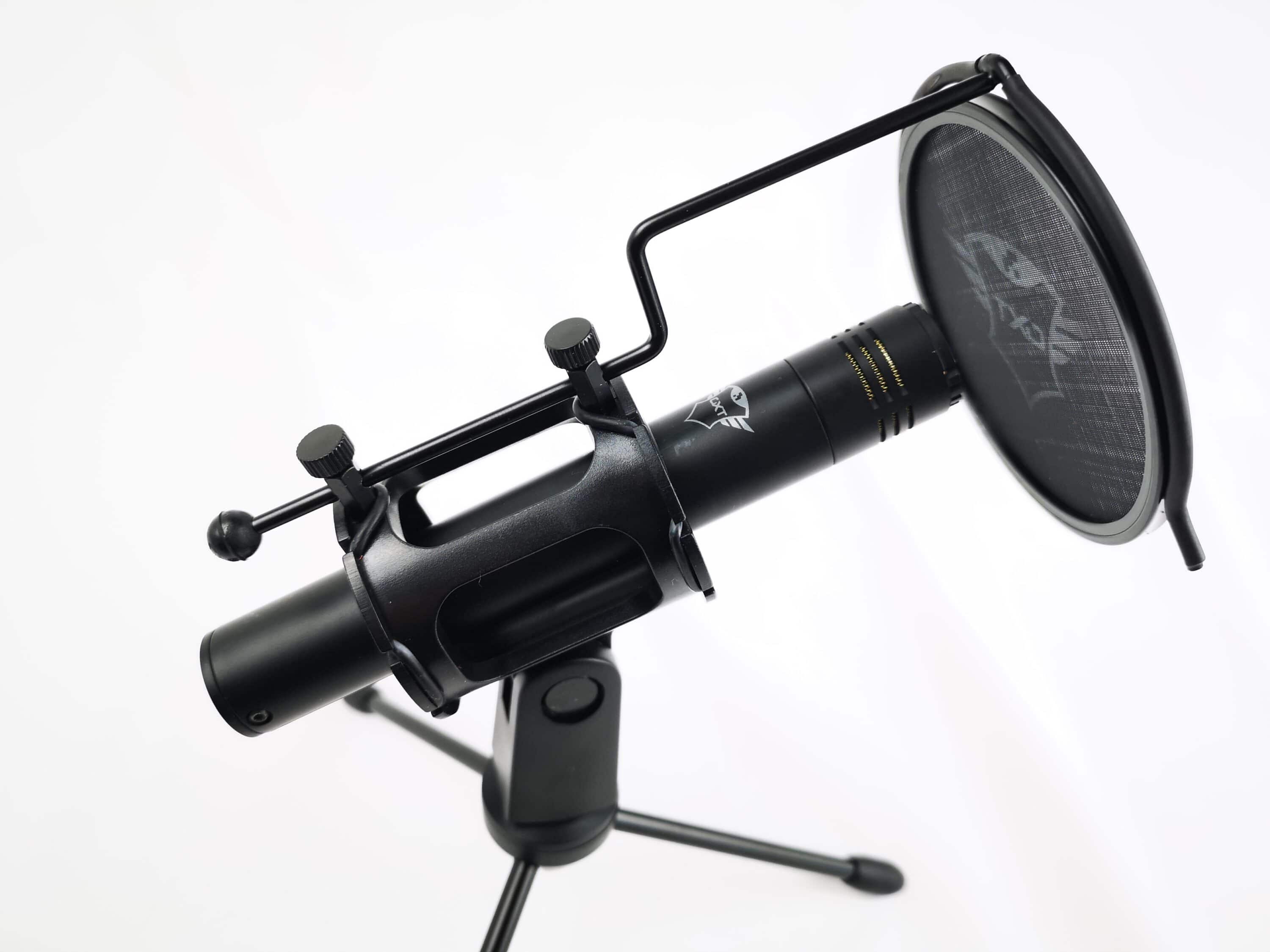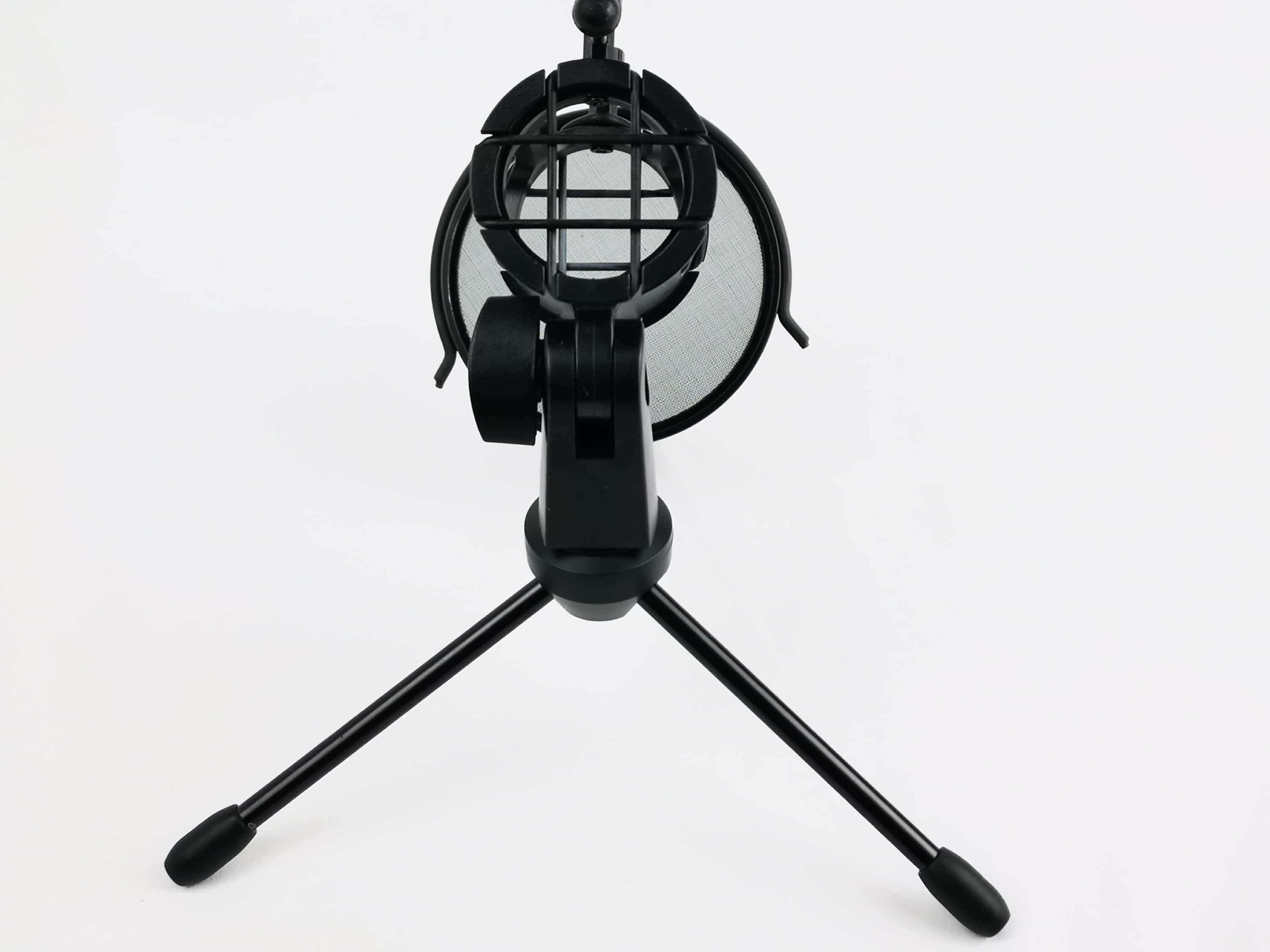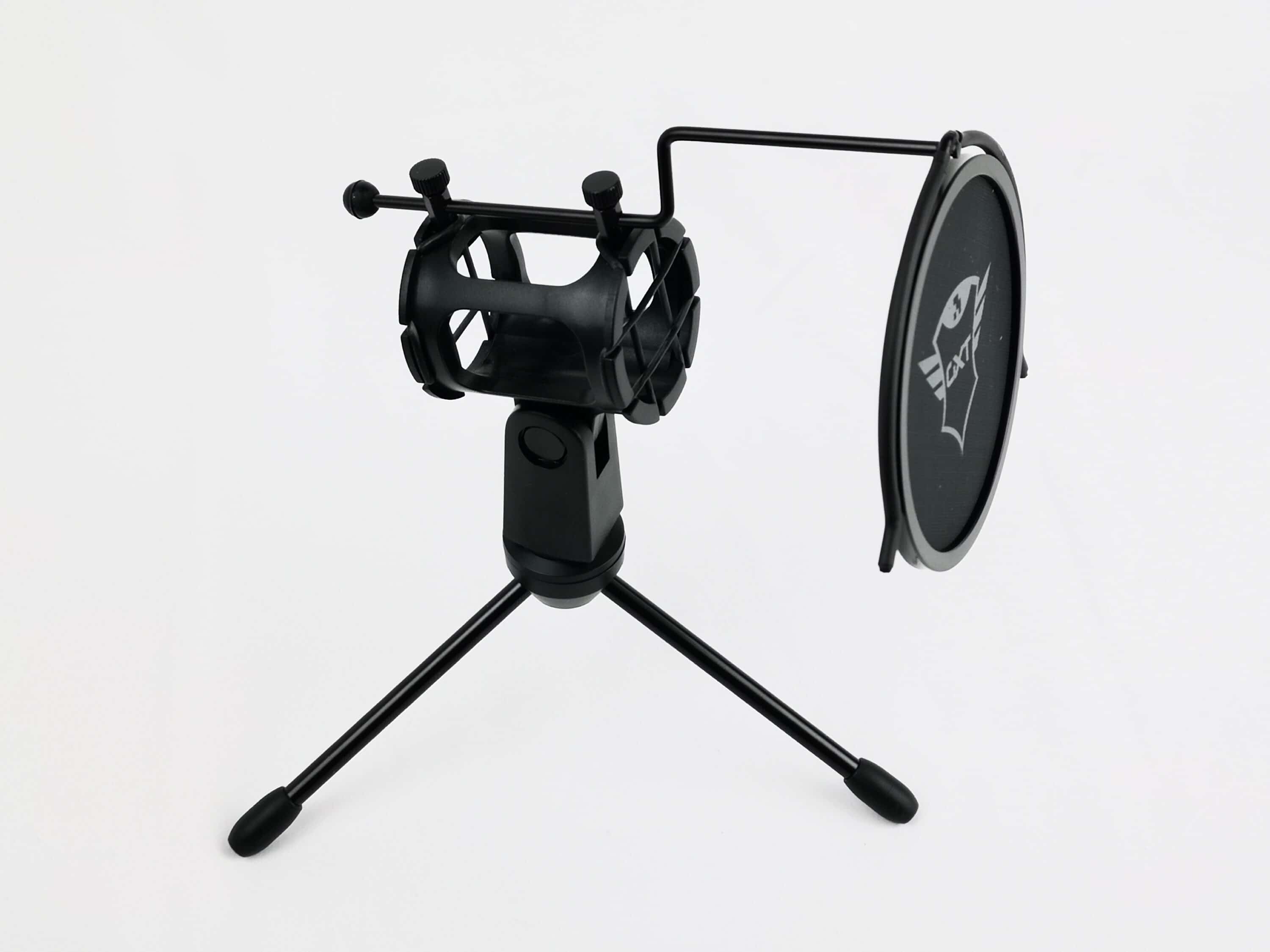 Auch das Stativ ist größtenteils aus Metall gefertigt und komplett in Schwarz gehalten. Der Popfilter ist bereits vormontiert, die zwei Teile des Stativs müssen also nur miteinander verschraubt werden und man ist direkt bereit loszulegen. Der Rand des Popfilters ist aus Kunststoff und teilweise gummiert. Die Entfernung des Filters zum Mikrofon lässt sich durch die Schrauben oberhalb leicht justieren. Im Netz des Filters findet sich erneut das Trust-GXT-Logo wieder. Die drei Metall-Beine lassen sich einfach ein- bzw. ausklappen und sind an den Standflächen ebenfalls mit Kunststoff ummantelt. Die „Spinne“ besteht aus jeweils zwei Gummibändern oben und unten. Diese sollen für Entkopplung sorgen und vor Störgeräuschen durch Vibrationen schützen. An der Seite des Stativs befindet sich ein Schraubverschluss, mit dem sich der Winkel des Mikrofons frei anpassen lässt. Der Aufbau des Stativs lässt es unserer Meinung nach leider etwas „billig“ wirken. Die Funktion erfüllt es dafür aber gut.