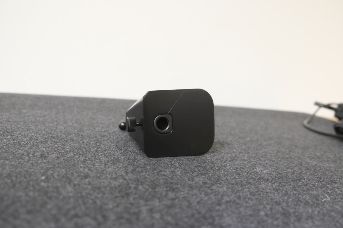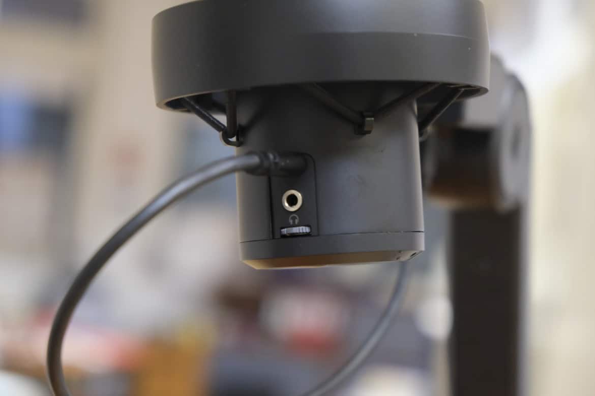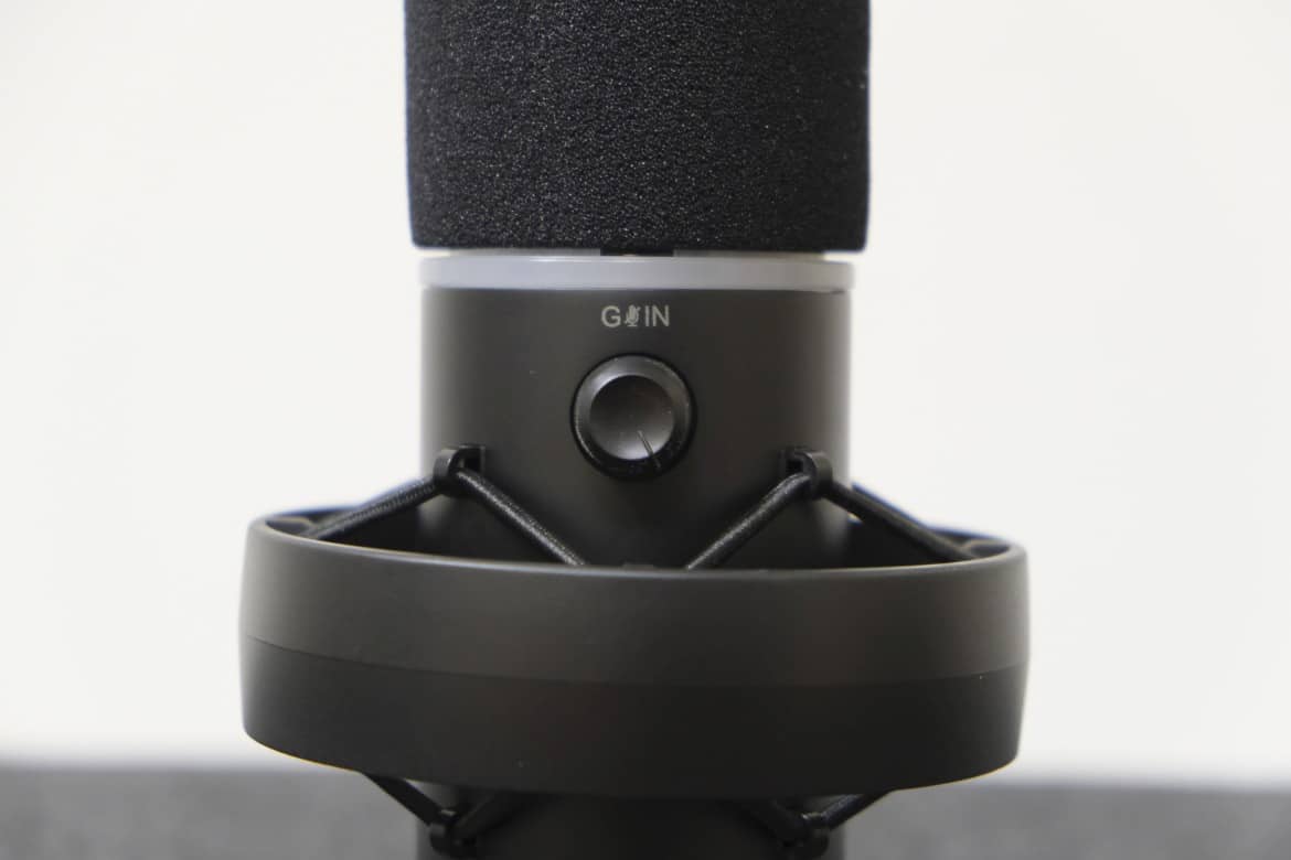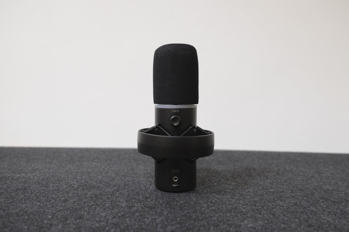 Das Mikrofon selbst ist ebenfalls eher schlicht gehalten und ab Werk mit einem Poppschutz ausgestattet. An der Rückseite befindet sich der USB-C-Anschluss, mit dem es direkt mit dem Mikrofonarm verbunden wird. Darunter platziert der Hersteller einen 3,5-mm-Klinkeneingang zum Anschluss eines Kopfhörers, sowie einen Wipp-Schalter, mit dem die Lautstärke des Kopfhörers direkt am Mikrofon feinjustiert werden kann. Unterhalb des Popschutzes befindet sich der „GAIN“-Drehregler, mit dem sich die Aufnahmeempfindlichkeit schnell und einfach einstellen lässt. Per Druck auf den Regler wird das Mikrofon zudem sofort stummgeschaltet.