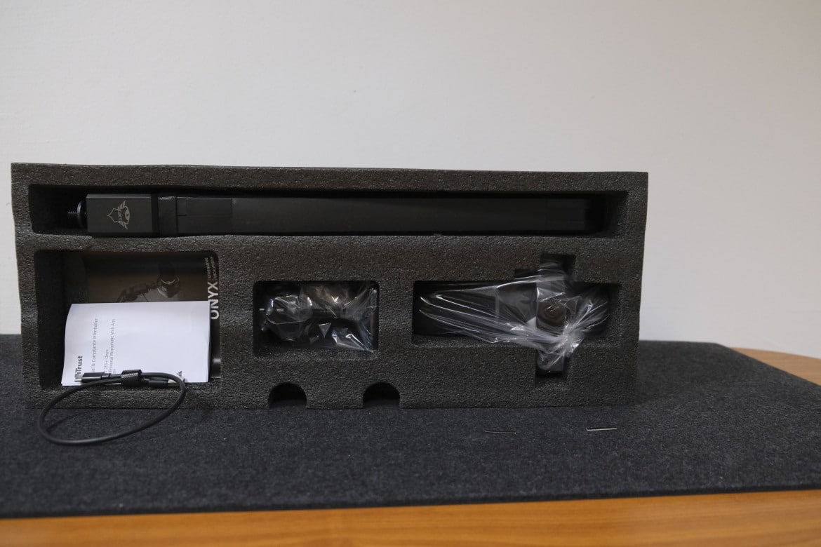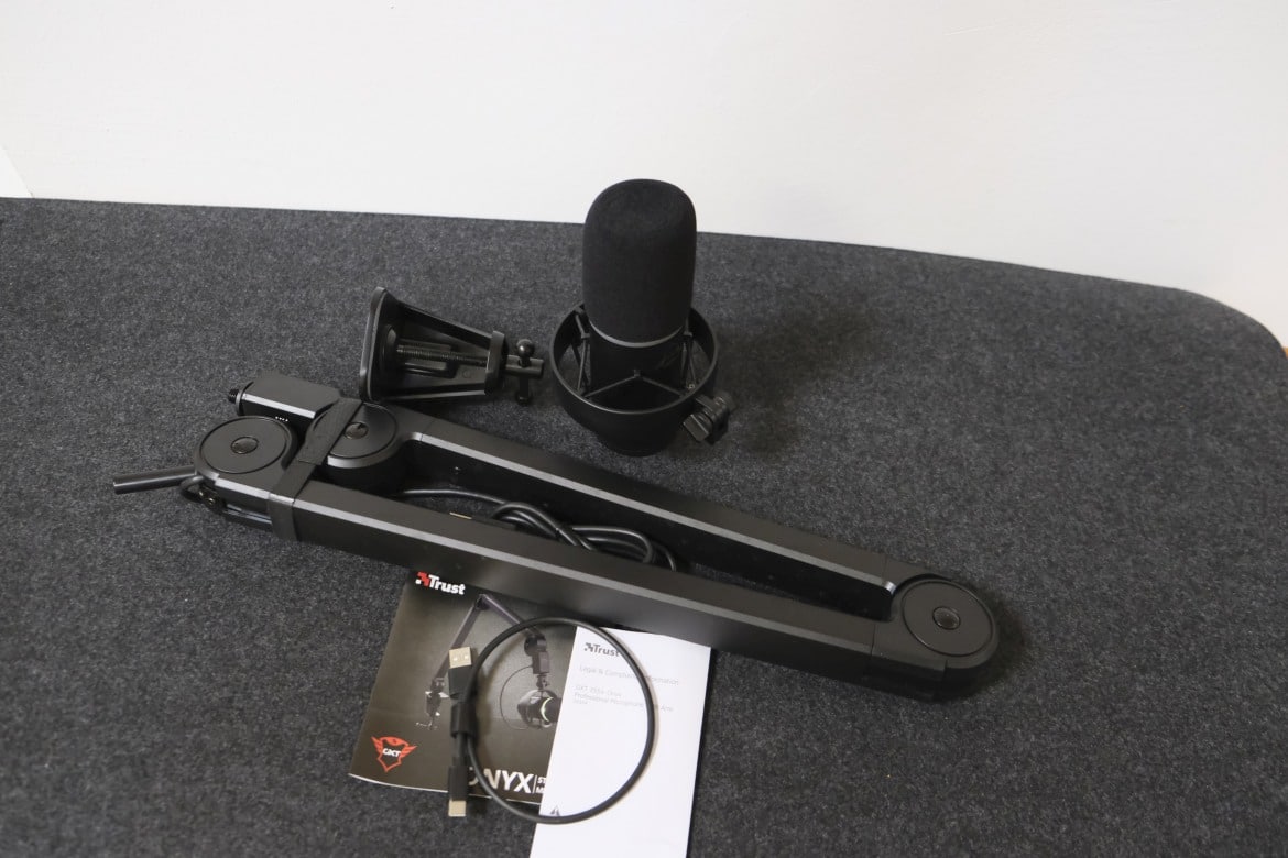 Das Trust GXT 255+ ONYX kommt in einem riesigen Karton daher, der bereits darauf hindeutet, dass sich ein wirklich langer Mikrofonarm im Inneren befindet. Beim Öffnen der Verpackung präsentiert der Hersteller alle Bestandteile, fein säuberlich aufgeteilt in einem üppigen Schaumstoffbett.