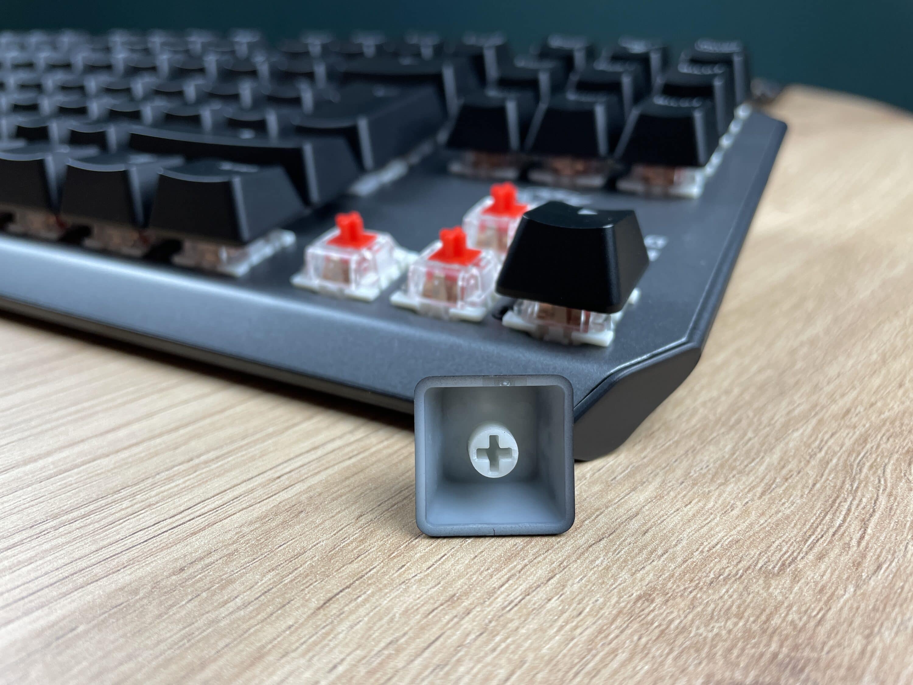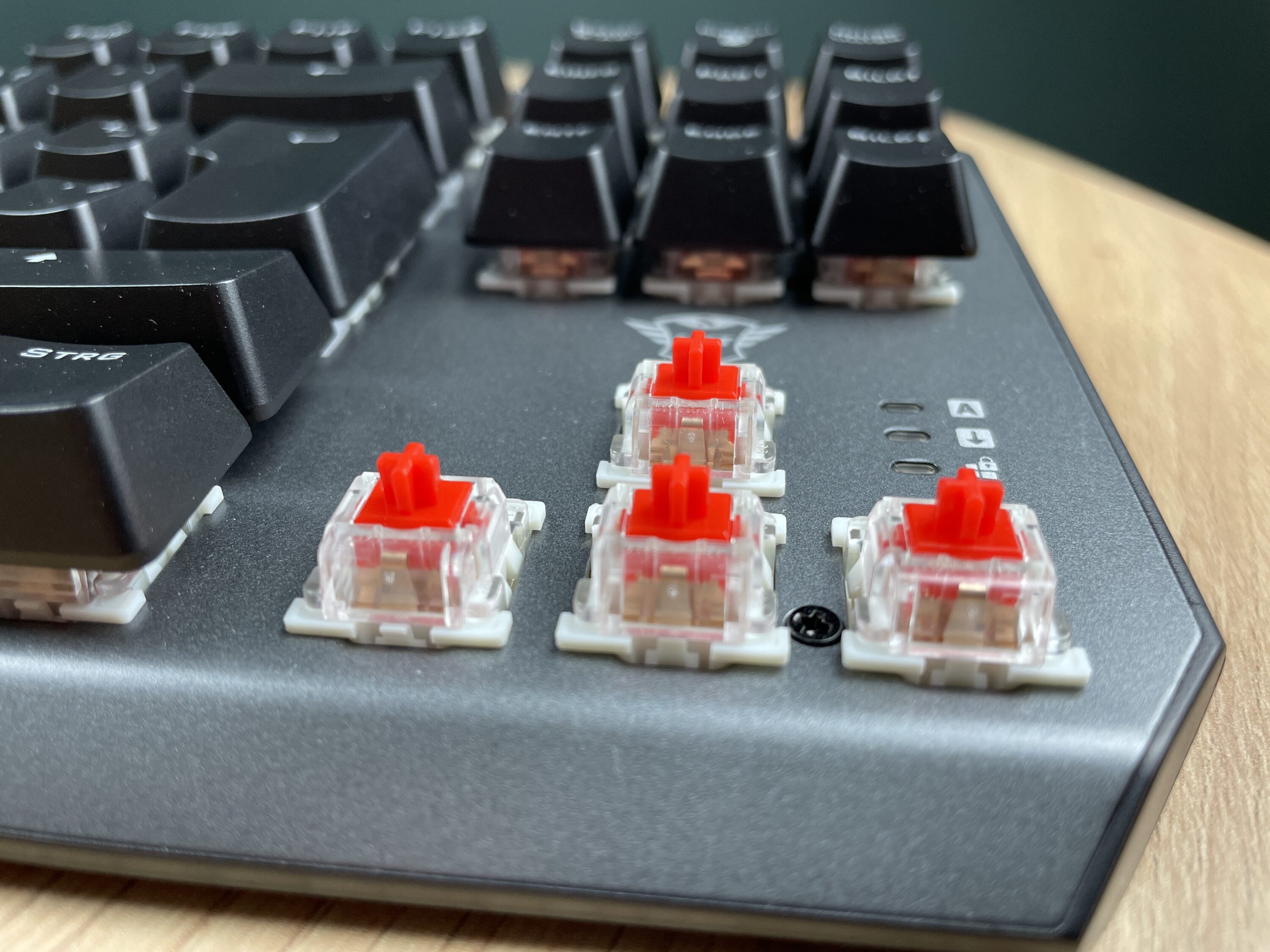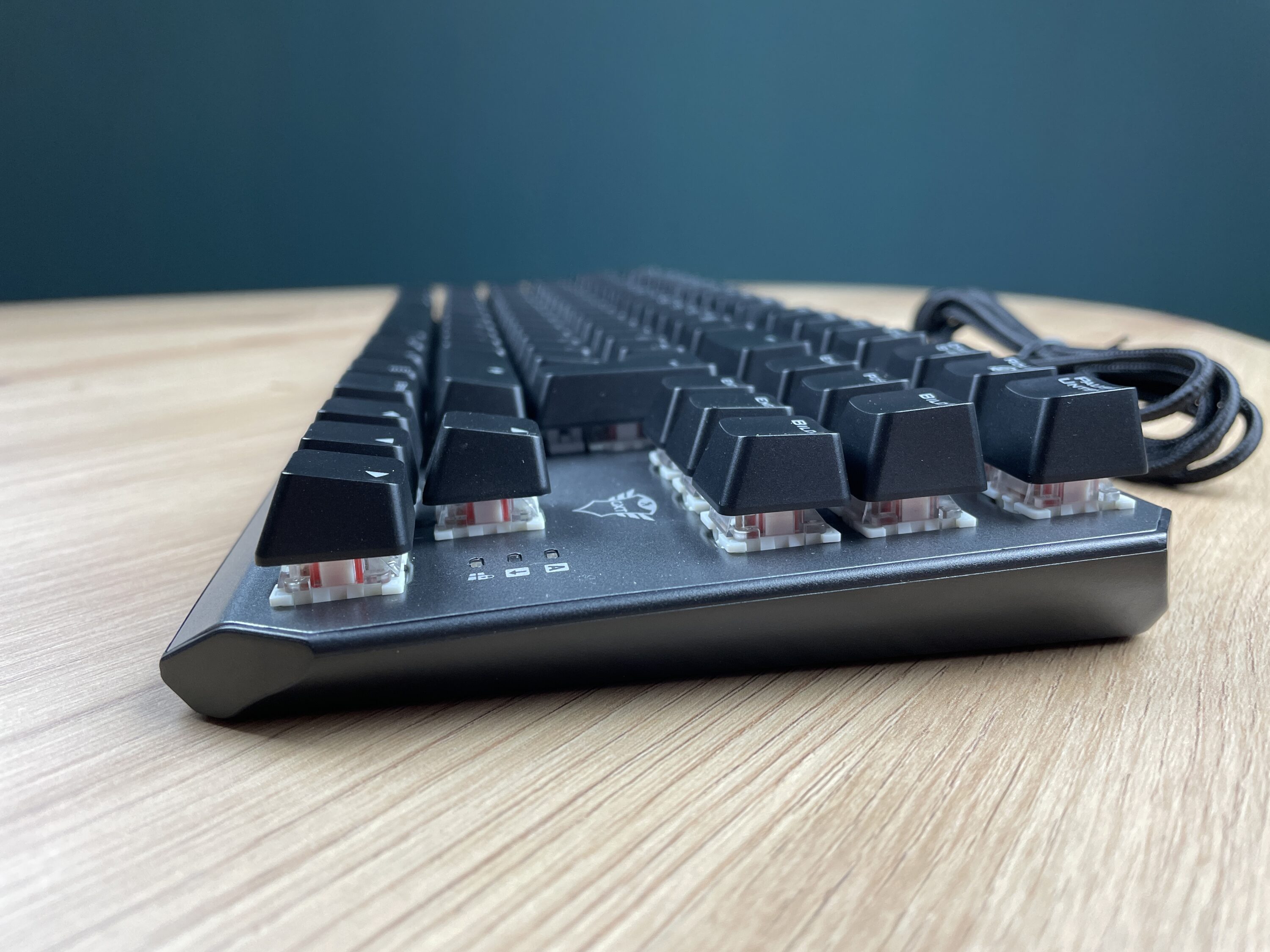 Bei den Schaltern setzt Trust auf mechanische Switches des Herstellers Outemu. Im Detail handelt es sich um lineare rote Schalter mit einem Betätigungsweg von 4 mm. Besonders gut ist uns aufgefallen, wie die Tasten auf die Schalter aufgesteckt werden. Mittels eines eingearbeiteten Kreuzes werden die Tasten ganz bequem und ohne Komplikationen auf die Schalter aufgesteckt und bleiben so zuverlässig an Ort und Stelle.