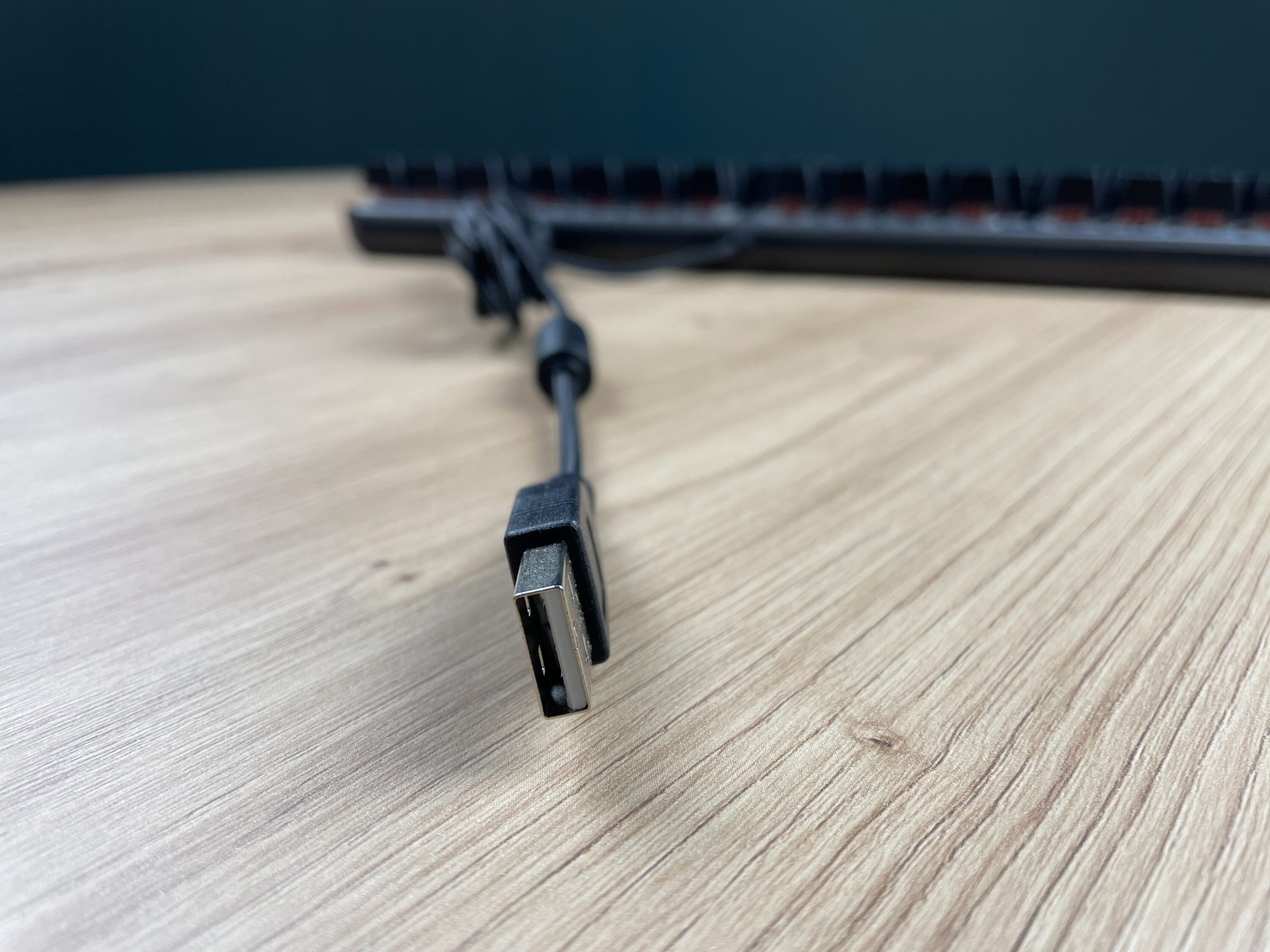 Beim Kabel handelt es sich um ein 180 cm langes USB-Kabel, das über einen USB-A-Anschluss mit dem Computer verbunden werden kann. Es ist fest an der Tastatur verkabelt und lässt sich nicht herauslösen. Das gesamte Kabel ist mit einem schwarzen Geflecht ummantelt. Dadurch wirkt es nicht nur wertiger, sondern auch stabiler und haltbarer.