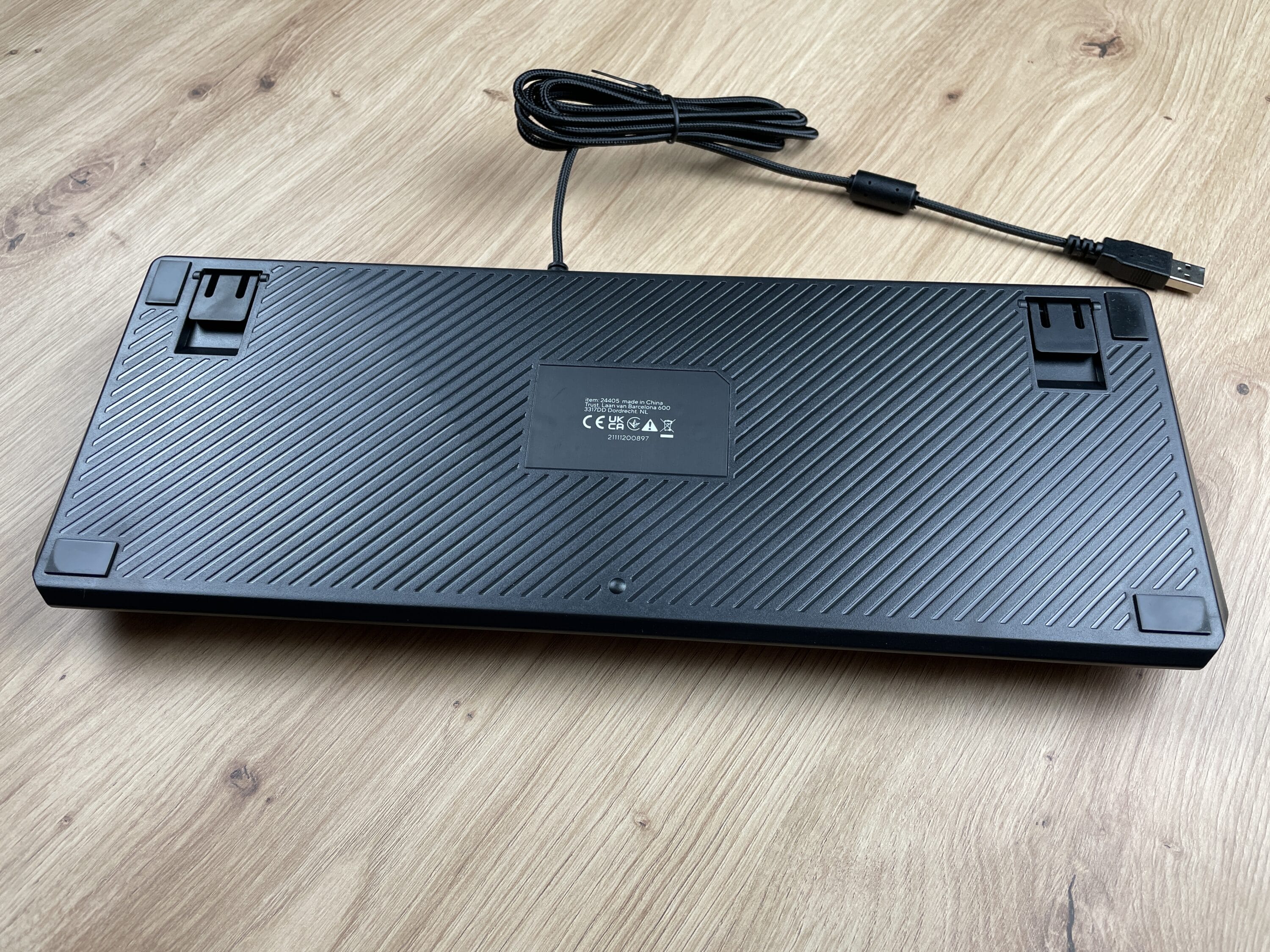 Das Grundgehäuse bzw. die Unterseite der GXT 834 ist aus schwarzem Kunststoff gefertigt, welcher insgesamt einen ordentlich verarbeiteten Eindruck macht. Die Standflächen sind gummiert und bieten so ordentlich Grip auf dem Schreibtisch oder der Unterlage. Wie für Tastaturen üblich, verfügt die Trust GXT 834 Callaz auch über herausklappbare Erhöhungen, welche ebenfalls gummiert sind.