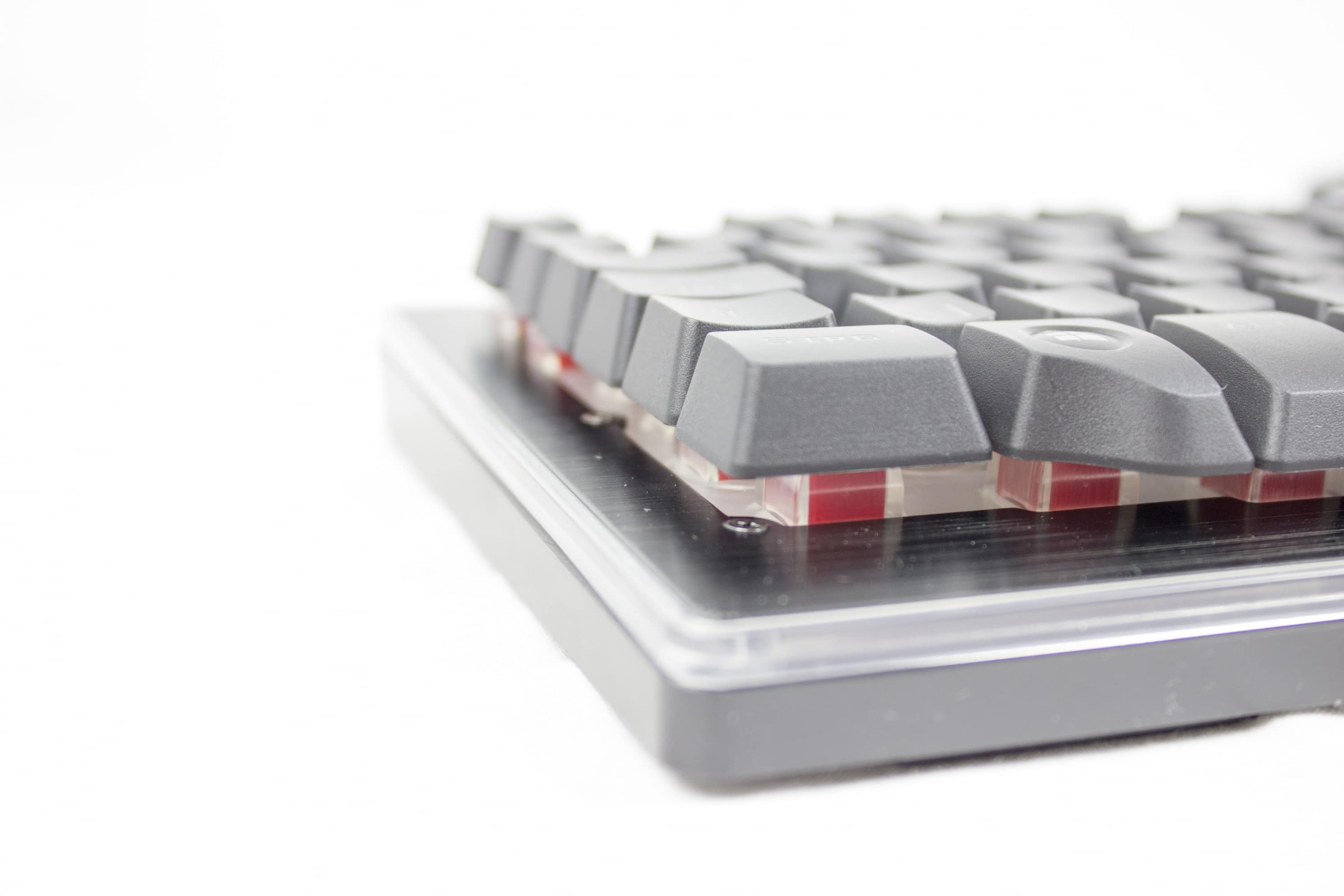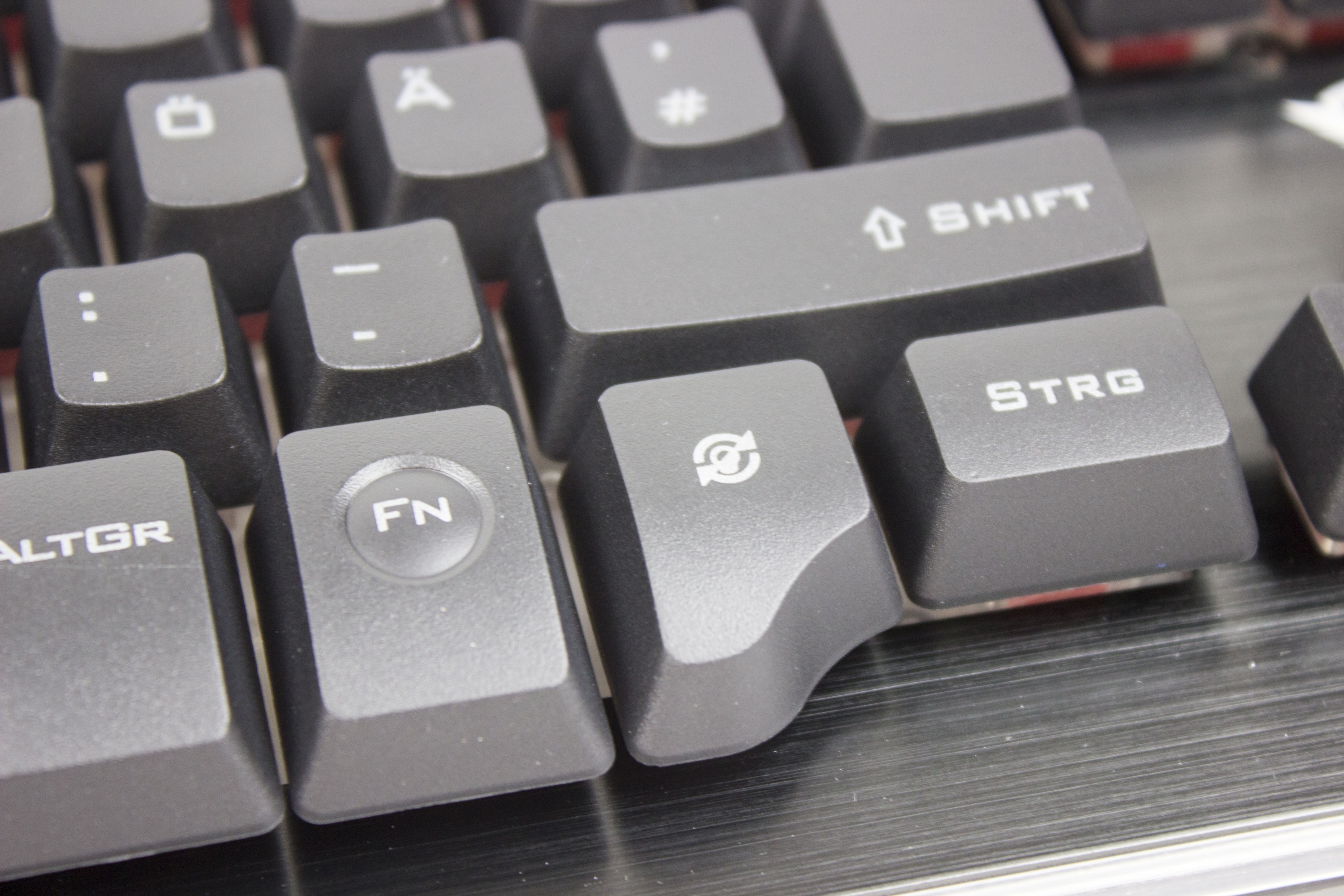 Wie bereits erwähnt hat die Tastatur ein angenehmes Schreibgefühl, welches ganz minimal mit mechanischen Tastaturen vergleichbar ist. Sie hat das übliche QWERTZ-Layout bis auf zwei andere Tasten. Die Windows-Taste weicht der FN-Taste und die Menü-Taste weicht dem „Gaming-Mode“. In diesem wird einfach nur die Windows-Taste deaktiviert. Die abnehmbare Handballenablage sorgt für viel Komfort. Ohne die Ablage gibt es durch die Höhe der Tasten schnell Handgelenksschmerzen. Durch das hohe Gewicht der Tastatur in Verbindung mit den Gummifüßen ist kein Verrutschen möglich.