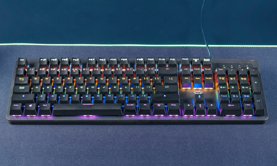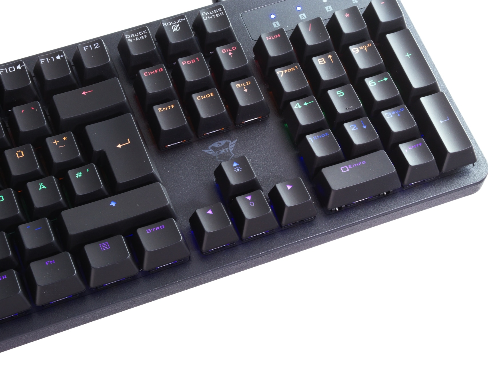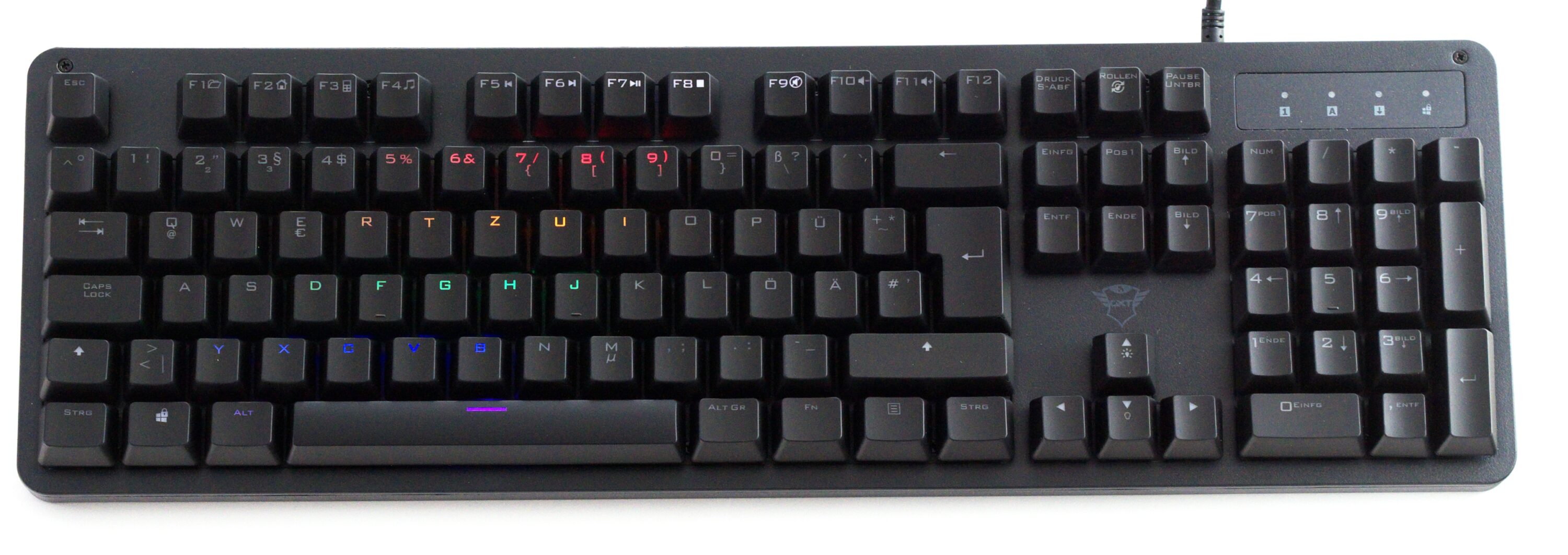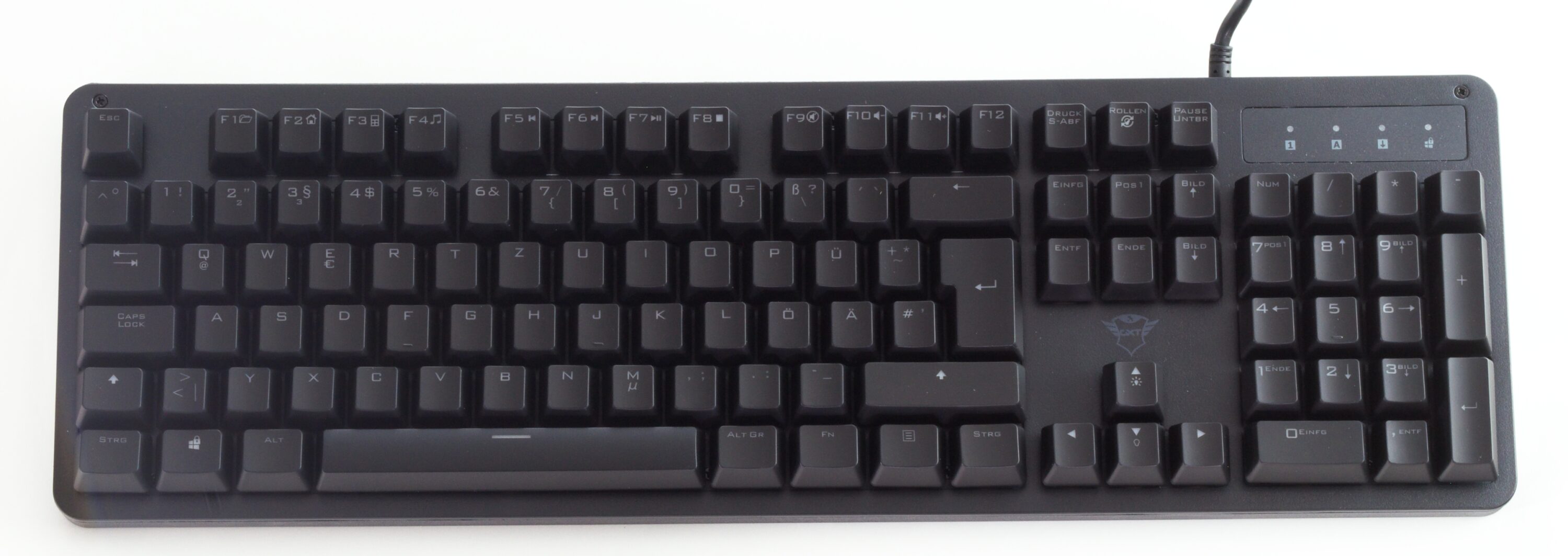 Das Layout der GXT 863 Mazz folgt dem gängigen Standard. Wie angesichts des günstigen Preises nicht anders zu erwarten war, verzichtet Trust bei der Tastatur auf Zusatztasten oder weitere Anschlüsse – und auch das Kabel ist fest installiert. Multimedia- und Beleuchtungs-Funktionen werden über eine Doppelbelegung mithilfe der FN-Taste realisiert.