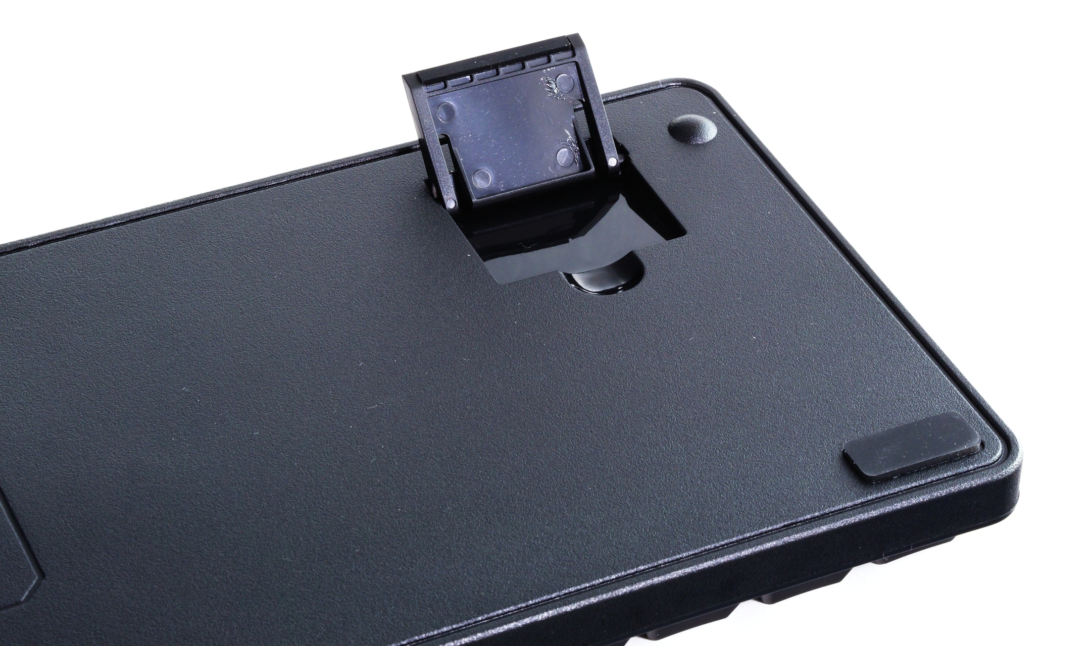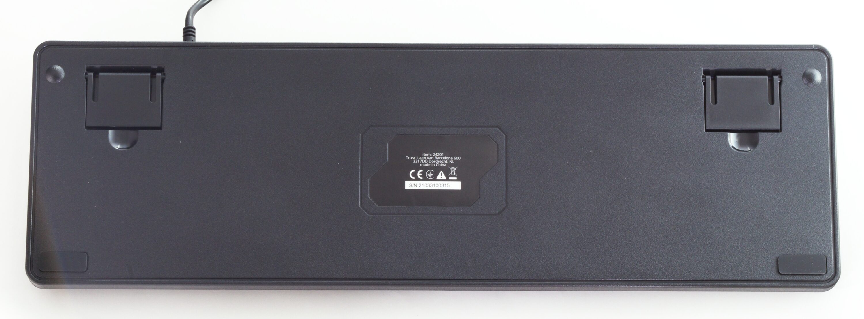 Das gesamte Gehäuse der Tastatur besteht aus leicht-rauem Kunststoff. Abseits eines GXT-Emblems über dem Nummernblock sind dabei keine Besonderheiten auf der Außenhaut zu finden: Die beiden üblichen Klappfüße an der Unterseite des Geräts sind vorhanden, Extras wie etwa eine Halterung für eine optionale Handballenauflage gibt es hingegen nicht.