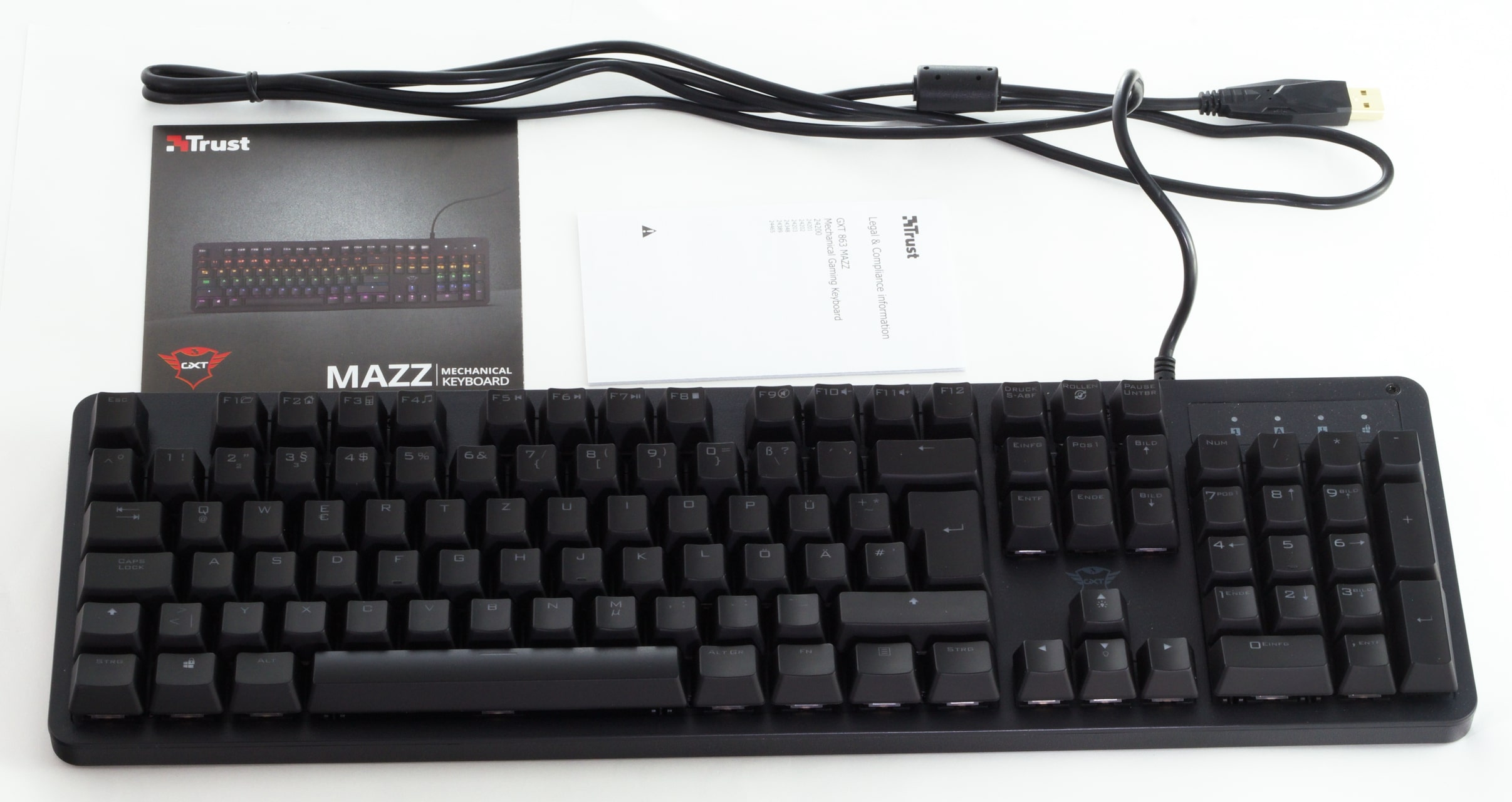 Beim Lieferumfang beschränkt sich Trust bei der GXT 863 Mazz auf das Nötigste. Die Tastatur wird in einem bunt bedruckten Karton geliefert; neben dem Gerät selbst liegen lediglich ein Hinweisblatt mit rechtlichen Informationen sowie eine Anleitung bei, die die wichtigsten Funktionen erklärt.