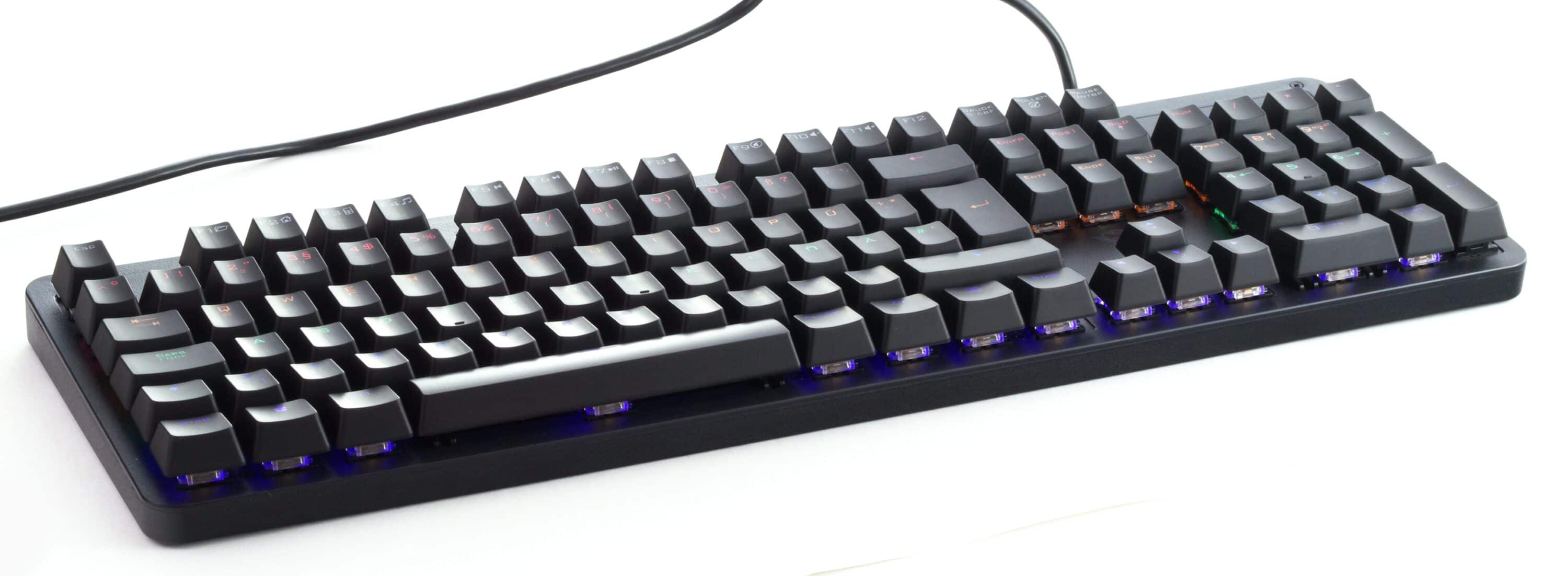 Eine gu00fcnstige Tastatur mit mechanischen Switches und bedingt-mehrfarbiger Beleuchtung