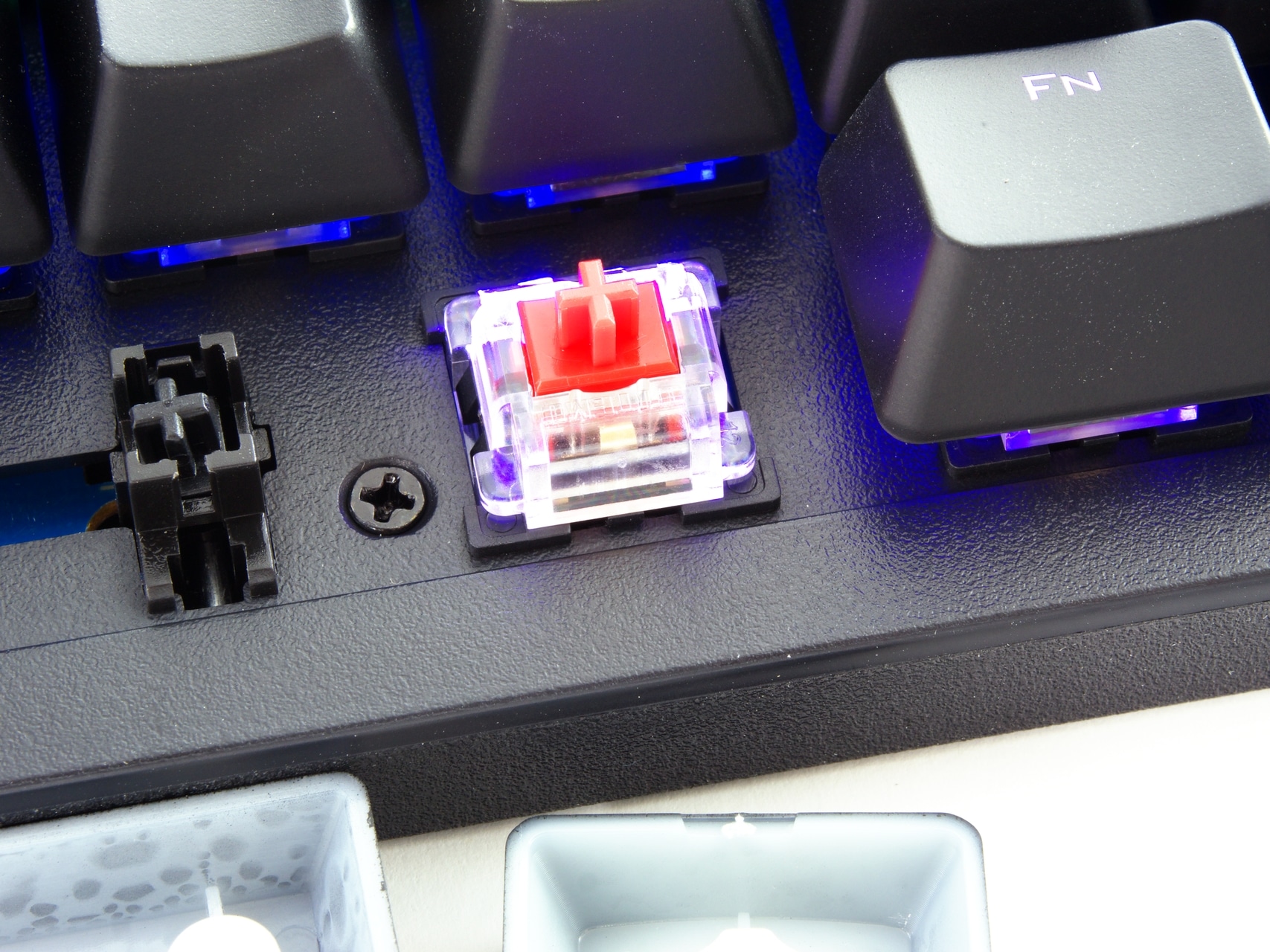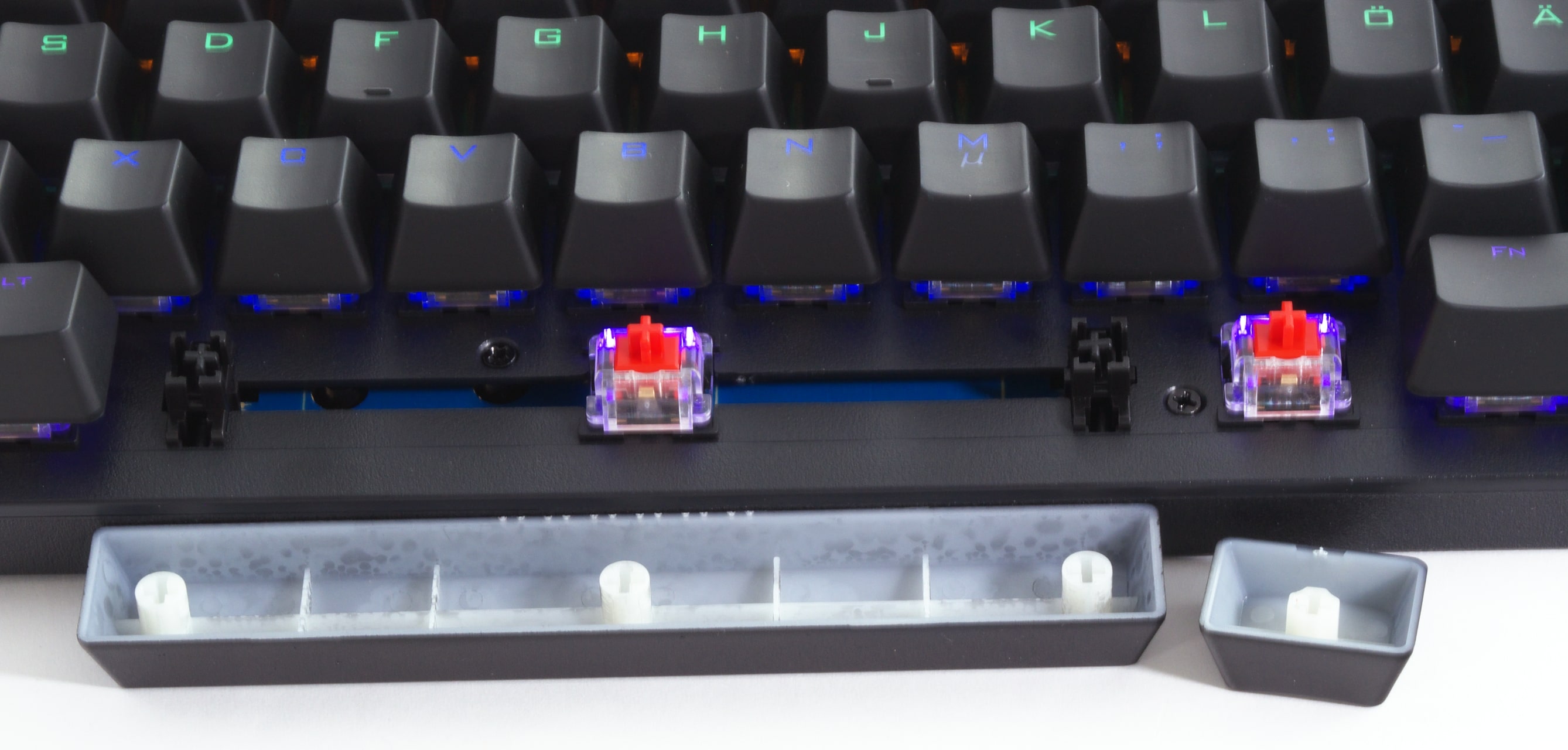 Das Tippgefühl auf den verbauten Outemu-Red-Switches finden wir angenehm. Den beworbenen, linearen Auslöseweg können wir bestätigen, und ganz im Gegensatz zu den günstigen Rubberdome-Tastaturen sind die Switches auch nicht schwammig. Im Vergleich zu Cherry Red-Switches ist das Tippgefühl natürlich leicht verändert, doch dürfte das reine Gewöhnungssache sein.