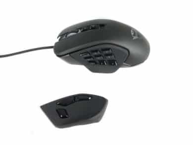 Nun kommen wir schon direkt zu der ersten Besonderheit. Beide Seitenteile der Maus lassen sich durch beiliegende Stücke ersetzen. Das erste Teil der Daumenseite bietet ganze neun Zusatztasten, während das zweite Stück lediglich 3 Tasten bietet und so auch eine schmalere Maus ermöglicht. Für die andere Seite gibt ebenfalls zwei Teile. Das eine bietet eine zusätzliche Zeigefingerablage, die die Maus deutlich größer macht. Das zweite Teil sorgt dafür, dass die Maus entsprechend schmaler wird.