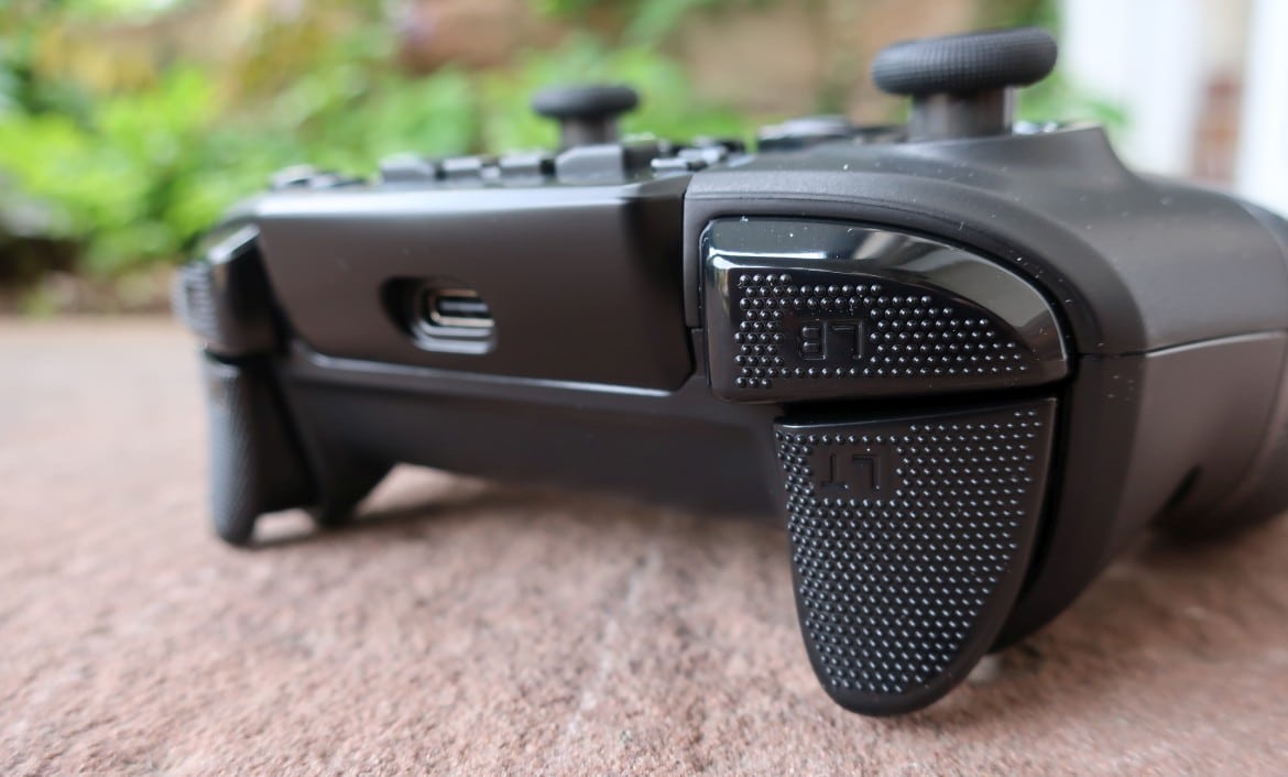 Dafür finden sich auf der Rückseite des Controllers allerdings zwei zusätzliche Knöpfe, die frei konfiguriert werden können. Besonders praktisch: Mithilfe der Kontrolleinheit an der Oberseite der Controller-Front lassen sich bis zu vier verschiedenen Konfigurationen für die Zusatztasten direkt auf dem Controller abspeichern.