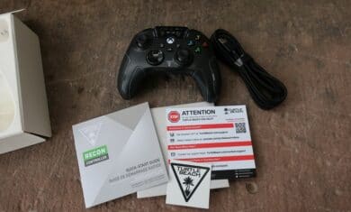 Im Vergleich zum etwas teureren PowerA FUSION Pro 2 (unser Test) fällt der Lieferumfang des Turtle Beach Recon Controller überschaubarer aus. Im Inneren des Pappkartons finden neben dem Gamepad selbst lediglich ein drei Meter langes USB-A-auf-USB-C-Kabel, sowie ein Pappschuber samt Schnellstartanleitung und Aufkleber mit Herstellerlogo Platz. Auf eine Transporthülle oder sonstige Inhalte (wie beispielsweise austauschbare Analog-Sticks oder ähnliches) müsst ihr also leider verzichten.