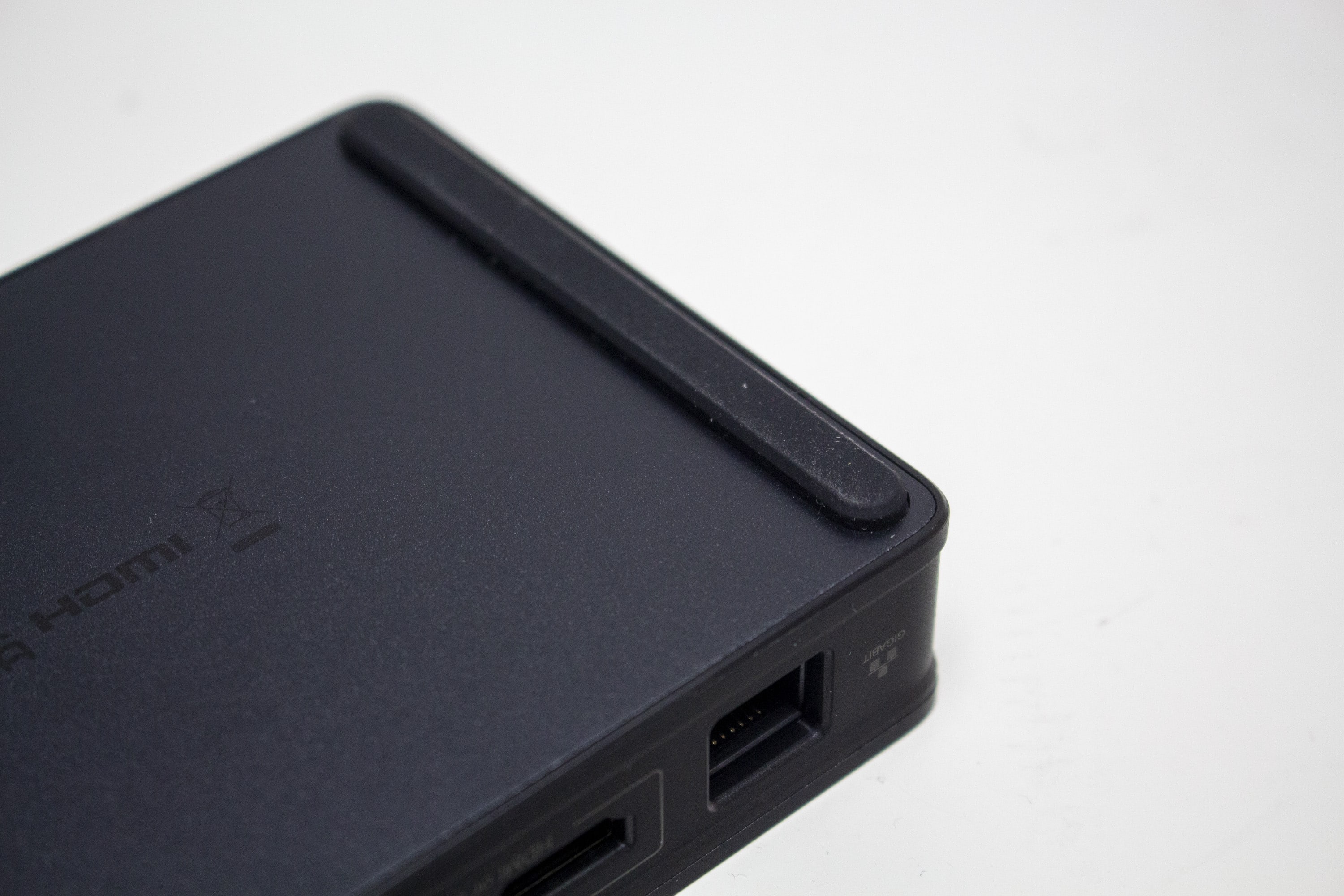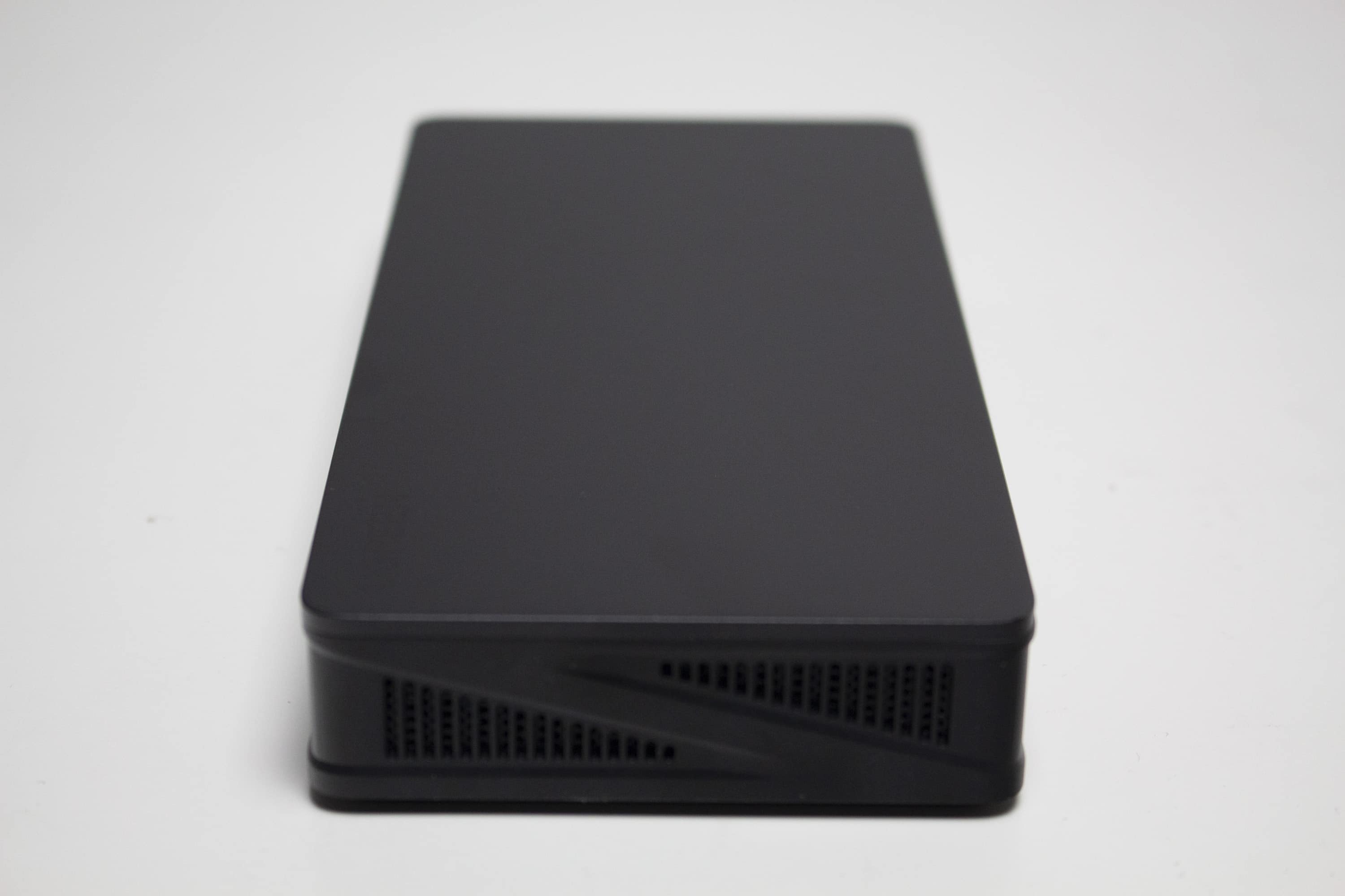 Als Material für das Gehäuse der Dockingstation setzt UGREEN auf Aluminium. Das Gehäuse wurde zur Verbesserung der Optik zudem schwarz-grau lackiert. Dadurch wirkt die Dockingstation sehr schlicht bzw. zeitlos und dürfte auf jedem Schreibtisch unauffällig platziert werden können. Seitlich verfügt das Gerät noch über vier Belüftungsöffnungen, die eine passive Kühlung der inneren Bauteile ermöglichen sollen. Zuletzt stattet UGREEN die Unterseite noch mit zwei langen Gummistreifen aus. Diese verhindern Kratzer auf der Dockingstation bzw. dem Untergrund und sorgen für einen rutschfreien Stand der CM615.