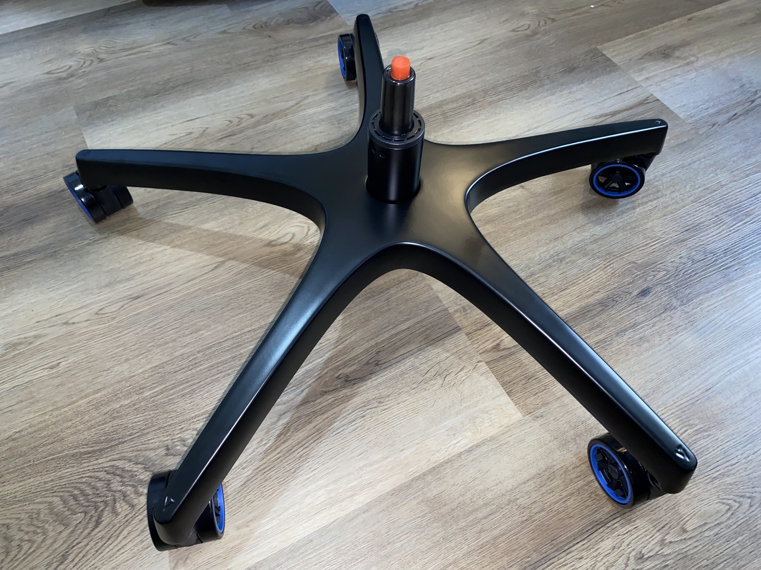 Für den Aufbau des Stuhls haben wir etwa 15 Minuten gebraucht. Für den ersten Teil muss man die Rollen in Felgen-Optik in den Sternfuß reindrücken und die Klasse 4 Gasdruckfeder in das passende Loch stecken. Hiernach montiert man den Kipp- und Liftmechanismus an die Unterseite der Sitzfläche mit vier Schrauben. Dabei geht alles einfach und passend von der Hand. Im dritten Schritt wird die Sitzfläche auf die Gasdruckfeder gesetzt und eingerastet. Im letzten Schritt, hierbei etwas anders als bei anderen Herstellern, wird die Rückenlehne in die Halterung an der Sitzfläche gesteckt. Dabei ist etwas Vorsicht mit dem Leder gefordert, jedoch ein einfacheres, schnell umzusetzendes und am Ende auch schickeres Prinzip zur Montage. Zwei Schrauben an jeder Seite rein und schon ist man fertig, ohne zusätzliche Plastikabdeckung, die eventuell nicht richtig passt.