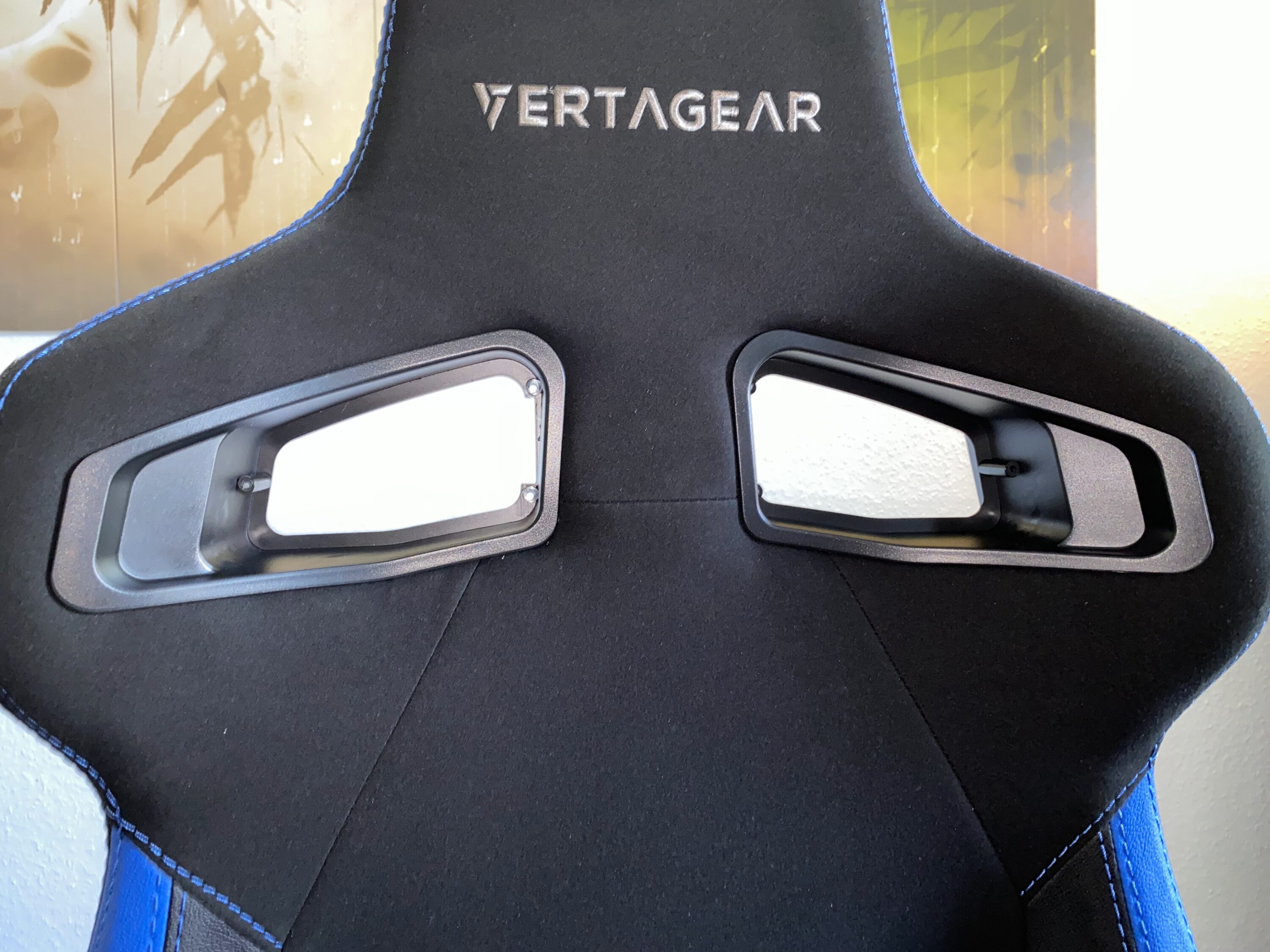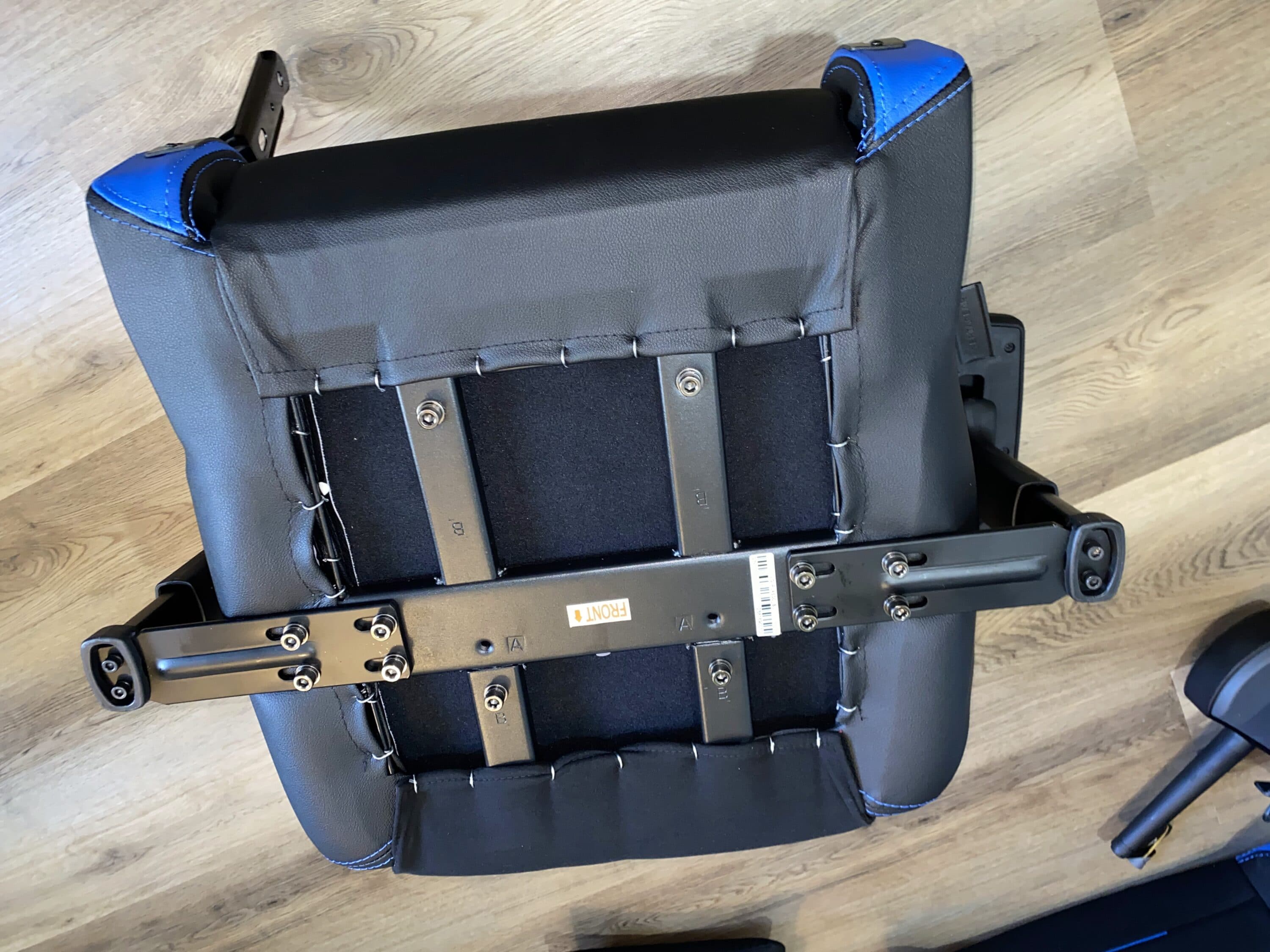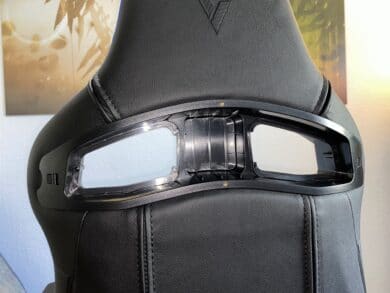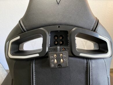 Optional gibt es dazu noch ein RGB-Kit zu montieren, auf das wir hier nochmal schnell eingehen. Zunächst wird die bereits vorhandene Abdeckung aus Plastik an den zwei Löchern an der Rückenlehne demontiert. Angefangen an der Rückseite werden mittig zwei Schrauben gelöst, dann die Plastikkappe an den Seiten aus den Klipps befreit. Danach muss noch auf der Vorderseite die Abdeckung mit jeweils drei Schrauben je Loch gelöst werden. Jetzt gelangen wir an den etwas herausfordernden Part der Montage: die Acryl-Platten. Diese werden einfach von der Rückseite aus in das Loch gesteckt – bei uns hat das aber nicht ganz auf Anhieb gepasst. Natürlich haben wir auf die Beschriftung der Seiten geachtet, aber die Platten müssen in einem speziellen Winkel mit ausreichend Kraft in die Halterung gedrückt werden. Hat man dies einmal geschafft, halten diese auch mehr als fest. Zuletzt müssen dann nur noch, wie in den Schritten davor, diesmal aber rückwärts, die neuen Plastikkappen mit RGB-Beleuchtung befestigt werden.