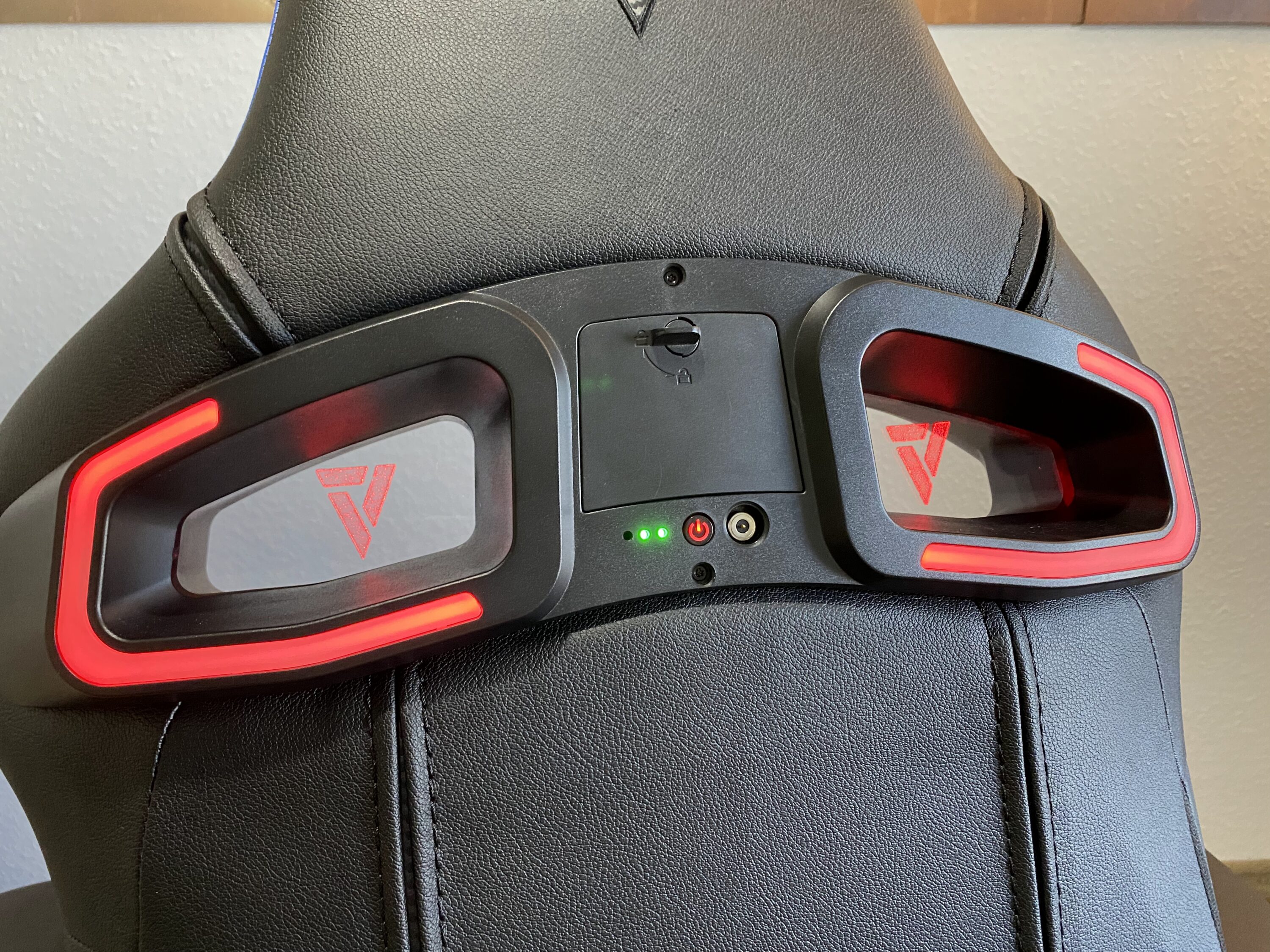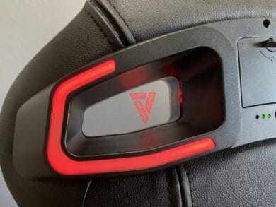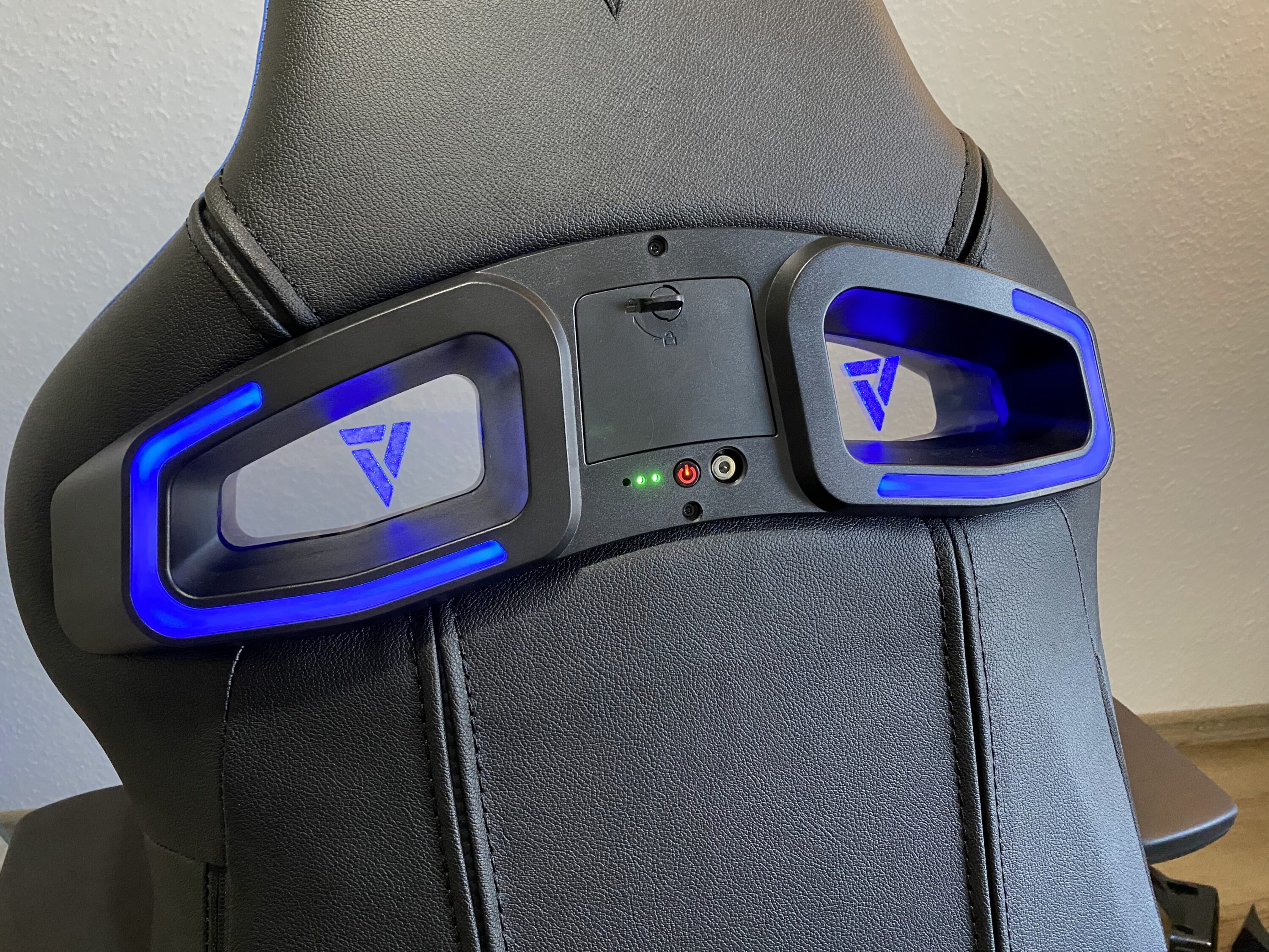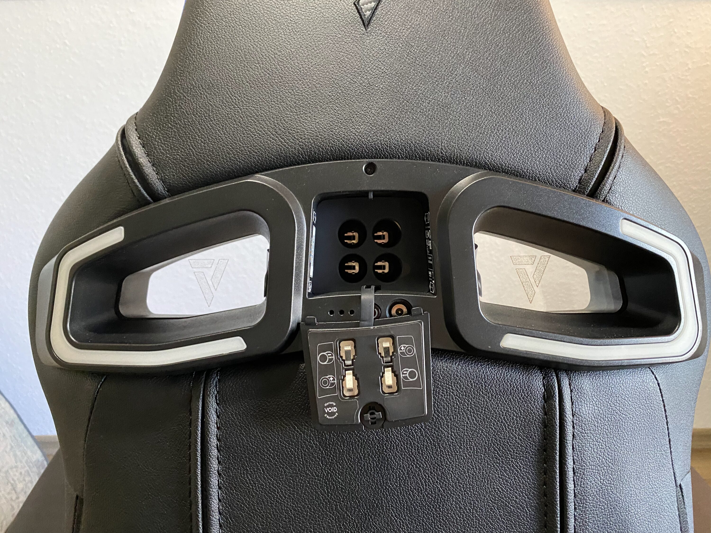 Das LED-Kit ist von der Verarbeitung und dem Design auf einem sehr hohen Level, welches wir nun versuchen widerzuspiegeln. Angefangen bei den Acryl-Platten mit Vertagear-Logo: diese sind massiv und wertig. Kratzer lassen sich nur durch grobe Fahrlässigkeit provozieren, da diese auch nach innen abgesetzt sind. Die Platten sowie ein auf beiden Seiten befindender LED-Ring beleuchten schließlich den Stuhl in RGB-Farben. Mittig in der Rückseite befinden sich ein Slot für vier großen Akkus, welche leider keinem typischen Standard entsprechen (aber problemlos nachgekauft werden können, Typ 18650), hinter einer kleinen Klappe, die man durch einfaches Aufklappen öffnen kann. Zudem befindet sich dort auch die Möglichkeit zum Laden.