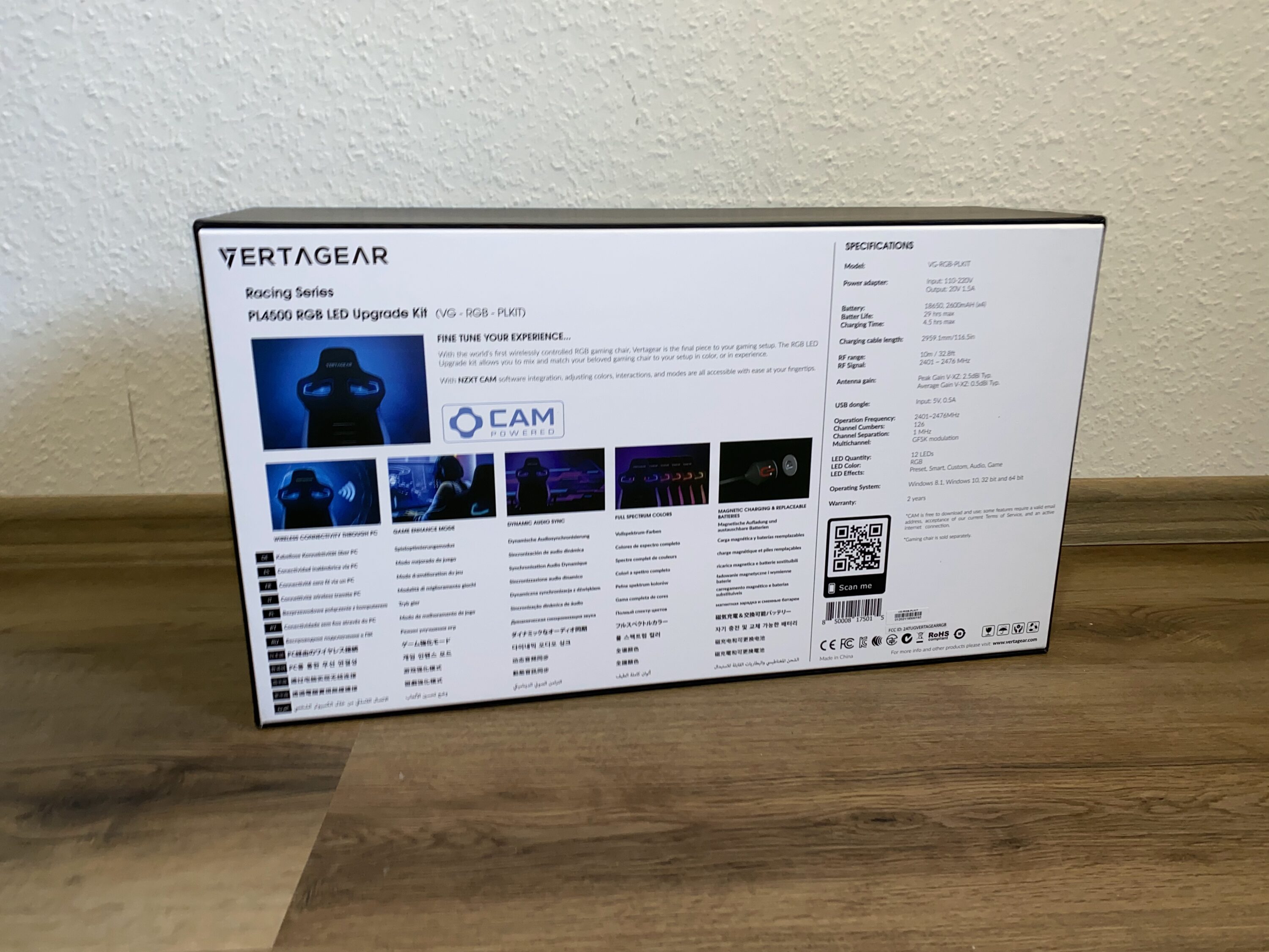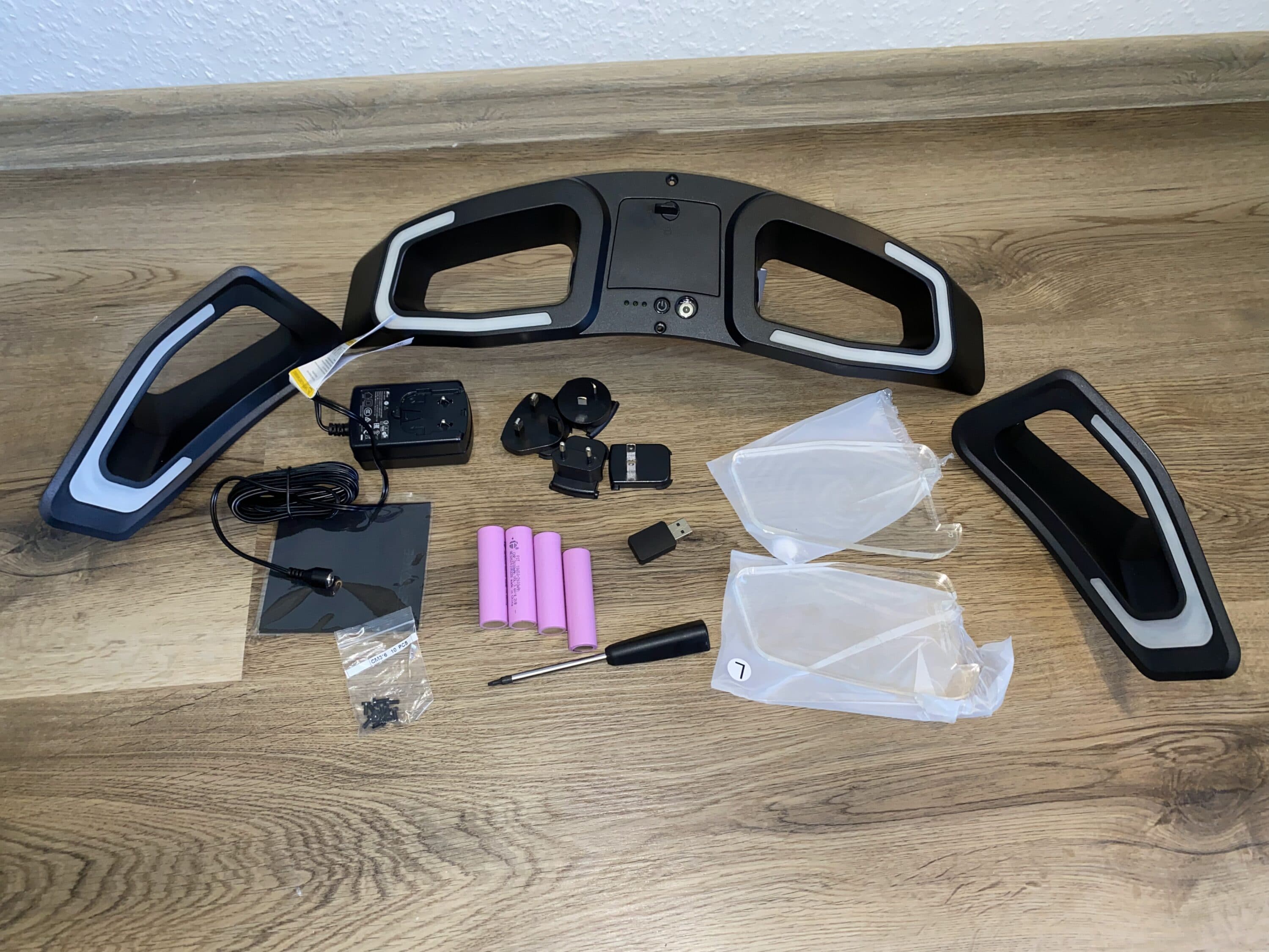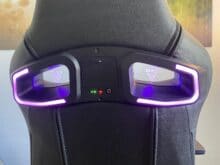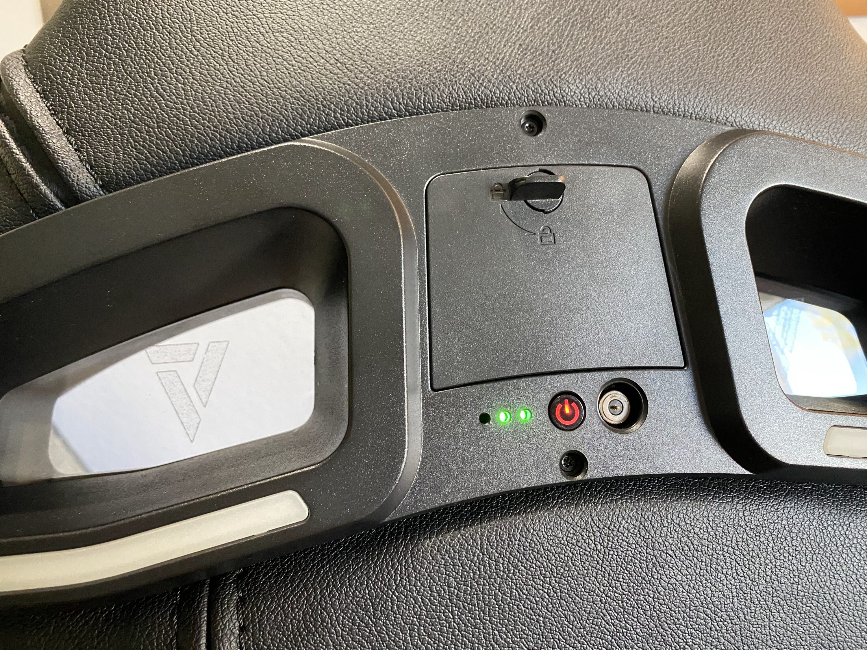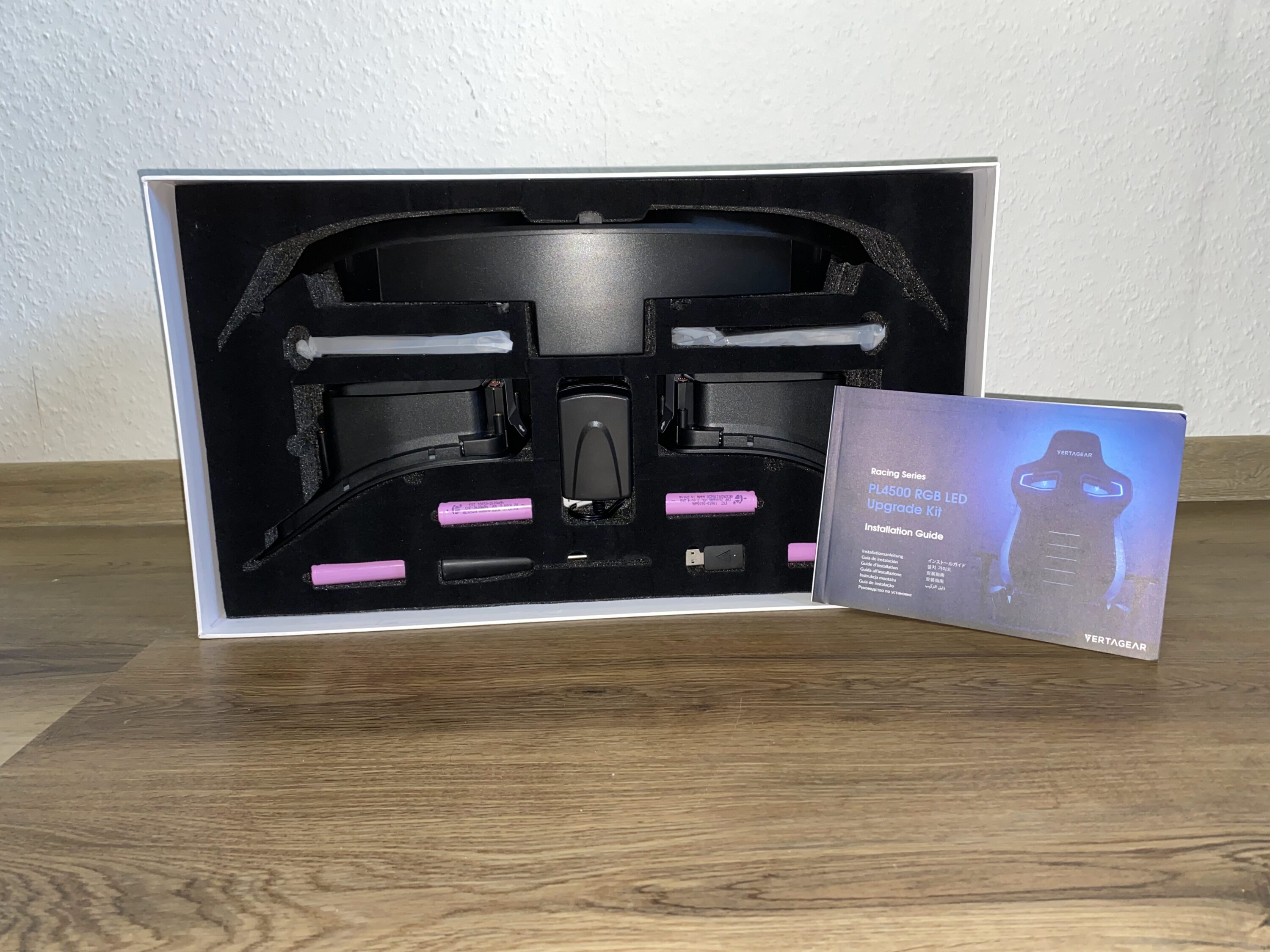 Das LED-Kit ist von der Verarbeitung und dem Design auf einem sehr hohen Level, welches wir nun versuchen widerzuspiegeln. Angefangen bei den Acryl-Platten mit Vertagear-Logo: diese sind massiv und wertig. Kratzer lassen sich nur durch grobe Fahrlässigkeit provozieren, da diese auch nach innen abgesetzt sind. Die Platten sowie ein auf beiden Seiten befindender LED-Ring beleuchten schließlich den Stuhl in RGB-Farben. Mittig in der Rückseite befinden sich ein Slot für vier großen Akkus, welche leider keinem typischen Standard entsprechen (aber problemlos nachgekauft werden können, Typ 18650), hinter einer kleinen Klappe, die man durch einfaches Aufklappen öffnen kann. Zudem befindet sich dort auch die Möglichkeit zum Laden.