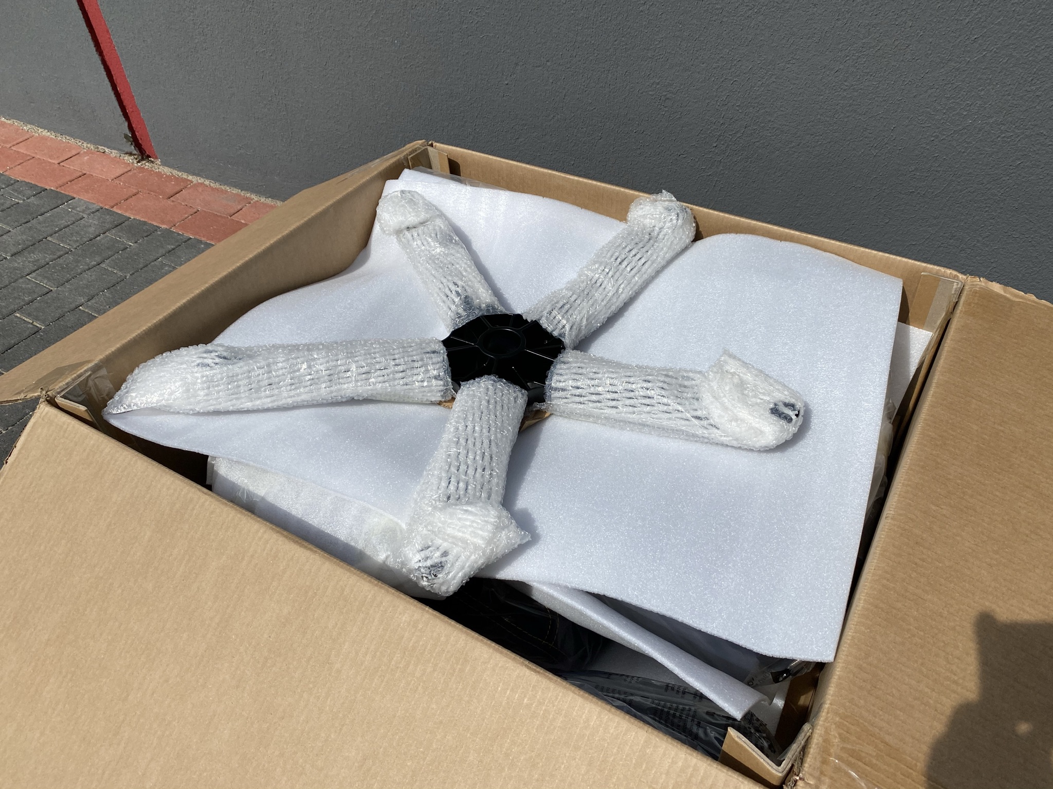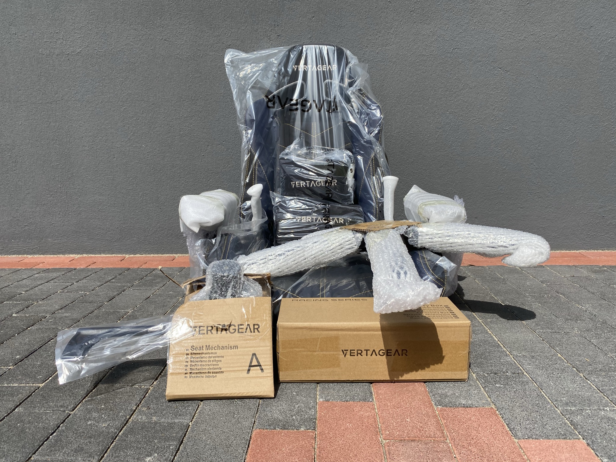 Geliefert wird der Gaming-Stuhl in einem 28 kg schweren und sehr großen braunen Karton. Von außen wurden das Firmen-Logo und der Produktname des Stuhls in schwarz abgehoben. Nachdem dem Öffnen des Kartons kann man einen ersten Blick auf die einzelnen Elemente werfen. Hier wurde alles in einer klassischen Art und Weise mit Plastikfolie und Plastikschaumstoff verpackt und gesichert. Dabei wurden die für Beschädigungen anfälligsten Elemente wie die Armlehnen, die Base und die Scharniere an der Sitzfläche für die Rückenlehne besonders vorgesorgt. Hat man das ganze Plastik entfernt, geht es auch Ruck-zuck mit der Montage weiter.