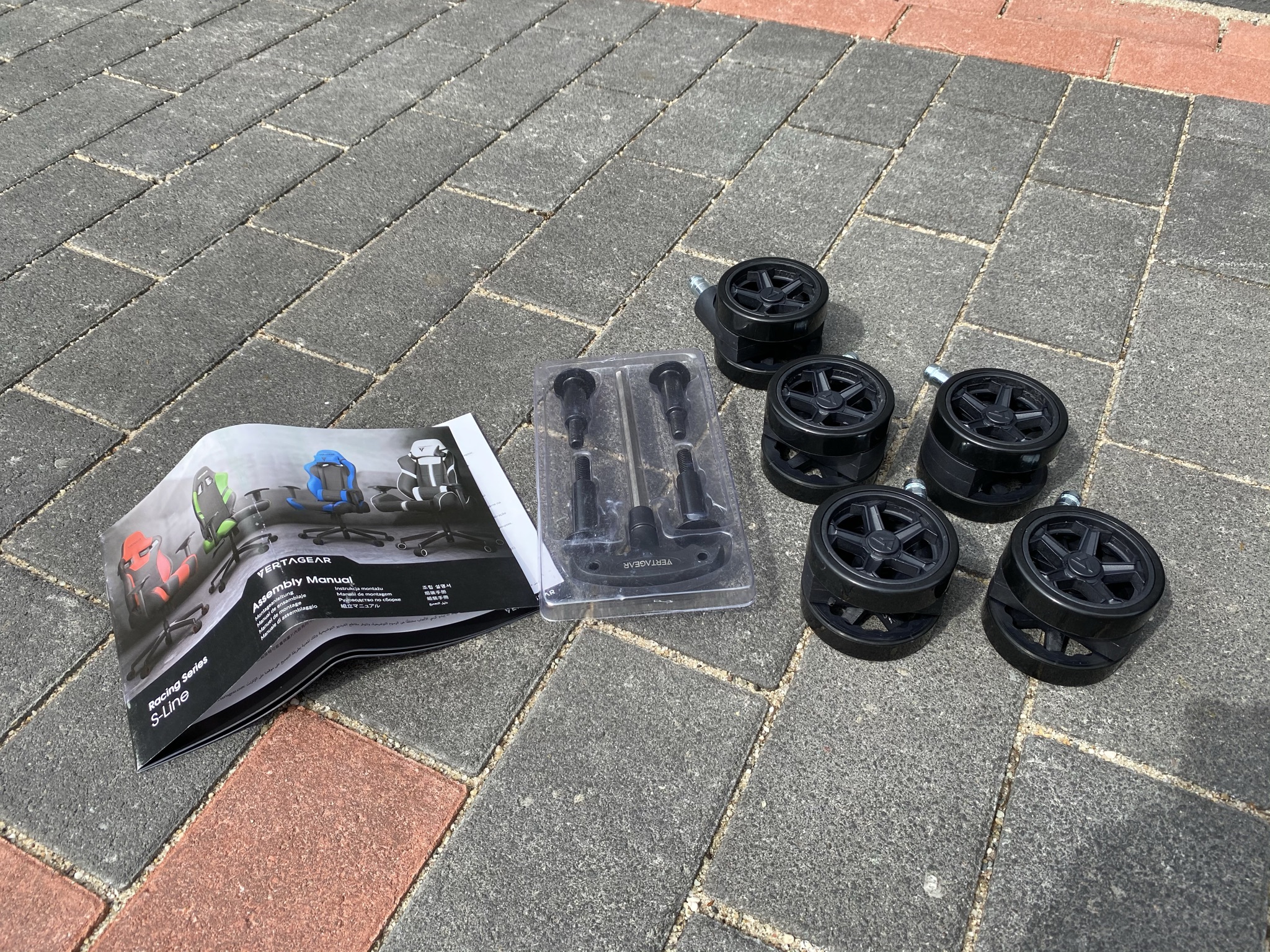 Für die Montage legt Vertagear eine Montageanleitung und Montagematerial bestehend aus 4 etwas größeren Schrauben und einem Inbusschlüssel mit Griff – Nach der Montage lässt sich dieser prima für andere aufbauten nutzen. Die vier mitgelieferten Schrauben dienen der Befestigung der Rückenlehne mit der Sitzfläche. Die für den Kipp-Mechanismus benötigten Schrauben befinden sich schon vormontiert an der Unterseite der Sitzfläche, diese müssen demnach eben gelöst werden, um dann den Kipp-Mechanismus zu befestigen. An der Sitzfläche wurden ebenfalls direkt die Armlehnen vormontiert, sodass man sich hier einiges an Zeit zusätzlich spart.