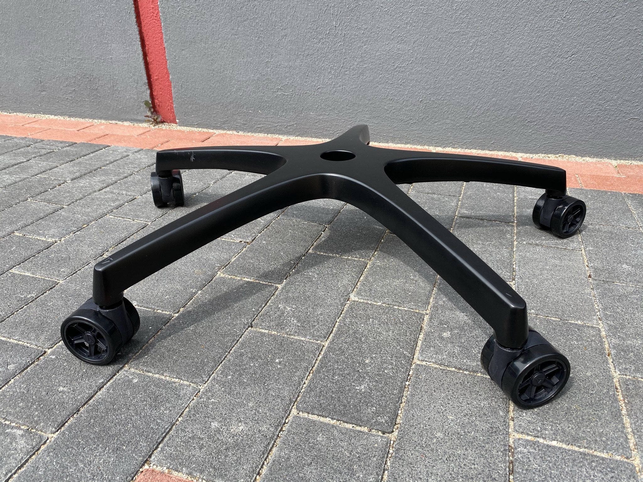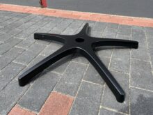 Als Letztes werfen wir noch mal einen genaueren Blick auf die Base samt den Rollen. Die 5-Stern-Basis besteht aus Aluminium mit einer schwarz-matten Lackierung. Leider ist diese bei uns mit deutlich sichtbaren Kratzern an einen der Füße geliefert worden – Wir hoffen, dass es nur bei unser getesteten Produkt der Fall ist. Wie bei der Rückenlehne gibt es für die Base ein optionales RGB-Kit zu erwerben. Abgesehen davon steckt in der Mitte natürlich eine Gasdruckfeder der Klasse 4. Mit dieser lässt sich dann variabel die Höhe des Stuhls mit einem kleinen Hebel an der rechten Seite einstellen. Seltsamerweise wurde hier auf eine Plastikabdeckung verzichtet, womit der Lift samt Schmiere offen steht. Die Penta RS1 Caster Rollen sehen optisch sehr schön aus und ähneln der Optik nach klassischen Sportfelgen. Mithilfe einer Polyurethan-Beschichtung lassen sich die Rollen sehr geschmeidig über Oberflächen bewegen – Wie wir es in dieser Art noch nicht erlebt haben.