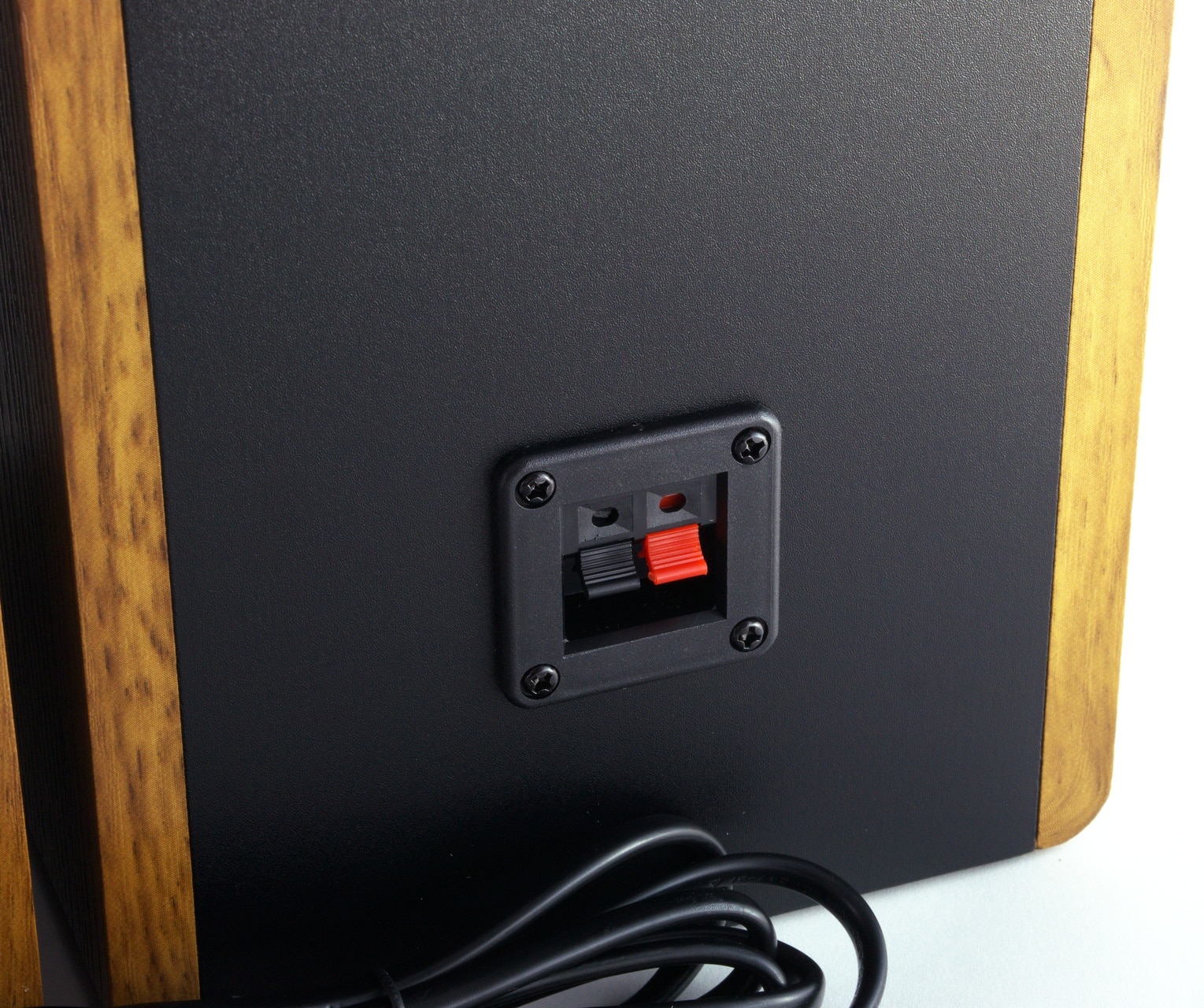 Wie üblich befindet sich das Anschlussterminal der Lautsprecher an deren Rückseite. Der Neben-Lautsprecher hat hier nur die beiden Kabelklemmen für das Audiosignal verbaut, die Master-Box bietet hingegen zusätzlich die beiden Cinch-Buchsen, einen Power-Schalter und das Stromkabel. All das ist auf der vorher erwähnten, schwarzen Metallplatte befestigt.