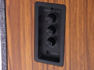 Die drei Drehknöpfe sowie eine 3,5-mm-Klinkenbuchse befinden sich auf der rechten Seite des Lautsprechers. Das ist ein guter Kompromiss zwischen der potentiell störenden Optik, wenn die Bedienelemente an der Vorderseite untergebracht sind, und der schlechten Erreichbarkeit, wenn sie sich an der Rückseite befinden.
