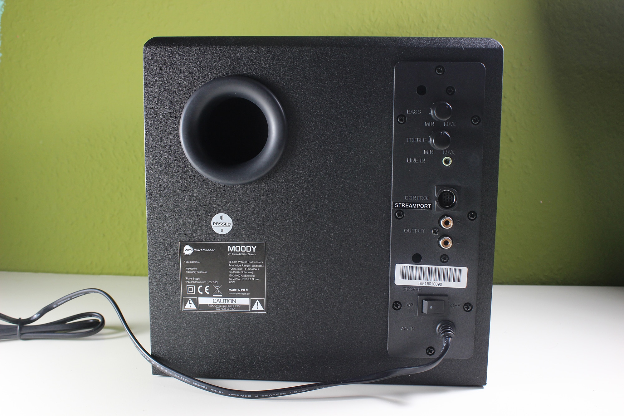 Der Subwoofer hingehen ist ein wenig größer und besteht aus Echtholz. Damit kommt er auch auf ein Gewicht von 4 KG. Mit den Abmessungen 24,5 x 24,8 x 27,5 cm ist der Subwoofer recht kompakt gehalten und lässt sich einfach in jede Ecke stellen. Die Anschlüsse für die beiden Boxen, den Streamport und die Audioquelle befinden sich auf der Rückseite des Subwoofers. Dadrüber findet man außerdem Drehregler für Bass und Höhen sowie einen Power-Schalter für die komplette Abschaltung des Wavemaster Moody BT 2.1 Soundsystems.