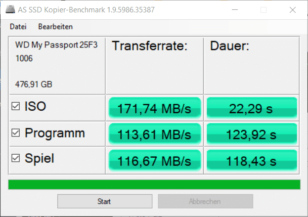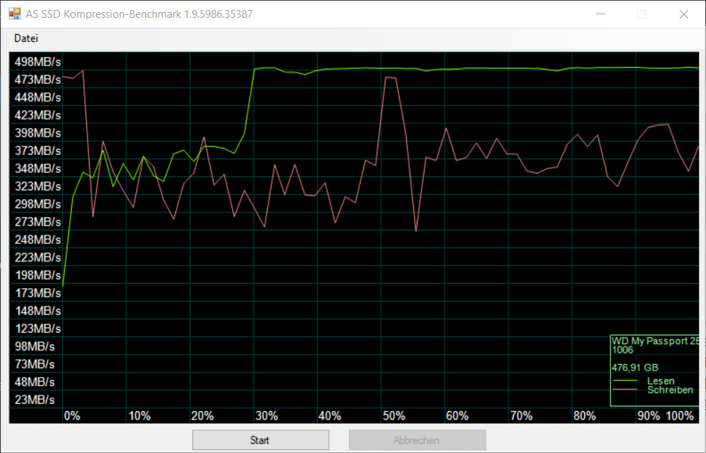 Die ermittelten Werte liegen beim Lesen maximal bei etwa 500 MB pro Sekunde, beim Schreiben bei etwa 520 MB/s. Damit reicht sie nicht ganz an Konkurrenzprodukte an, ist aber auf einem ähnlich Niveau wie interne SATA-SSDs. Diese erreichen Spitzengeschwindigkeiten von 560 MB/s. Problematisch ist aber leider die schlechte Abführung der Abwärme.