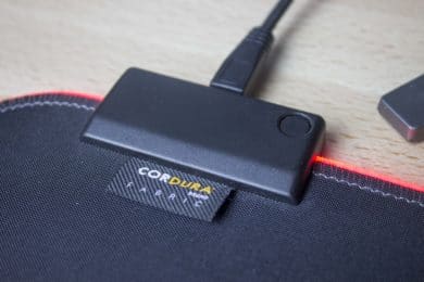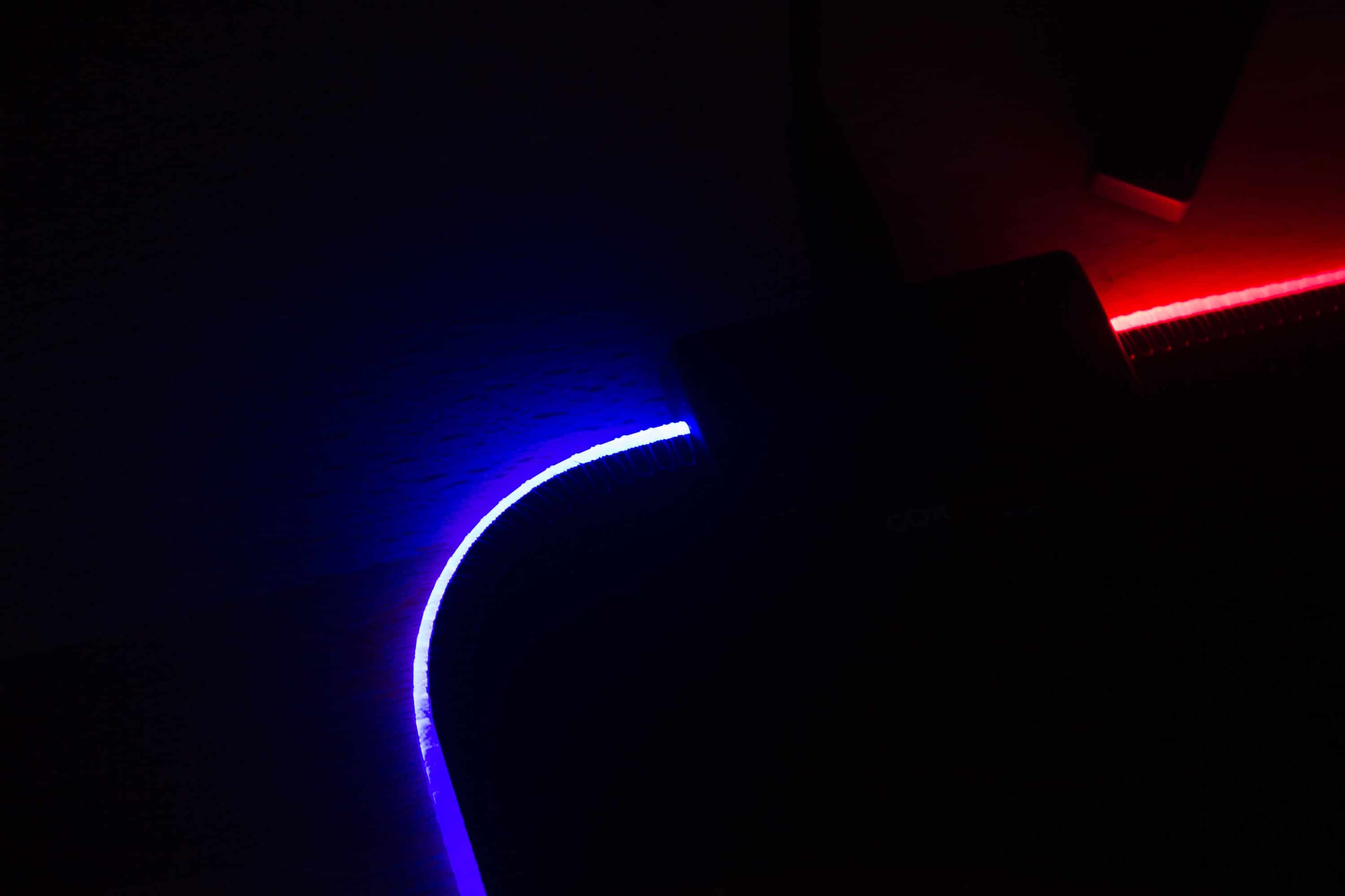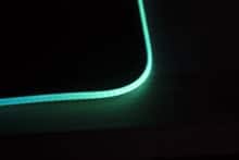 Beleuchtet wird das Mauspad aber nur über zwei LEDs am Kabeleingang. Dadurch lässt die Beleuchtung etwas zu wünschen übrig. Besonders bei zwei unterschiedlichen Farben fällt die ungleichmäßige Beleuchtung auf. Trotzdem macht das XPG Battleground XL Prime einiges her.