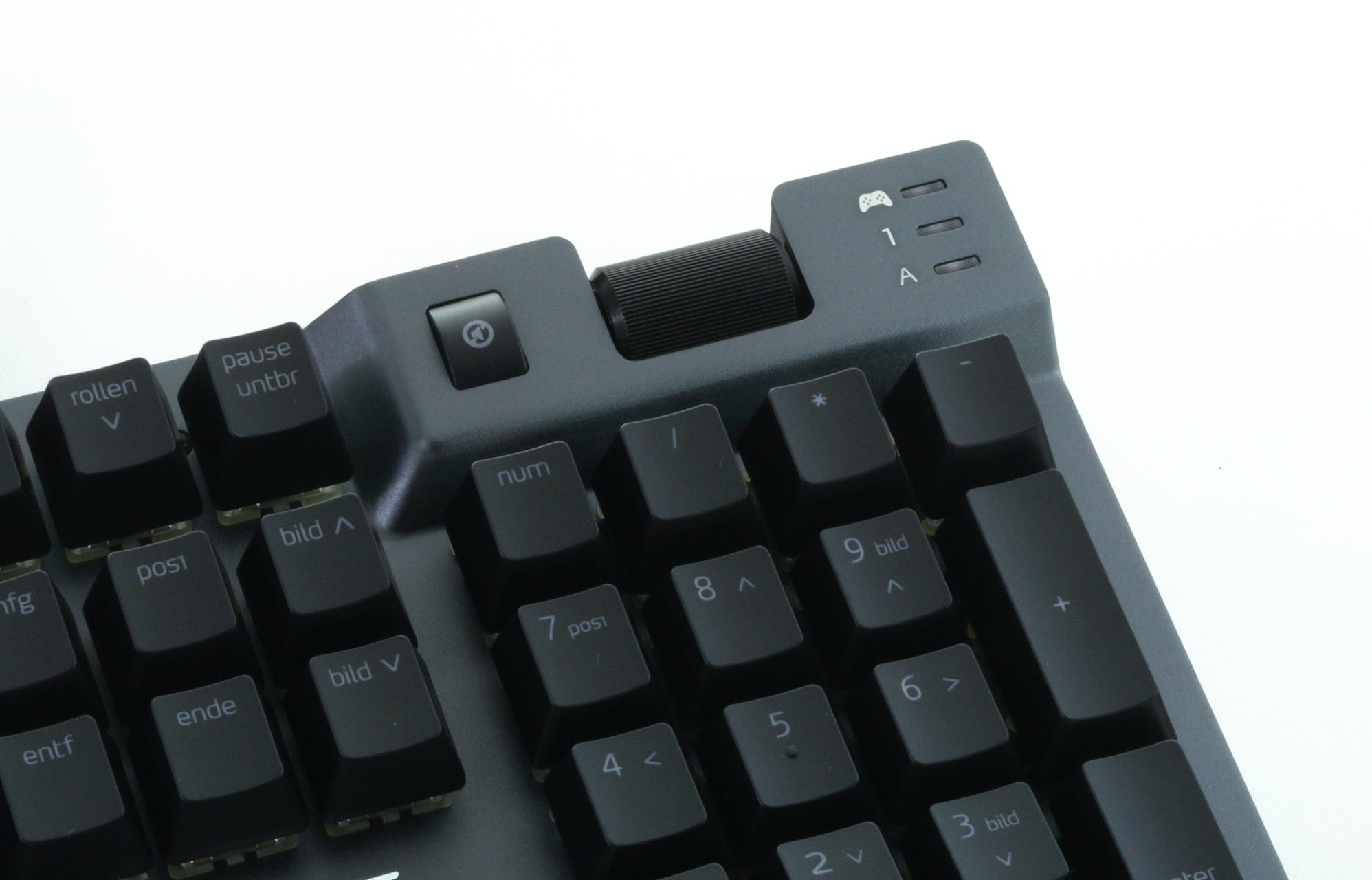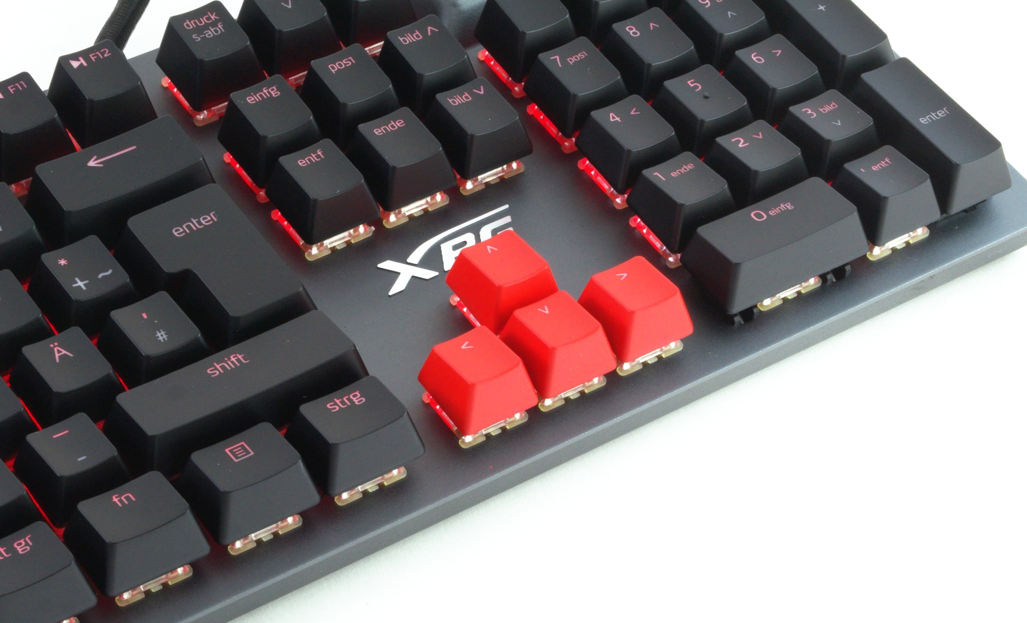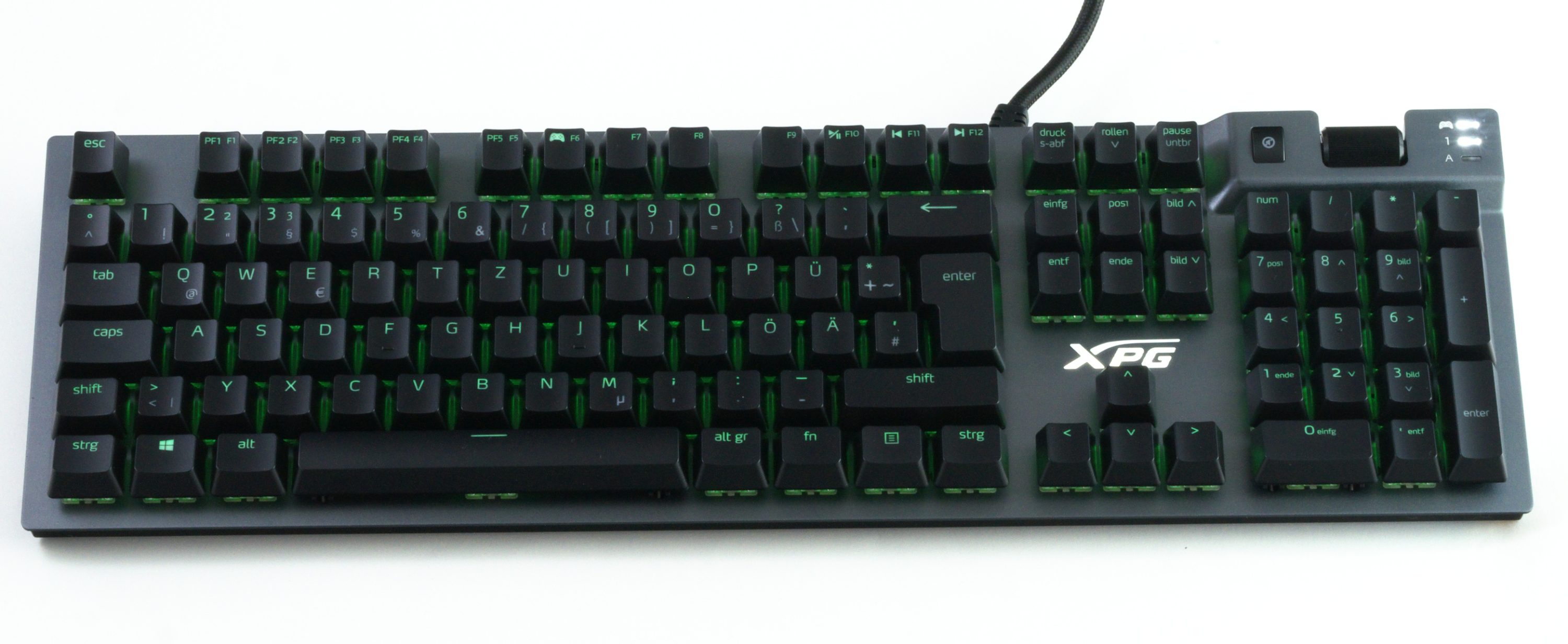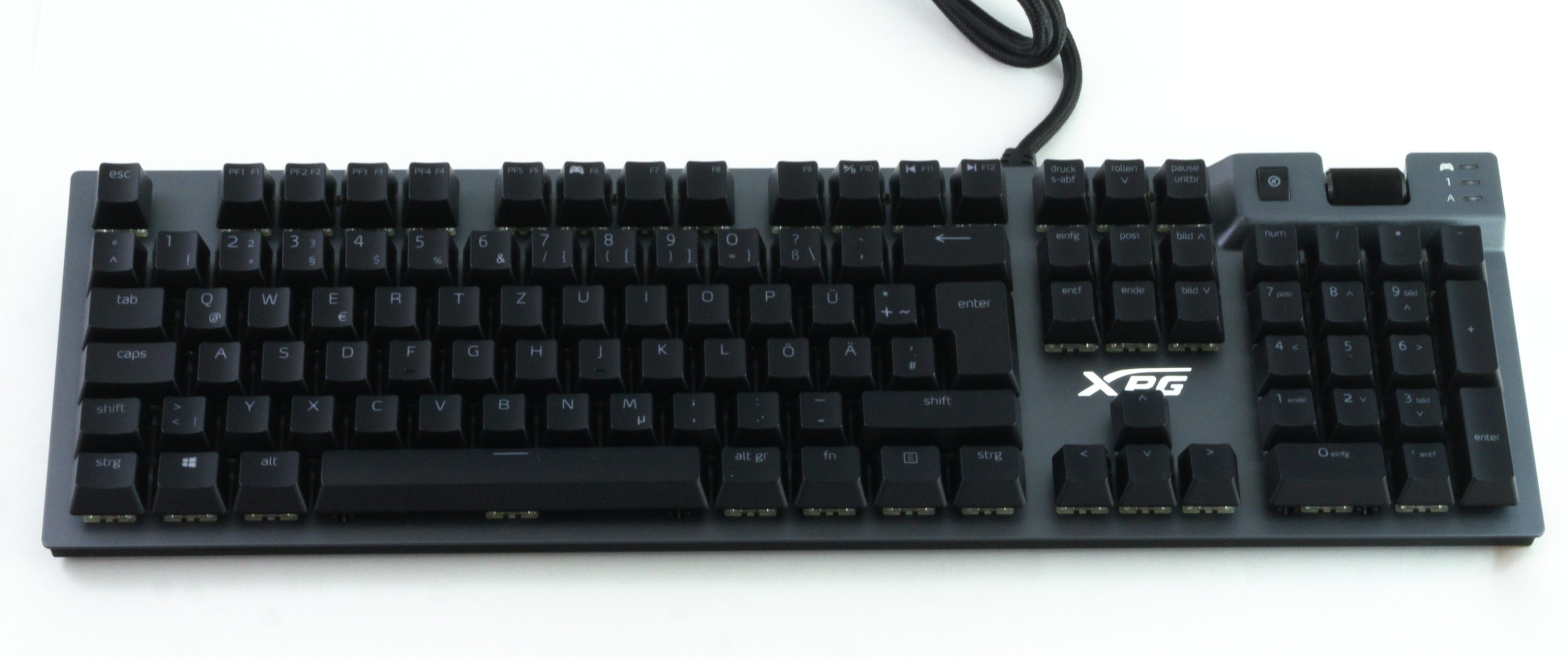Absolut tadellos ist die Praxis der XPG Summoner dann aber doch nicht, denn leider hat sich das Unternehmen eine kleine Abweichung vom gängigen Standard erlaubt. Die drei Status-LEDs der Tastatur dienen nämlich nicht, wie üblich, zur Anzeige des Numpads, von Capslock und der Rollen-Funktion. Stattdessen zeigt die dritte LED statt der Rollen-Funktion den Game-Mode an, der die Windows-Taste sperrt. Zwar kann man „Rollen“ auch weiterhin verwenden, doch muss man eben immer ausprobieren, in welchem Zustand man sich gerade befinden. Sonderlich tragisch ist das nicht, insbesondere da die Rollen-Funktion ohnehin nur von wenigen verwendet wird. Wer die Funktion oft benutzt, der sollte diesen Punkt aber bedenken.
