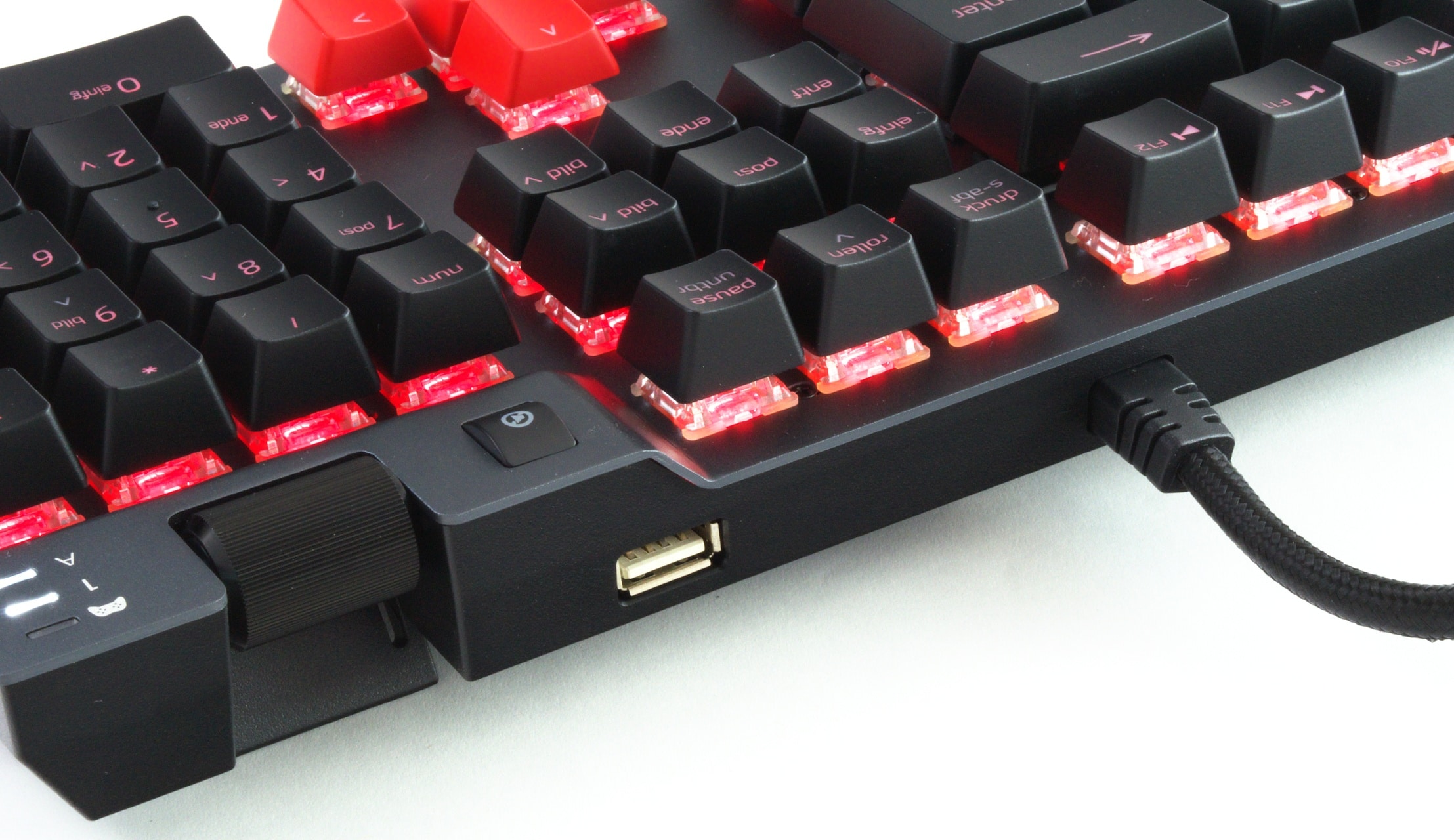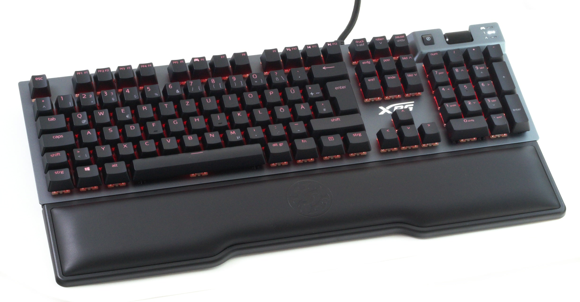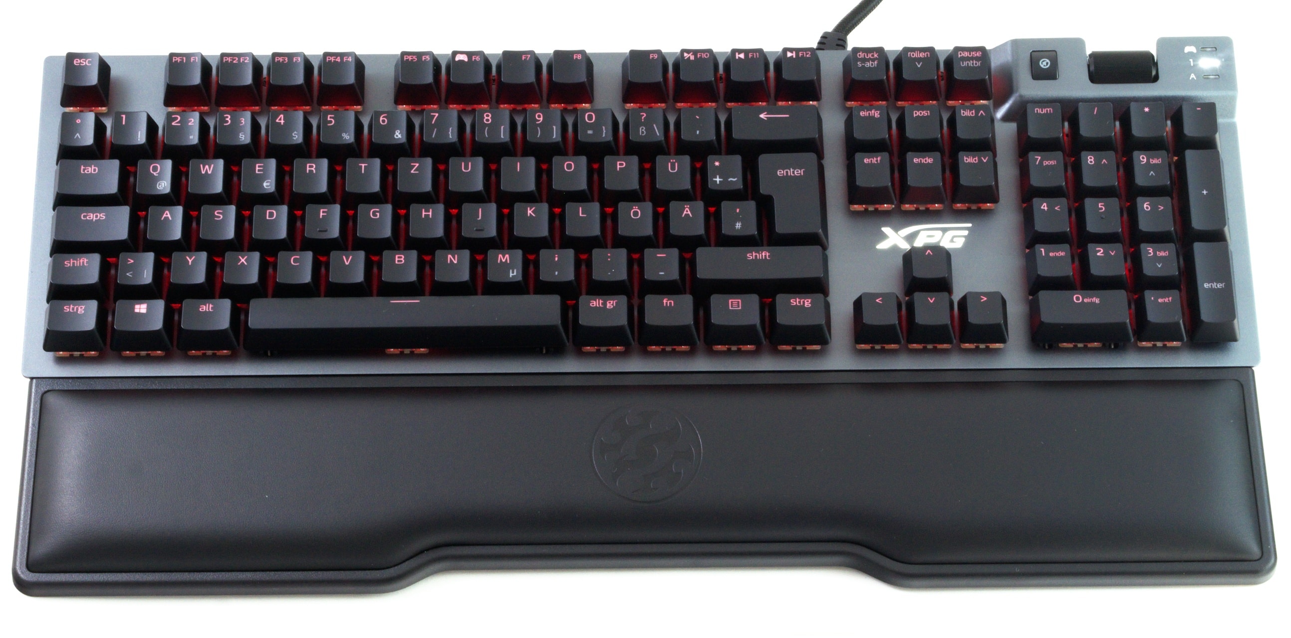 Dasselbe trifft auch bei der XPG Summoner zu: Das Kernpaket ist ähnlich zu dem vieler anderer Tastaturen, vom Rest hebt sie sich lediglich durch einige Akzente ab. Konkret sind das das Lautstärkerad, der USB-Port am Gerät und, besonders wichtig, die Kunstleder-Handballenauflage. Letztere ist für uns das größte Feature der Tastatur, denn die Lösung ist ausgesprochen bequem und sorgt auch nach langer Zeit für ein ermüdungsfreies Tippen.
