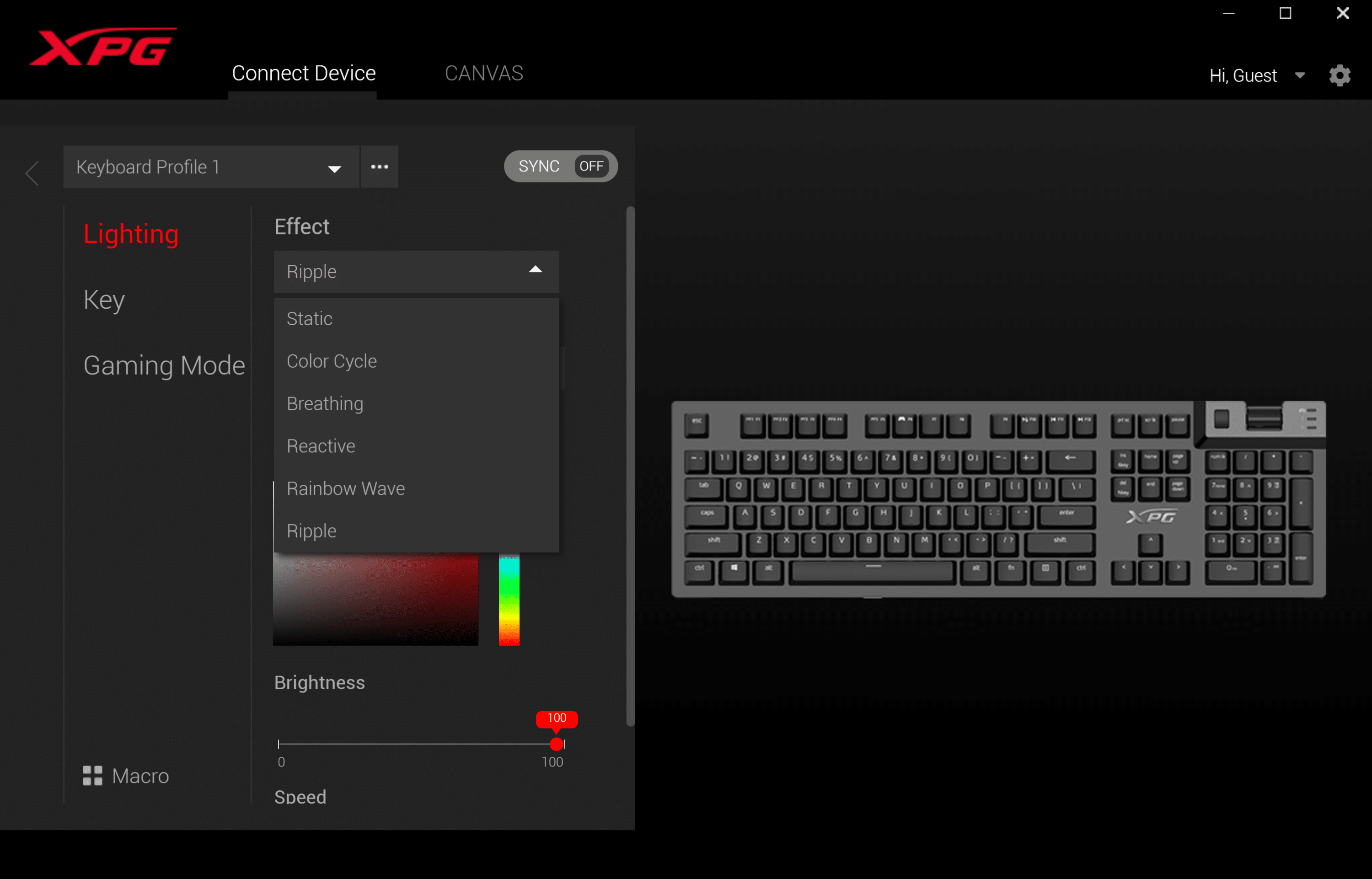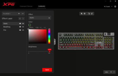 Über die Canvas-Funktion bietet die XPG Summoner zudem eine Möglichkeit, um die Beleuchtung direkt über die Software zu steuern. In diesem Modus können die einzelnen Lichteffekte gleichzeitig auf verschiedene Tasten gelegt und somit kombiniert werden. Achtung: Die unterste Ebene hat die höchste Priorität – das kann anfangs für Verwirrung sorgen.