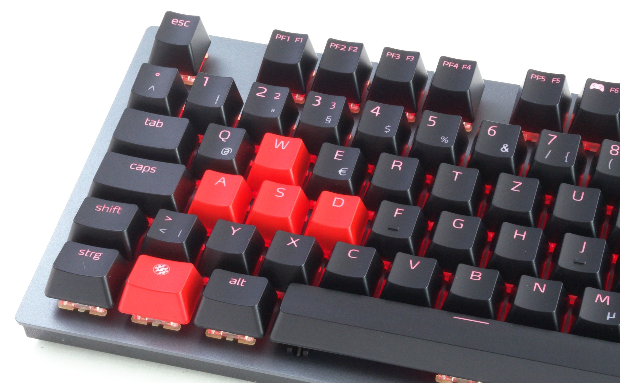 Auch die Beleuchtung konnte uns im Test überzeugen: Sie ist hell und recht gleichmäßig. Wie üblich werden untere Beschriftungen dabei aber sichtbar schwächer beleuchtet als die Hauptbeschriftungen. Dieses Problem tritt bei allen Tastaturen auf. Ein Fiepen der Ansteuerungselektronik konnten wir nicht vernehmen.