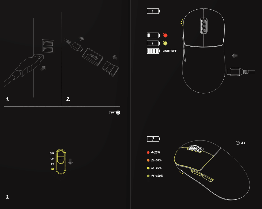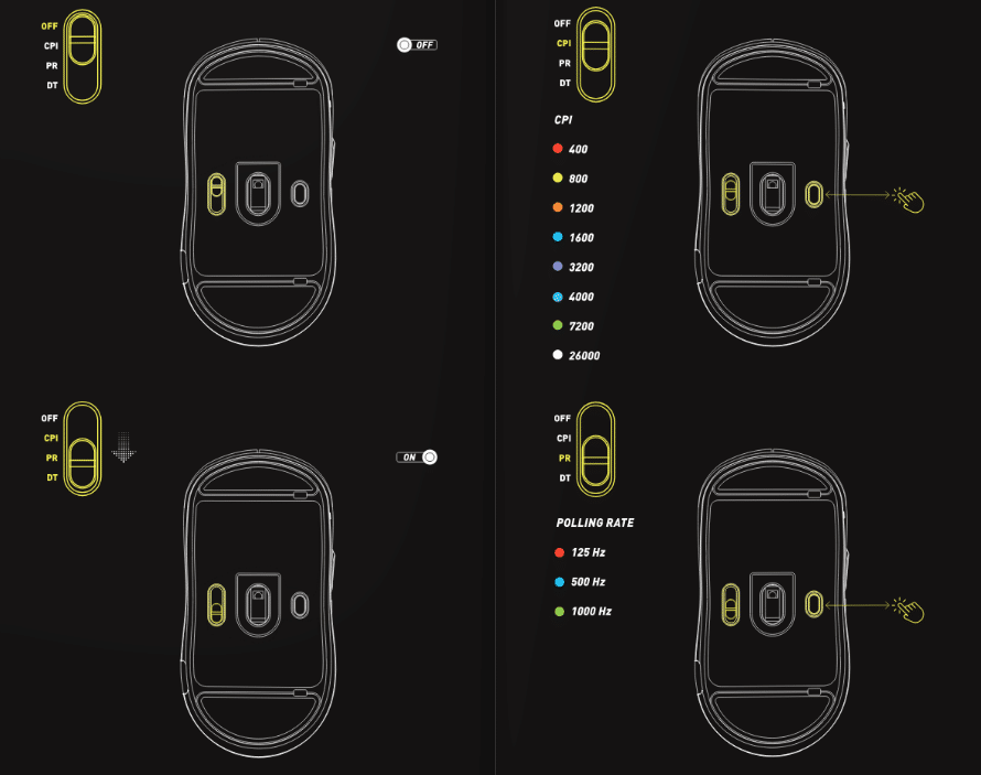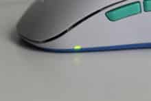 Um die Maus nach seinen Wünschen anzupassen, gibt es auf der Unterseite einen Schieberegler und einen dedizierten Knopf. Hier kommt die Anleitung ins Spiel, denn dort sind alle Möglichkeiten zur Anpassung einfach beschrieben. So kann man etwa den Schalter auf „CPI“ stellen, um die gewünschte DPI (bzw. CPI) Konfiguration einzustellen – der Status wird durch die verbaute LED angezeigt. So entspricht etwa eine rote LED 400 DPI, Gelb 800 DPI, […] bis zu Weiß mit 26000 DPI. Insgesamt gibt es 8 Stufen, dementsprechend auch 8 verschiedene Farben, die die LED anzeigen kann.